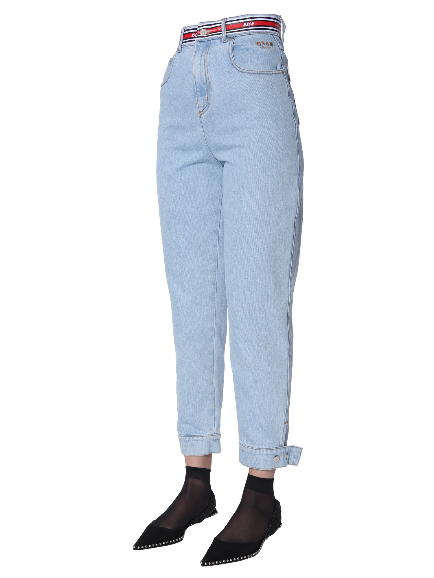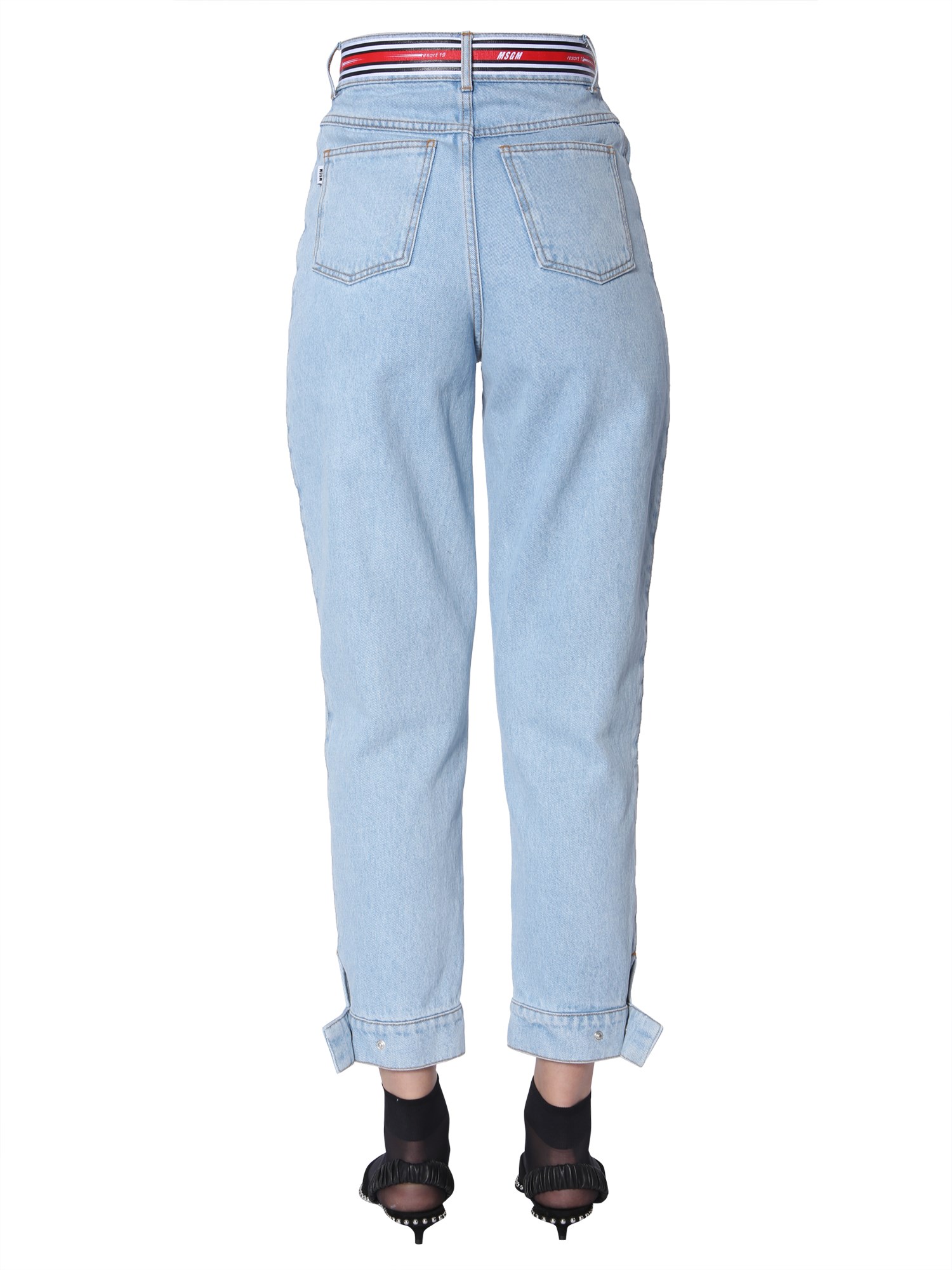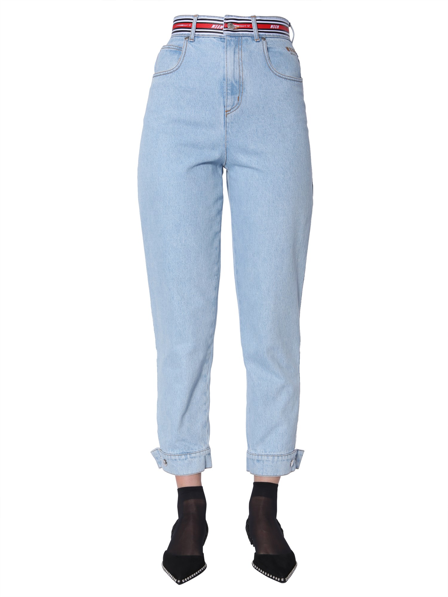Make a unique style statement with this high waist jeans with a logo band, making it perfect for a casual outing. It comes with a hidden zip, button closure and adjustable bottom with press buttons. It is made of 100% cotton and has 5 pockets that give ample storage for essentials.