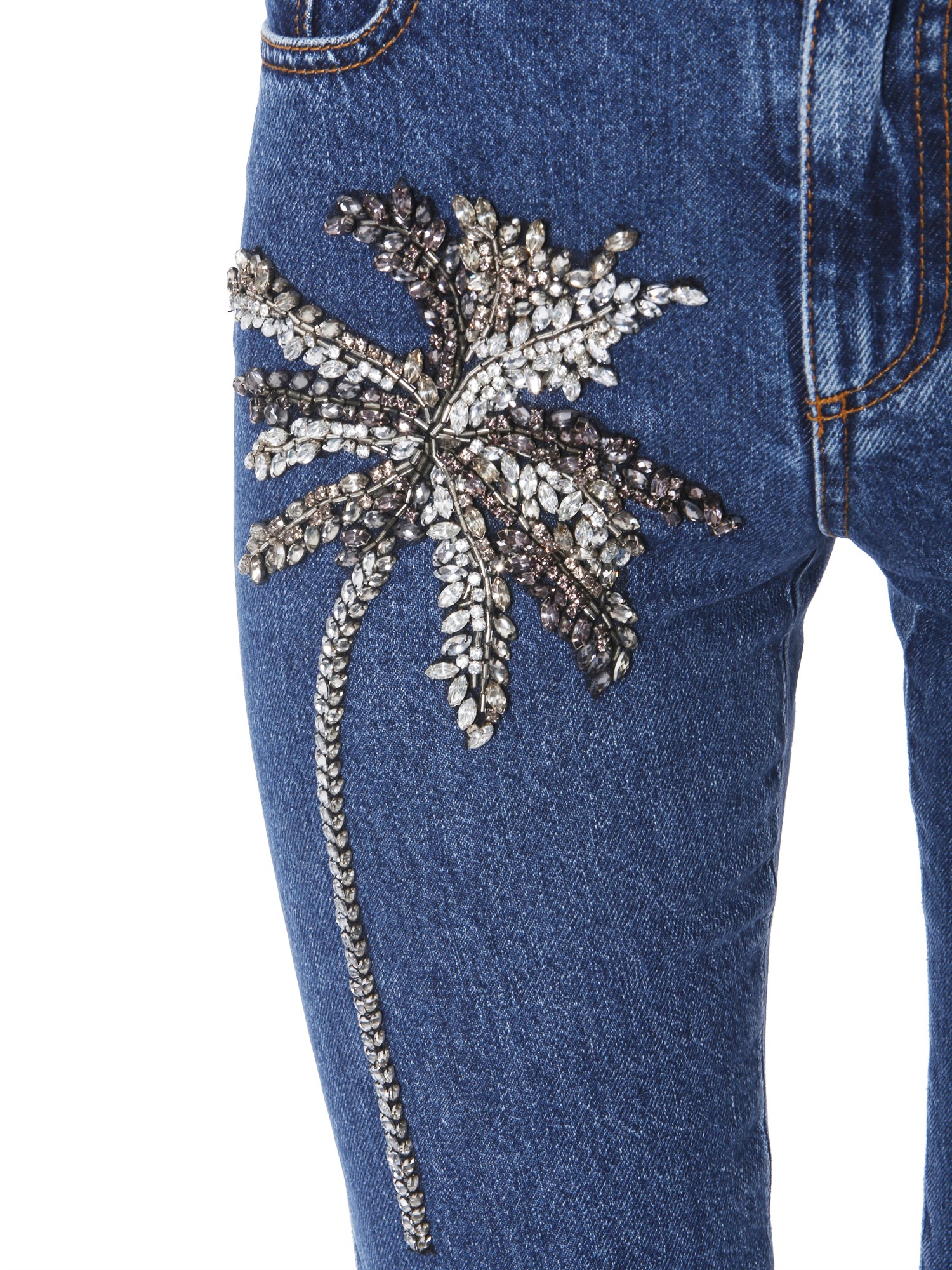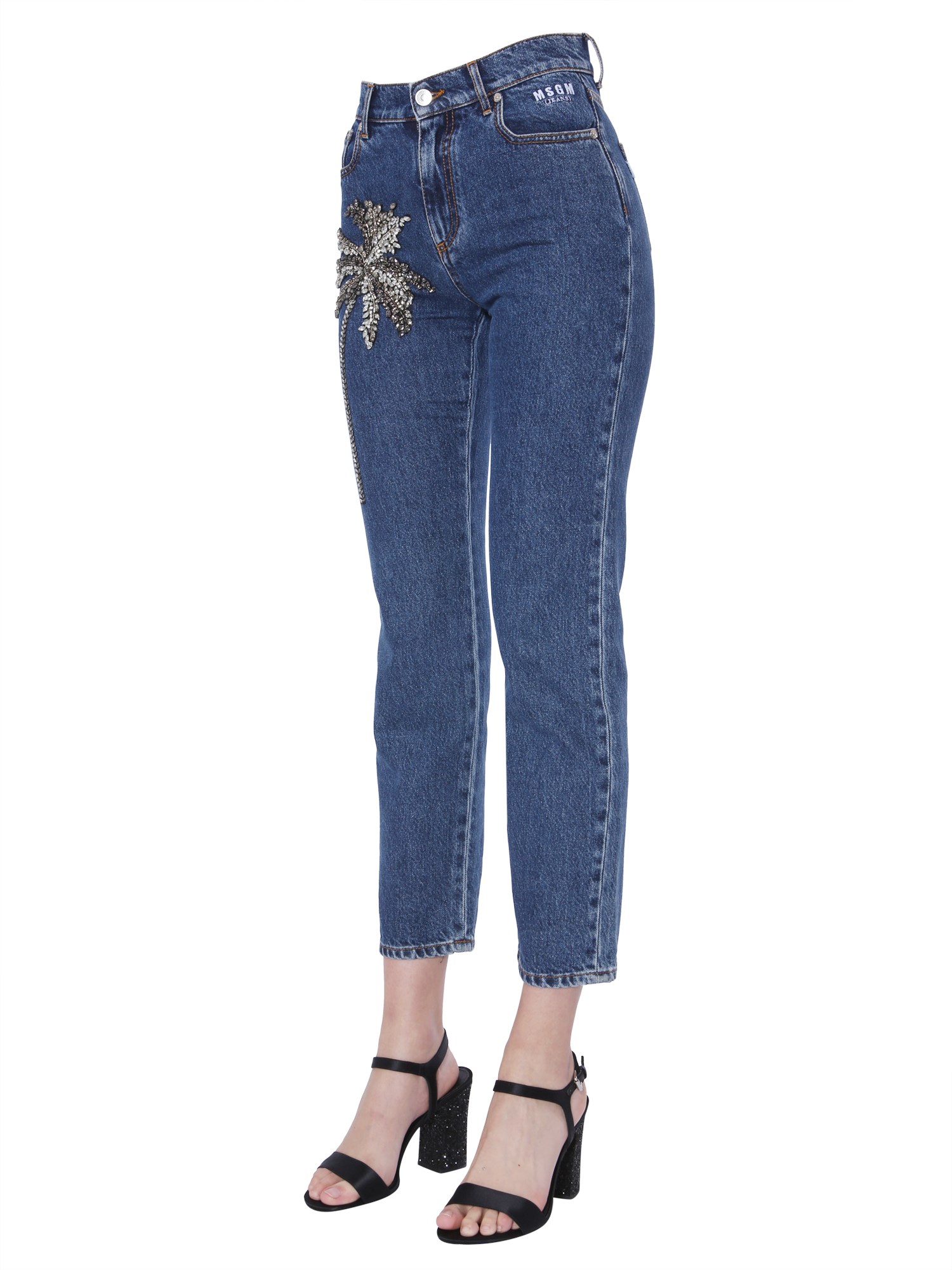 Flaunt a high-end outfit with this high waisted jeans from MSGM that features a palm tree embroidery that looks chic and stylish. The concealed zip and button closure enables a seamless fastening. Because of its high waist, the jeans can be teamed up with a crop top and a pair of heels. The five pockets lets you carry essentials on the go.