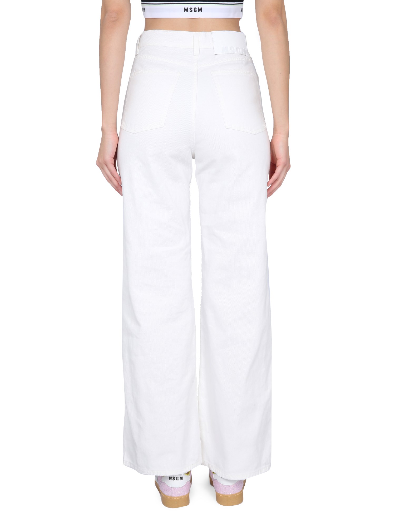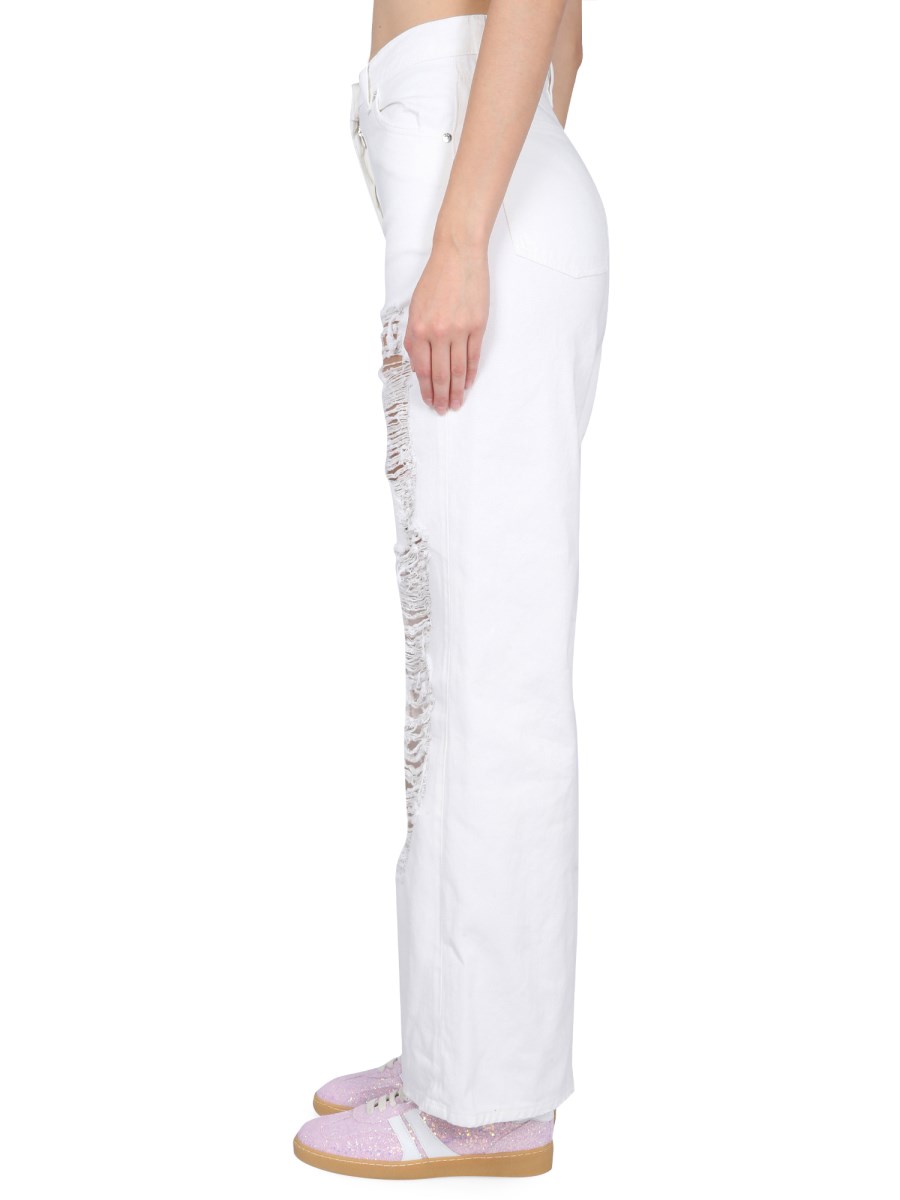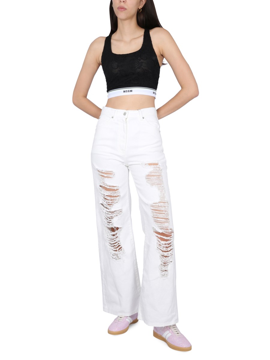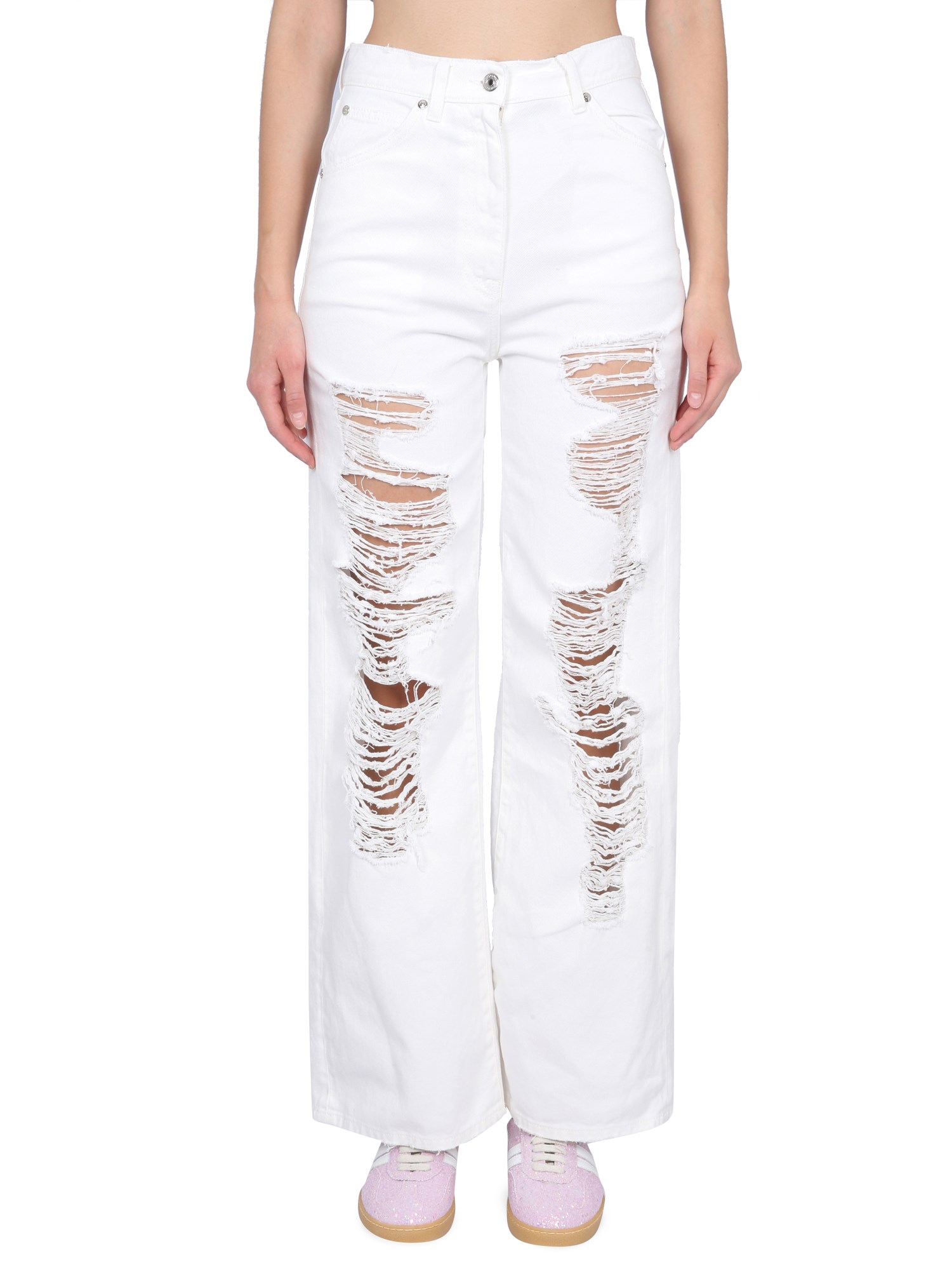 The ripped jeans from MSGM are a casual and trendy pair of jeans that are perfect for a day at the beach or a night out with friends. These jeans are a casual pair of jeans that have a ripped look, and come in a regular fit. The button and zipper closure is a classic look that keeps the jeans from being too bulky.