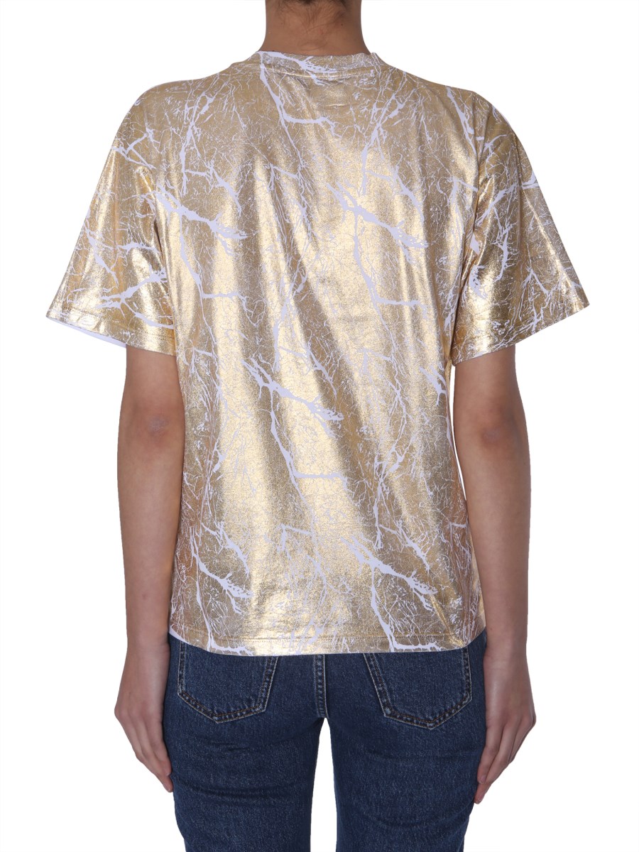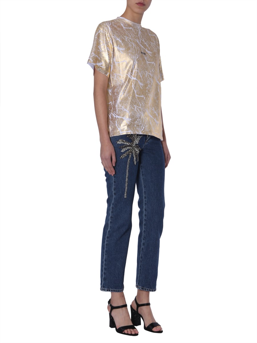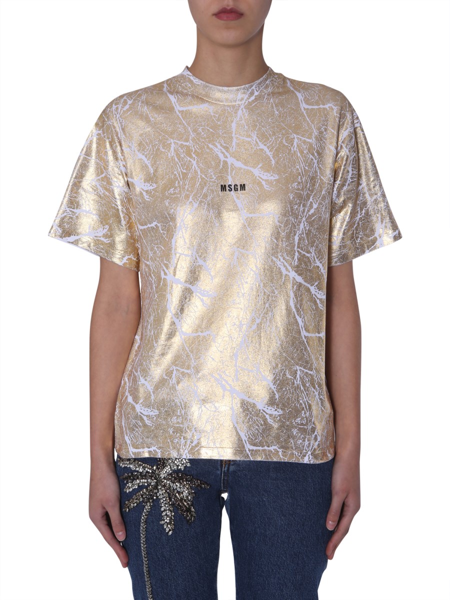 Earn appreciation with a minimal yet stylish look featured by a short sleeved t-shirt from MSGM. The laminated print and micro logo on the shirt gives it a shimmery touch. Its oversize fit allows you to pair it with a short skirt and heels. The simple t-shirt design looks minimal whereas the shiny texture looks edgy. The shirt is made using 98% cotton, 2% polyurethane and feels soft against your skin.