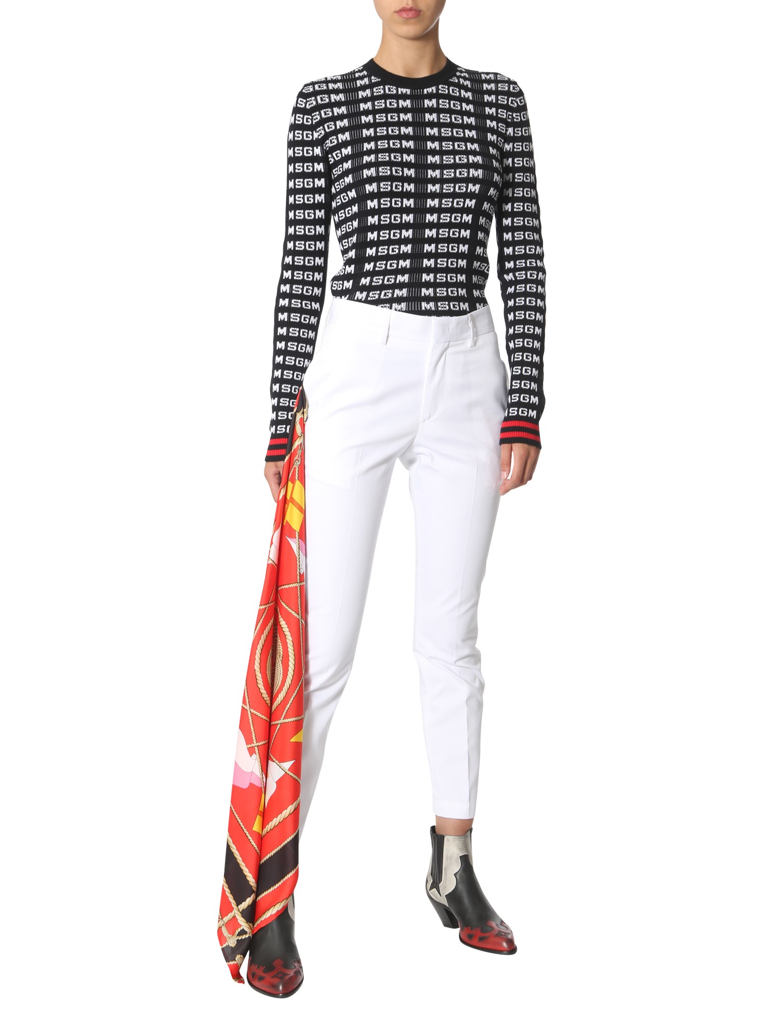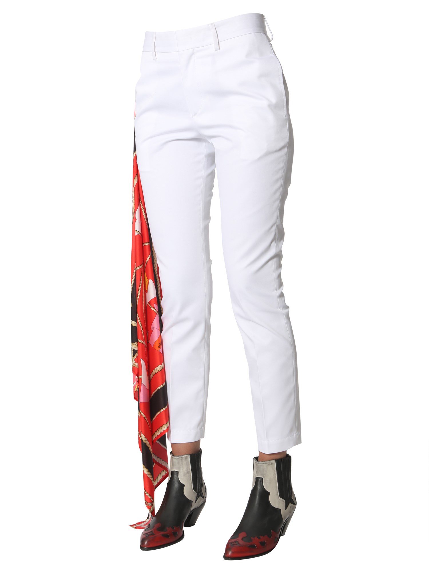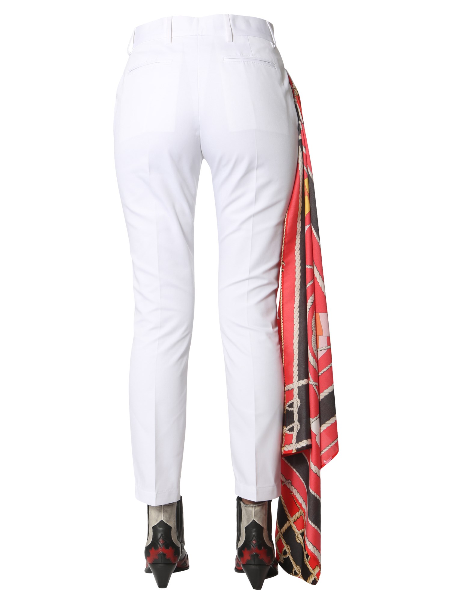 Create an unusual style statement with these pants with scarf detail from MSGM. They are made from a blend of polyester and cotton to ensure breathability and stretchability. The plain front panel is adorned with a colourful scarf detailing that enhances their style quotient. The hidden zip and button closure provide a comfortable fit throughout the day.