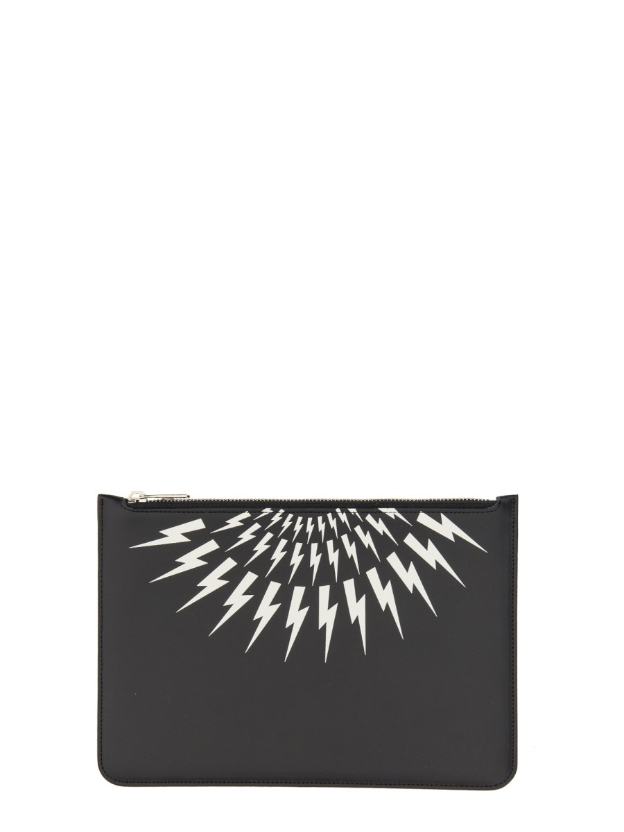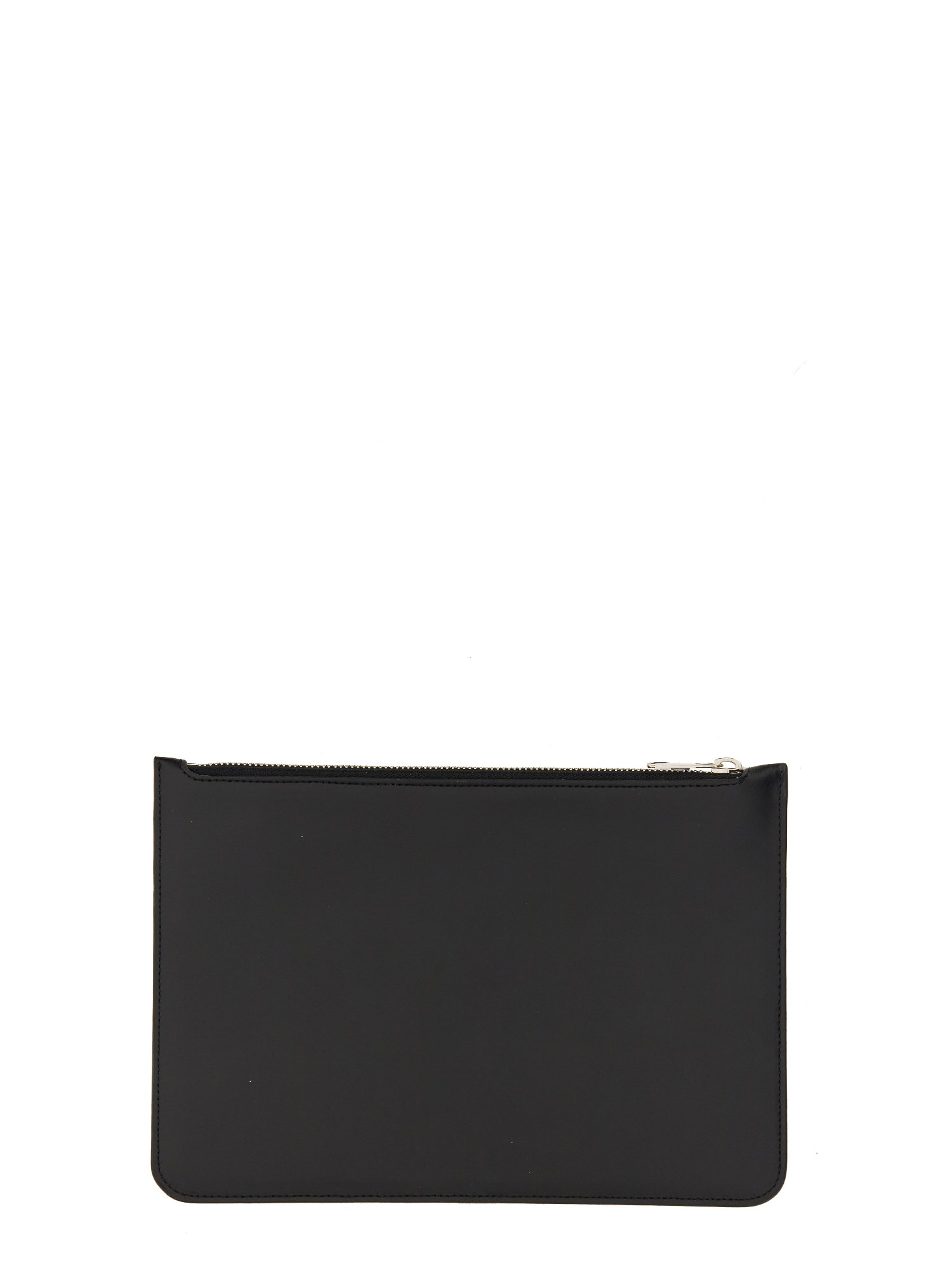 This zipper closure clutch from Neil Barrett is made of 100% leather and features a leather band with leather-covered zipper closure. It has a center main pocket and measures 18 cm x 26 cm. The interior lining is made of a soft textile material. This sleek, soft-touch, black leather clutch has a zipper closure and a fold-over flap.