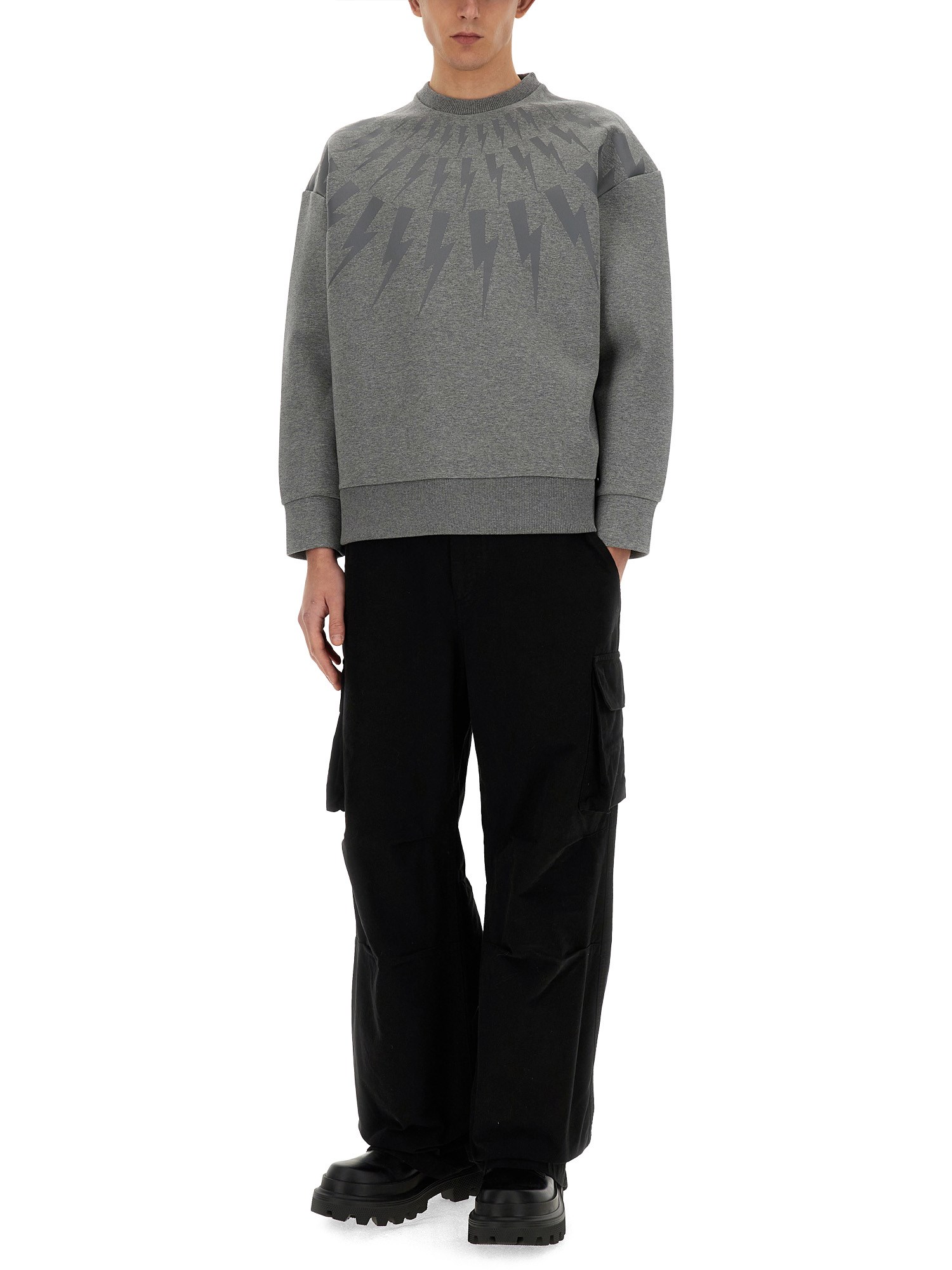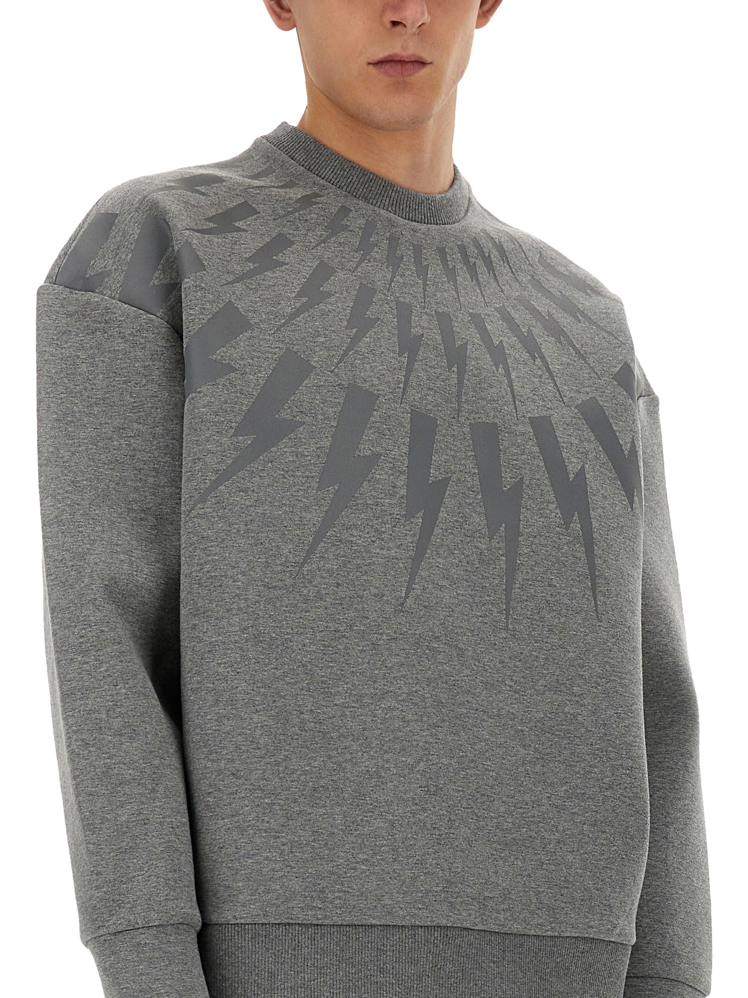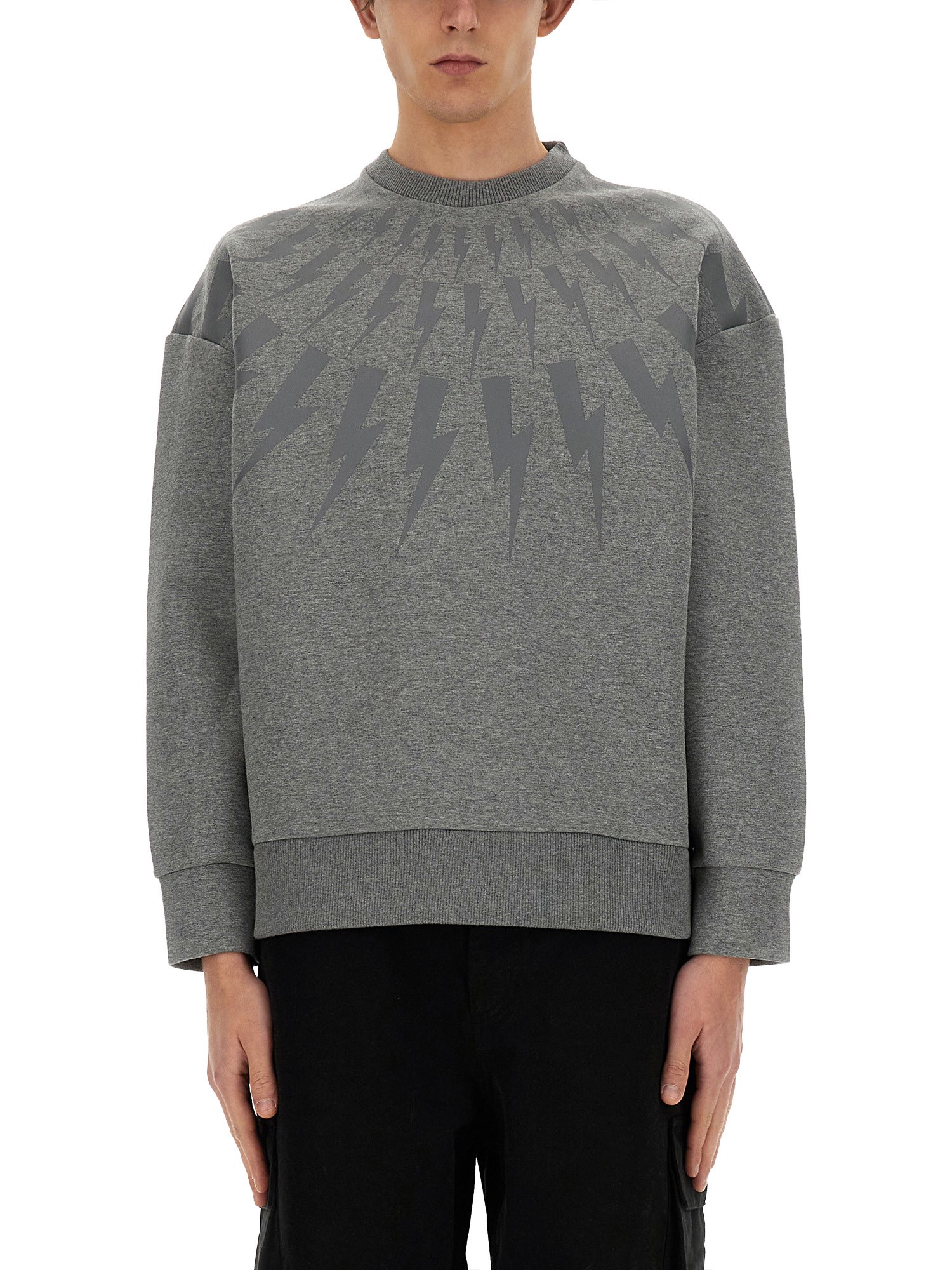 Introducing the Thunderbolt Print Crew Neck Grey Sweatshirt from Neil Barrett, a stylish and versatile addition to your wardrobe. Crafted with meticulous attention to detail, this sweatshirt features a classic crew neck design and is made from high-quality materials for ultimate comfort. The standout feature of this sweatshirt is the striking thunderbolt print, adding a touch of edginess to your outfit. The grey colour adds a modern and sophisticated touch, making it easy to pair with any ensemble.