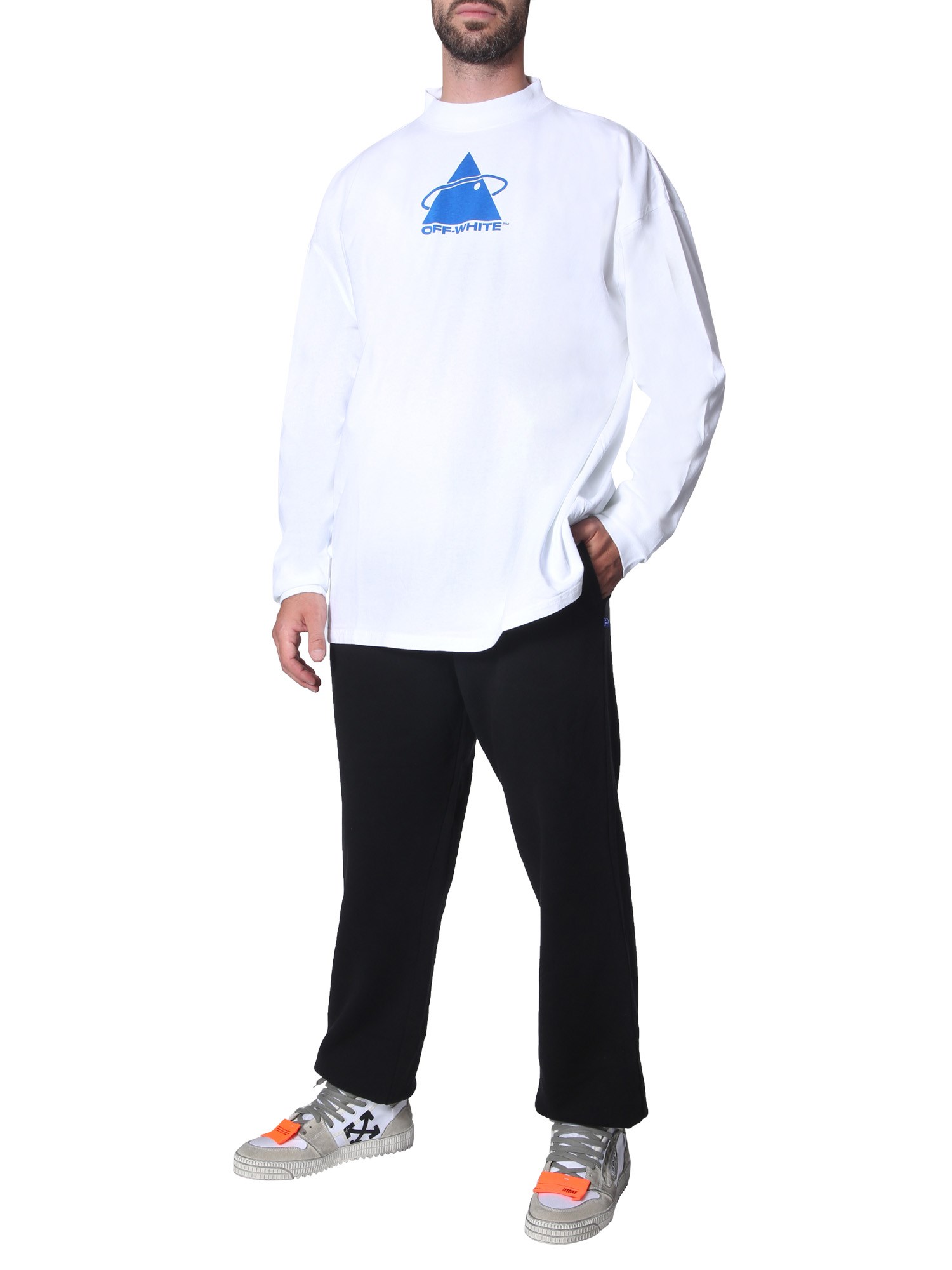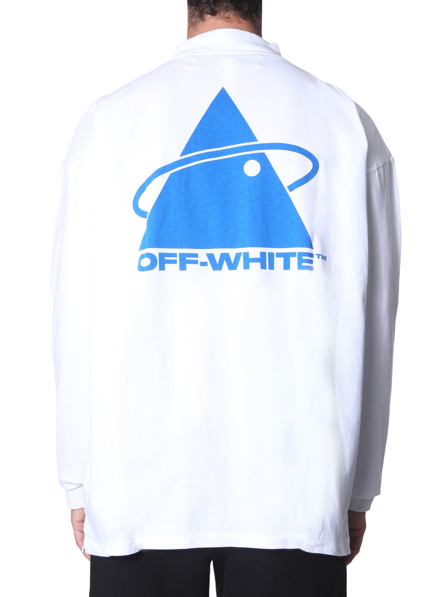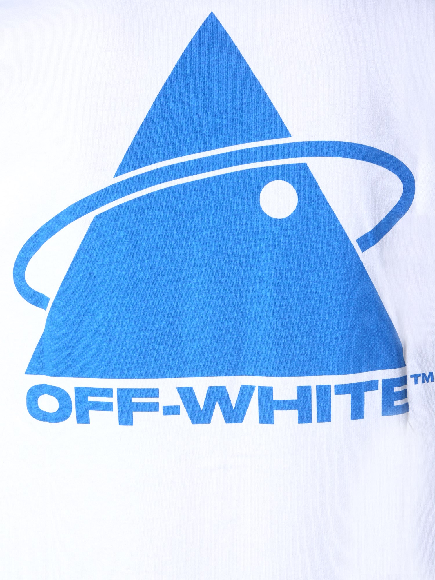 Showing its name, the brand Off-White brings you a comfortable and fashionable option with this cotton T-shirt. It has oversized fit presenting a round neck and relaxed shoulders. Its look is enhanced with a ‘Triangle Planet’ print at the front. You can complete a cool and comfy outfit with a pair of loose-fit trousers.