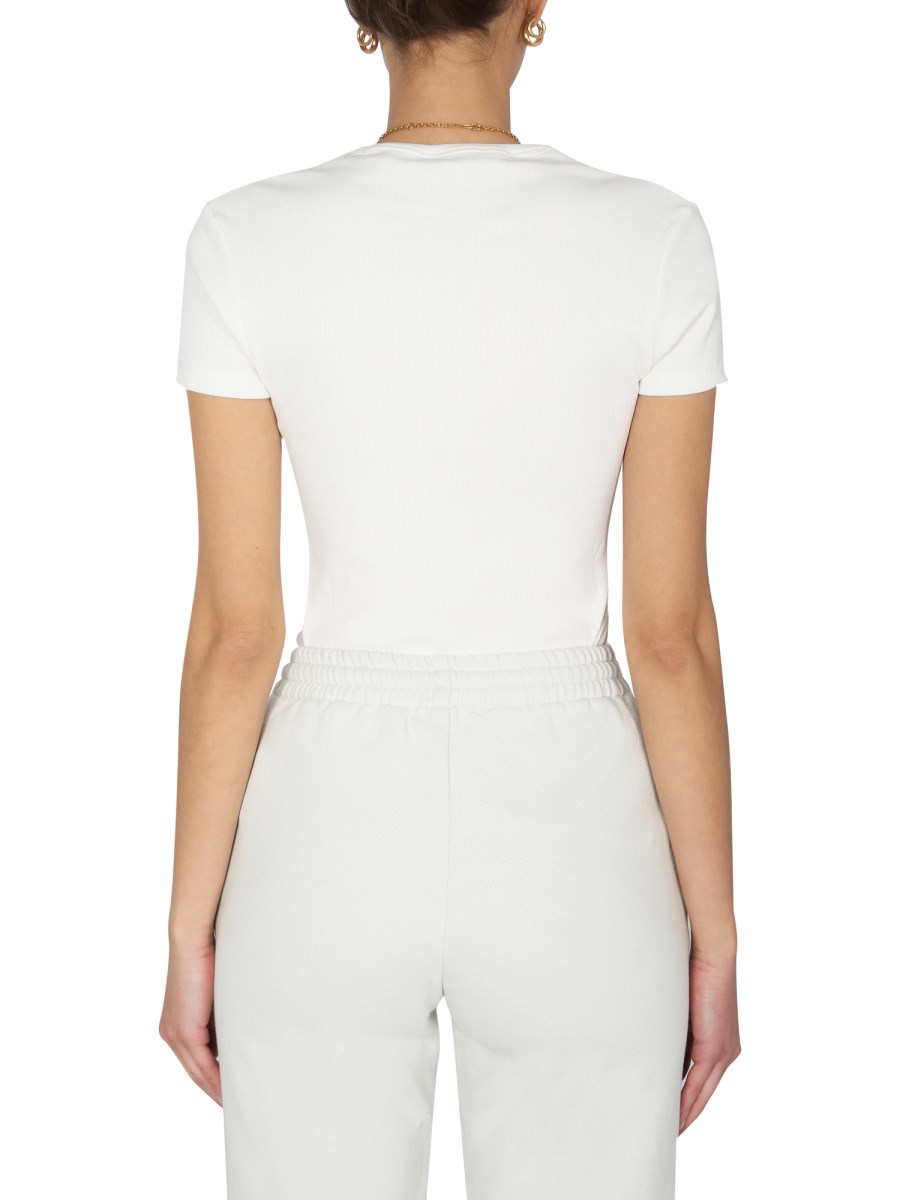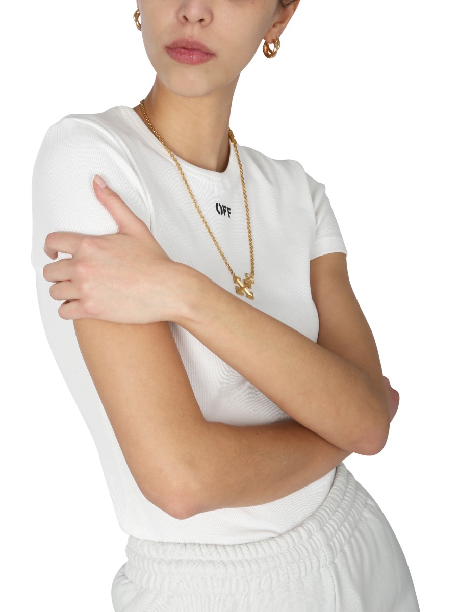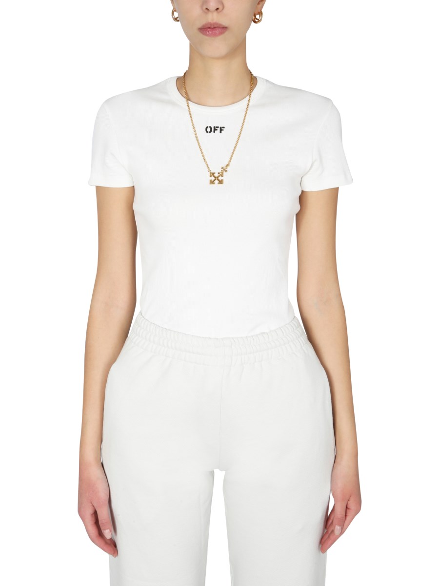 This logo T-shirt by Off-White is a versatile wardrobe staple. The cotton fabric is soft and breathable, and it's perfect for both casual and dressy occasions. The shirt is lightweight and can be worn with jeans or dressed up with a skirt and heels.
