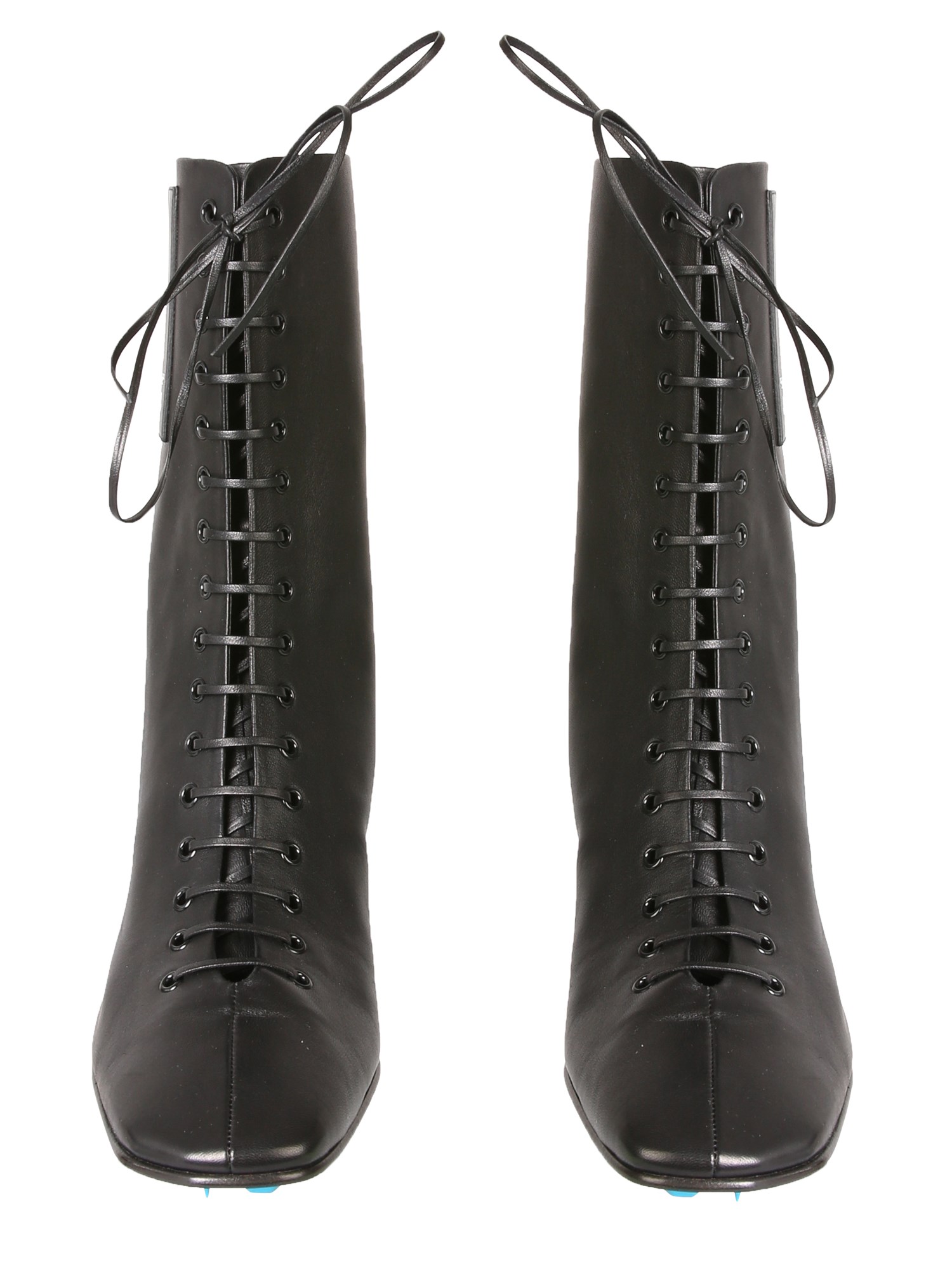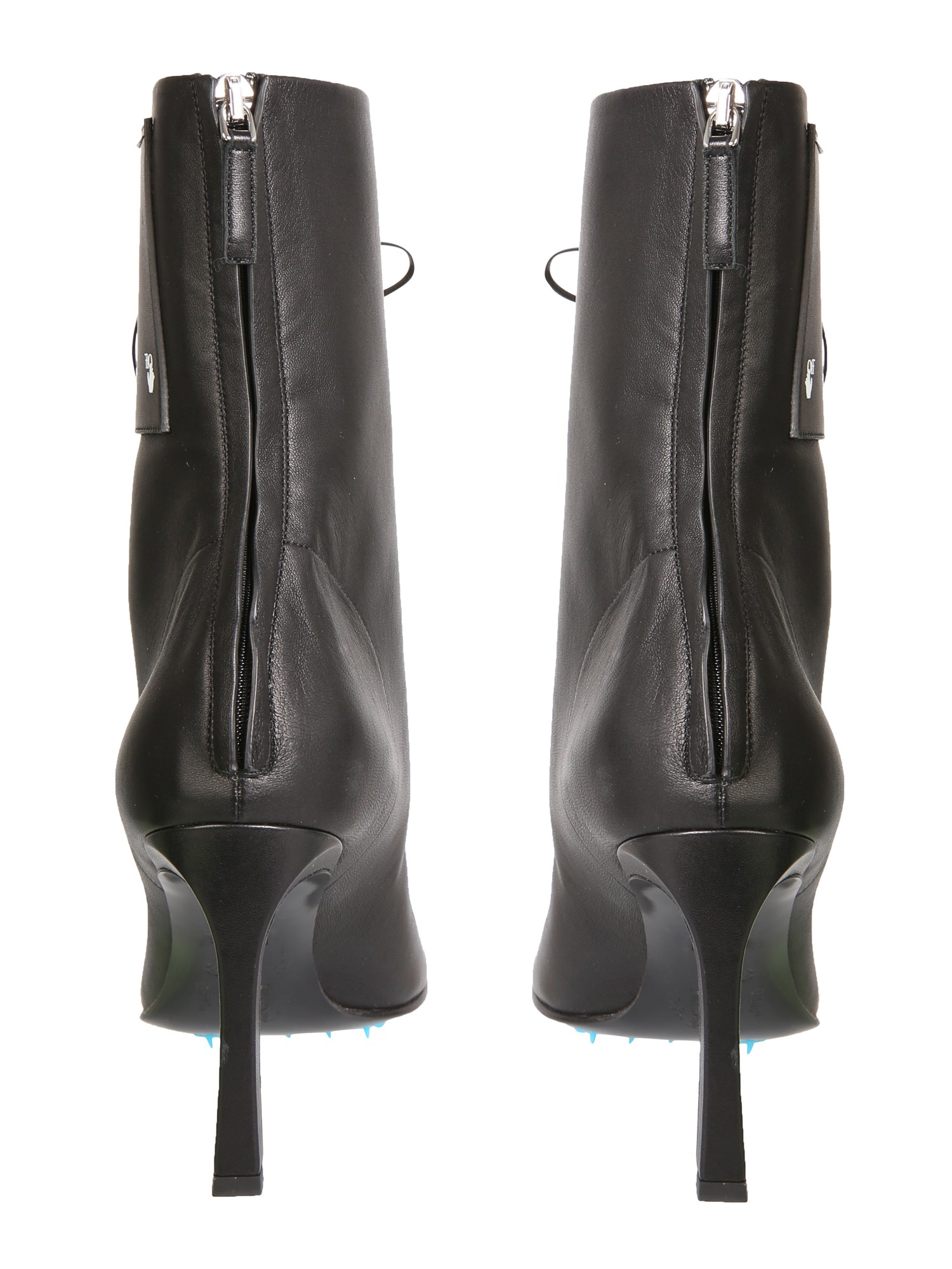 Make all eyes turn on you as you step into a party or a gathering wearing these stunning Boots with Laces brought to you by the fashion brand, Off-White. These high-heel ankle boots have a 10cm high heel with a sculpted rubber sole to provide you with a comfortable fit. It has a sleek flat lace and zip closure on the back and a round toe shape. These shoes are made with 100% leather and have the brand logo patch on the side.