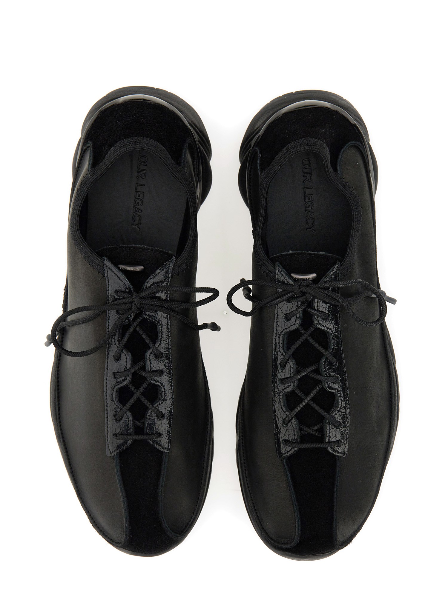 These flat lace closure black leather sneakers from Our Legacy are the perfect combination of style and comfort. Made from high-quality leather, they offer durability and a sleek look. The lace closure ensures a secure fit, while the flat sole provides excellent support for all-day wear. Whether you're heading to the office or going out for a casual outing, these sneakers will elevate your outfit and keep your feet feeling great.
