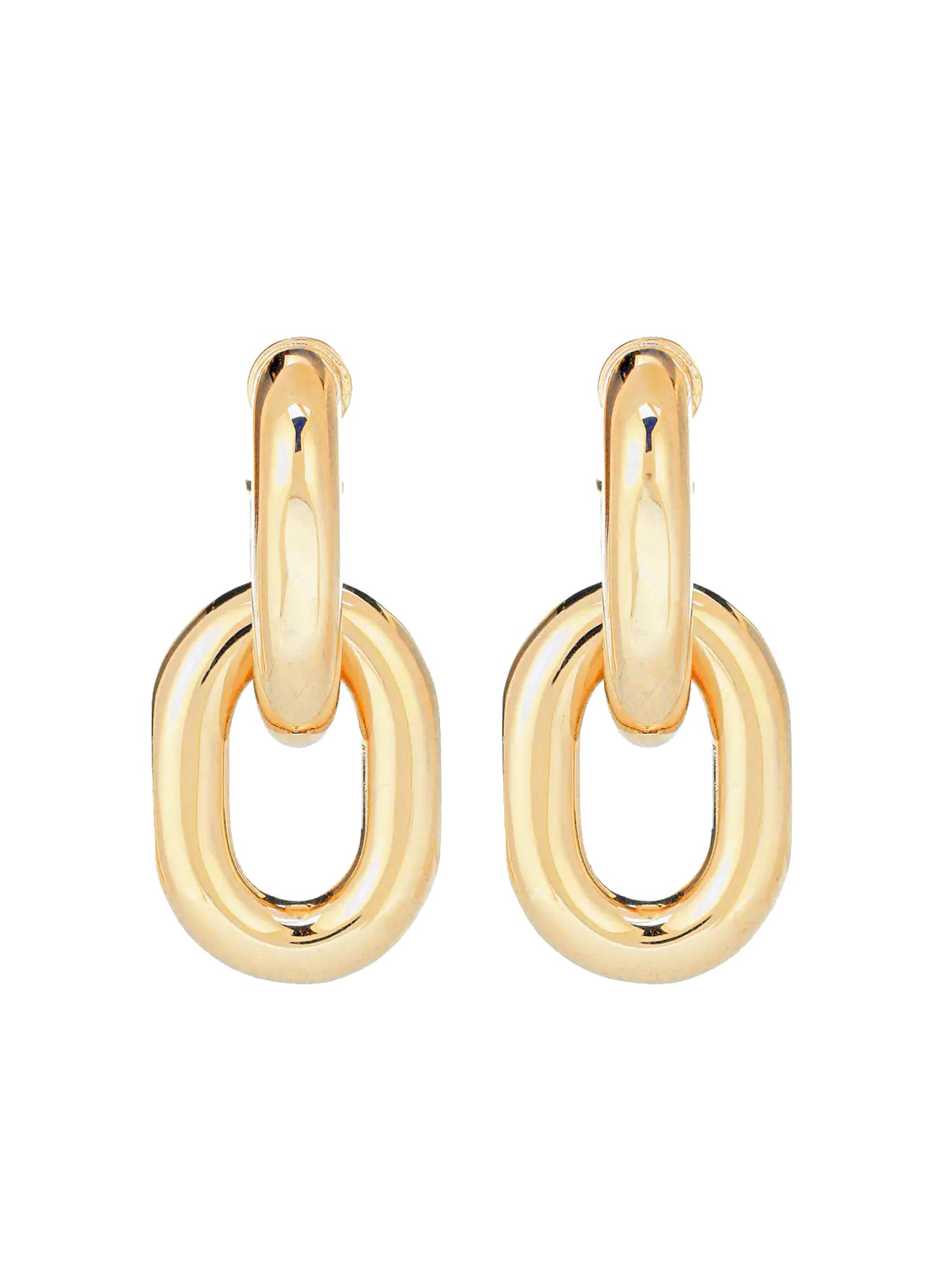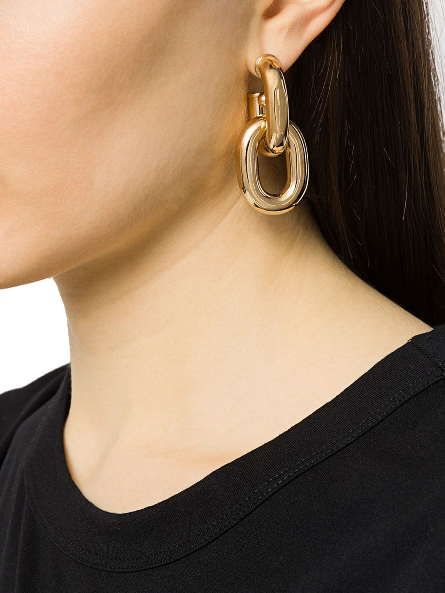 The earrings from Paco Rabanne are a classic style that is sure to look good with anything. The gold finish brass hoop earrings are a pair of beautiful hoops with interlocking links. They are the perfect size for all day wear and can be worn with a variety of outfits. They are a light and comfortable hoop earring that is ideal for everyday wear.