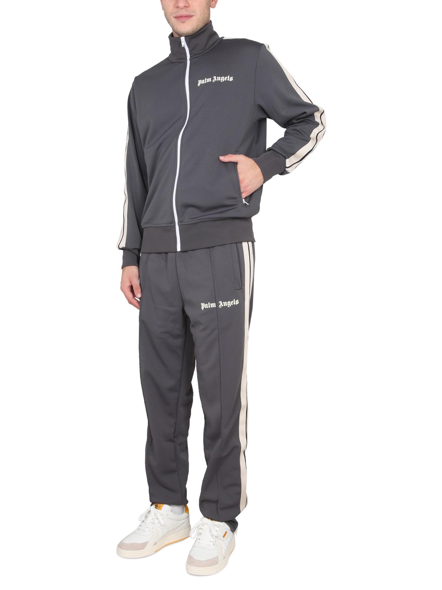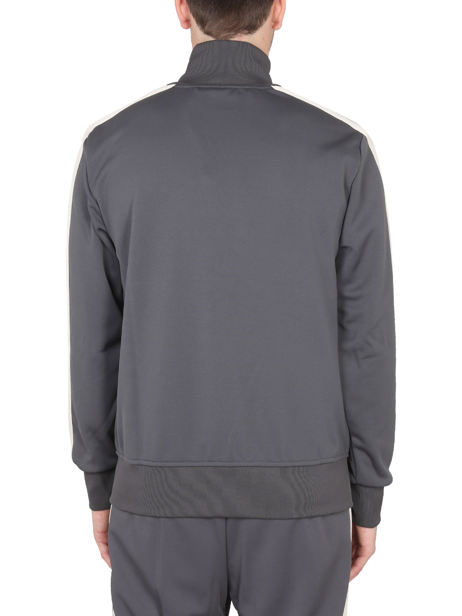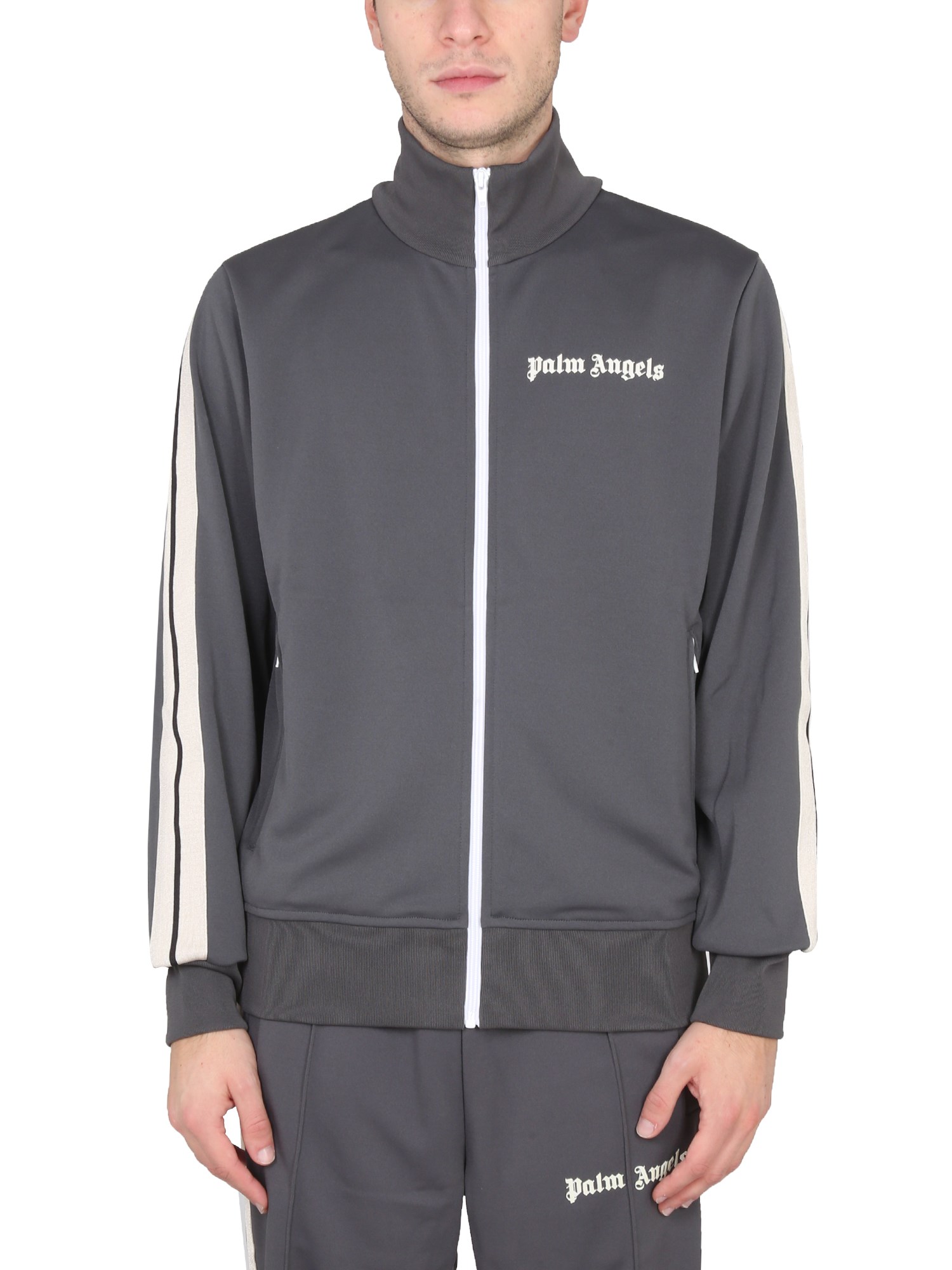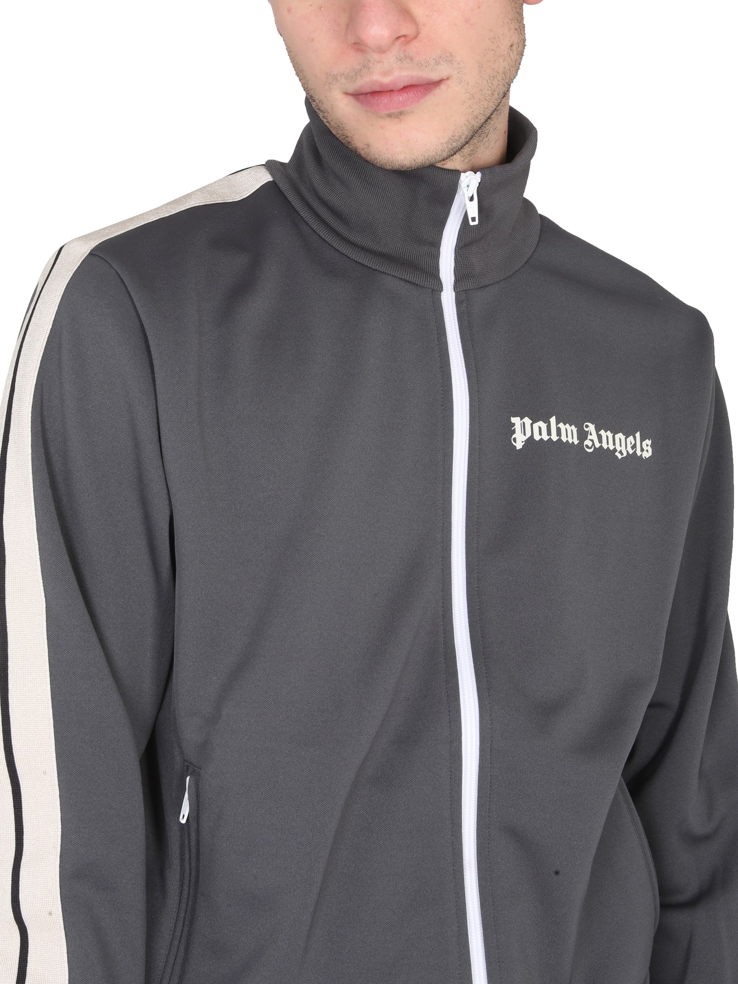 The "classic" jacket from Palm Angels is a high-neck zipper closure jacket with a slim, streamlined design. This coat features contrasting stitching, a contrasting lining, and contrasting details, such as the zipper and buttons. It's a cool, casual jacket perfect for the fall and winter seasons.