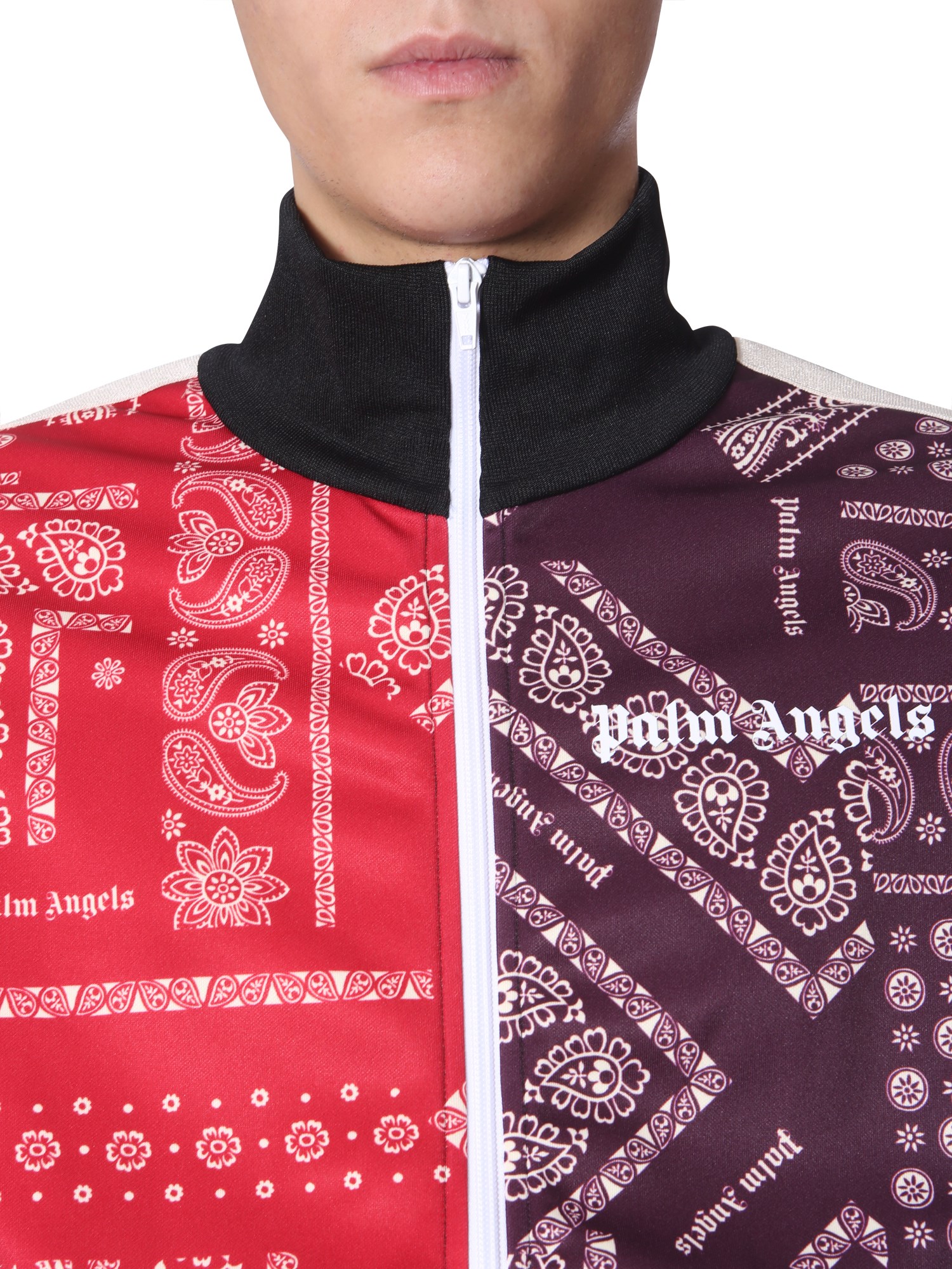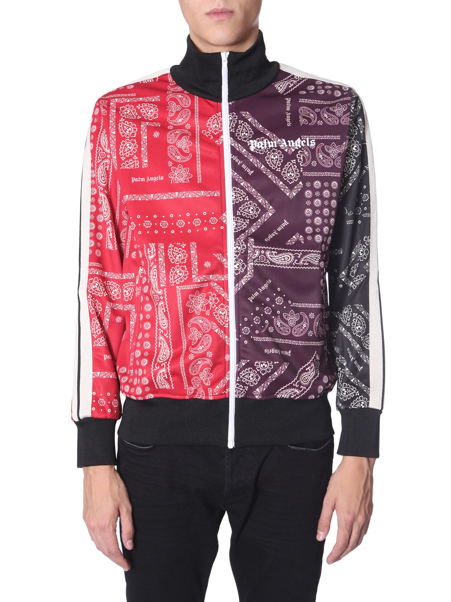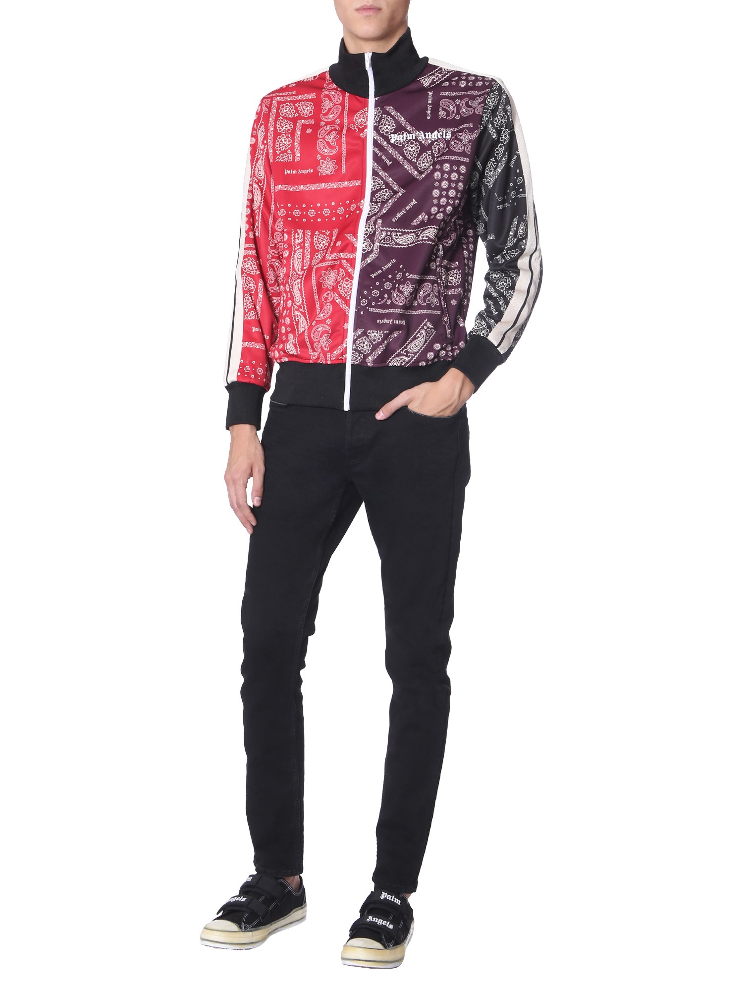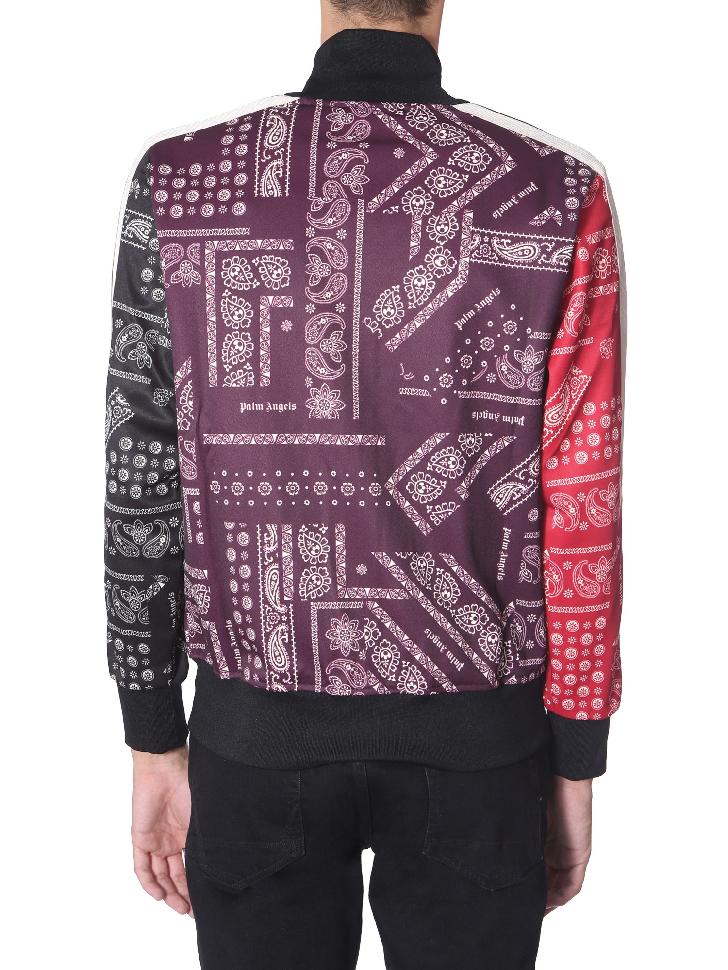 Look cute wearing this elegantly designed Bandana fleece track jacket from Palm Angels. It has a unique print in dual shade with a clean zip at the front. The sleeves are adorned with contrasting bands on the sides and are elasticated at cuffs for complete protection on cold and windy days.
