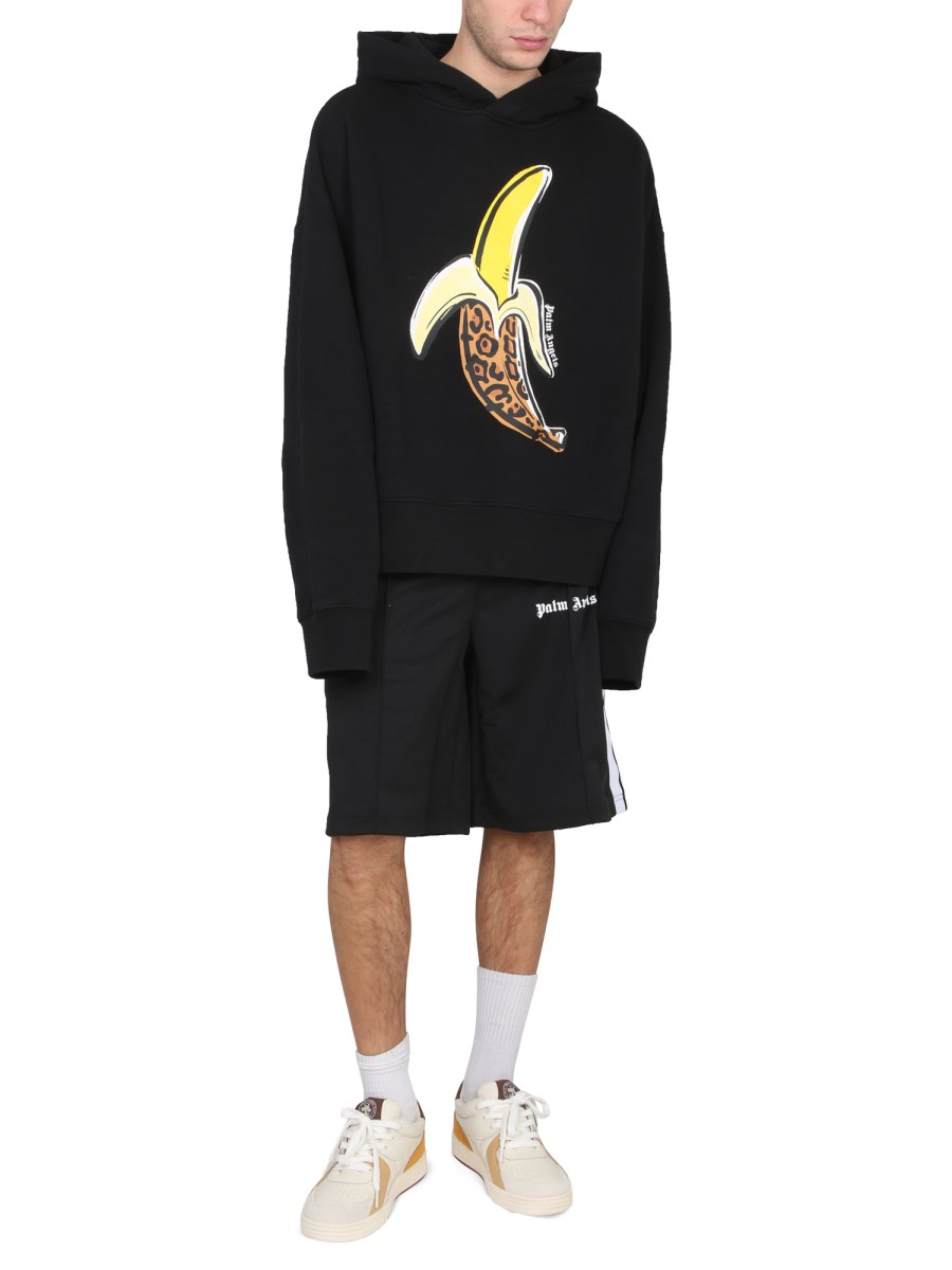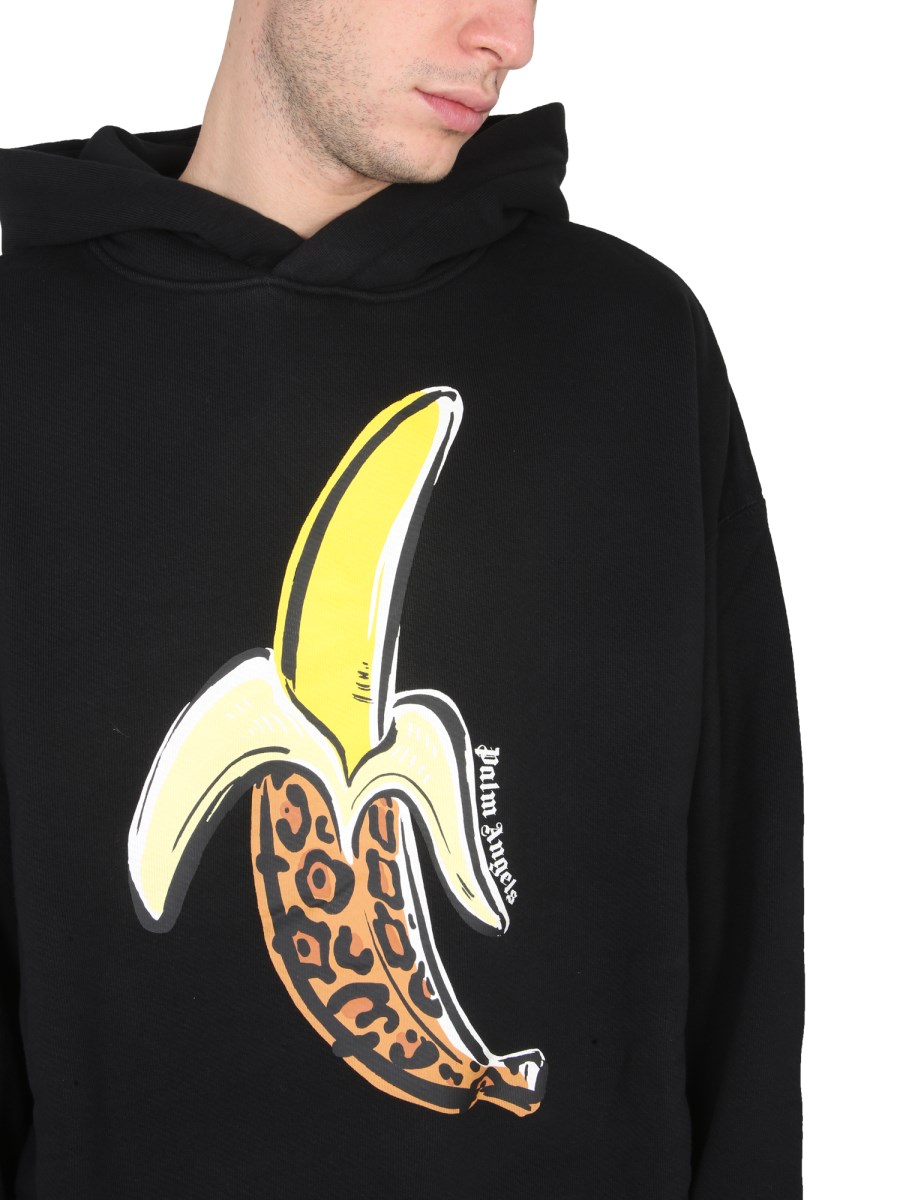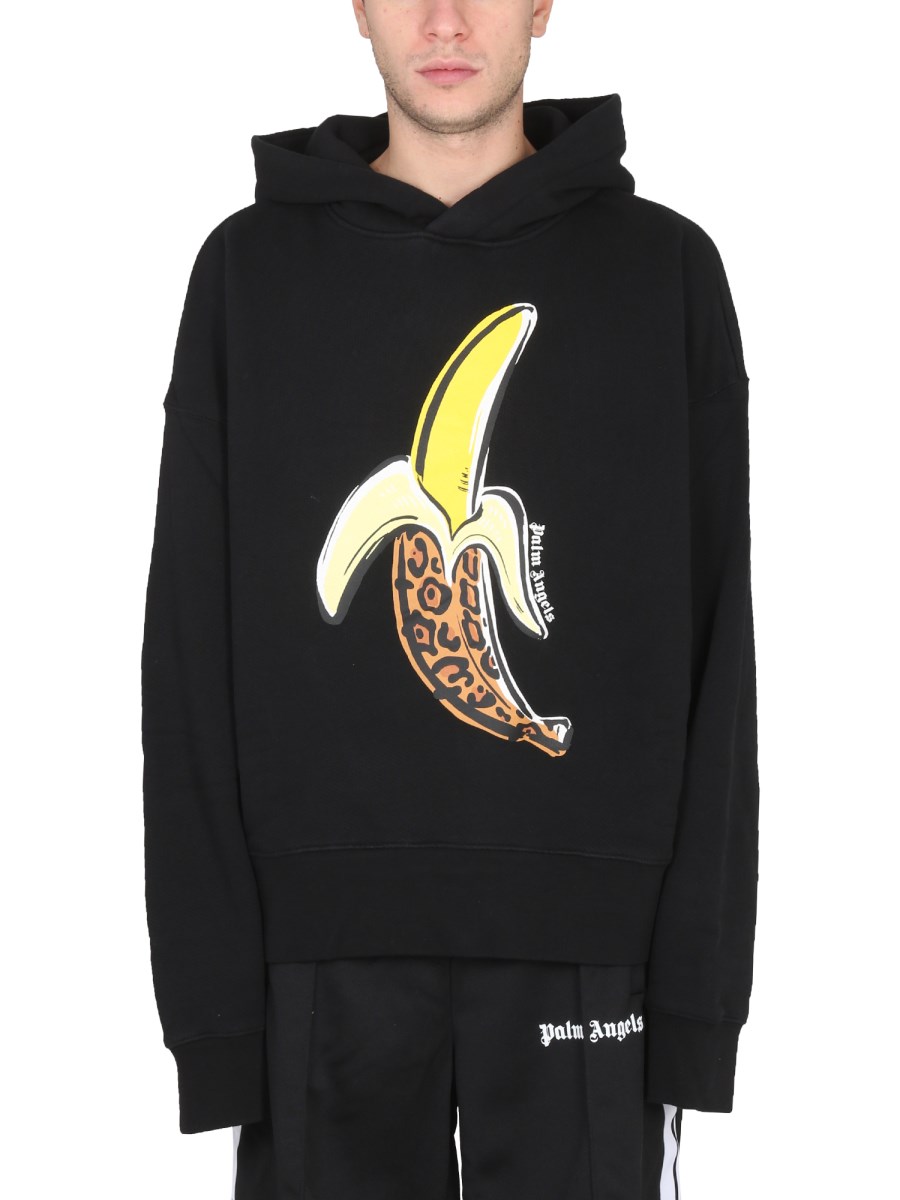 This Palm Angels Hoodie is perfect for the season, with a fun banana print that makes it stand out. The large hood and drawstring provide an extra layer of protection from the cold, and the long sleeves and loose fit make it perfect for layering. The banana print is a nice contrast to the black.
