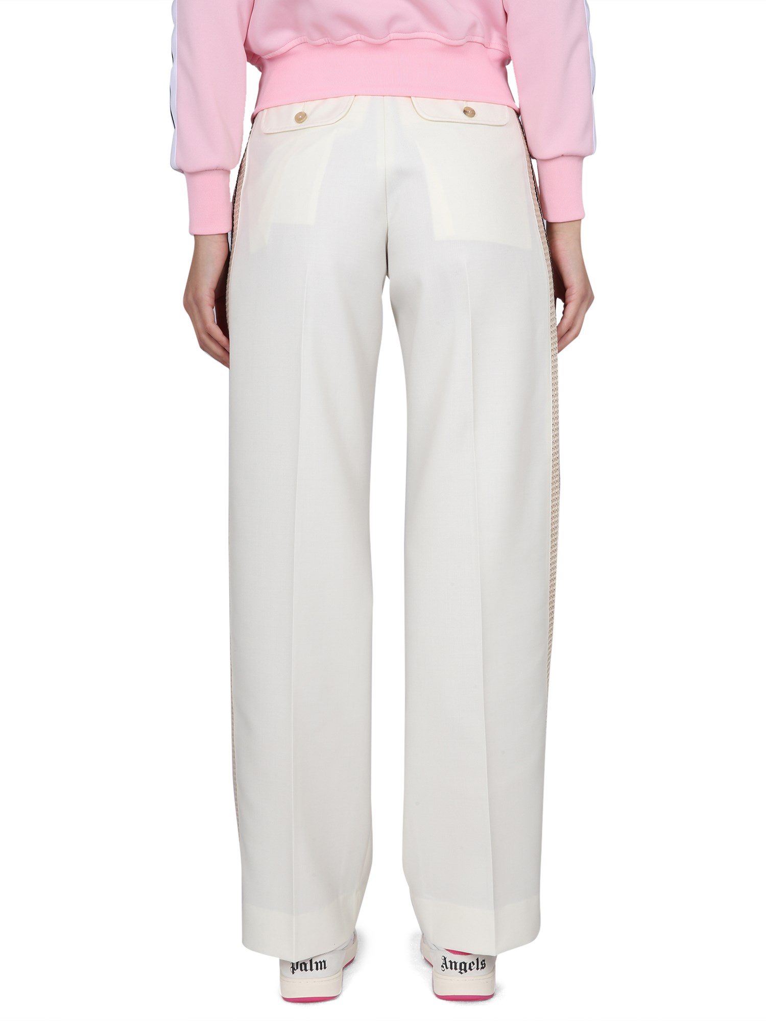 These casual pants from Palm Angels made from 100% virgin wool that is soft and breathable. They have a button-closure at the waist, two side pockets, two back pockets, and a side band that has a nice texture. The pants are lined with a soft polyester fabric and are made from virgin wool, which is a durable and warm material that is known for its soft and luxurious feel.