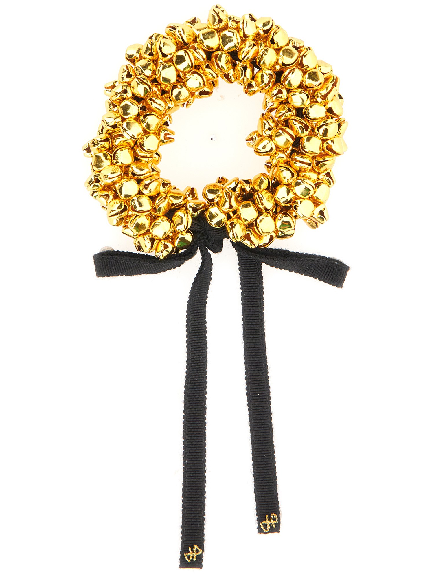 Gold-plated metal bracelet. Multiple bell embellishments. Grosgrain tie fastening with JP monogram detail.