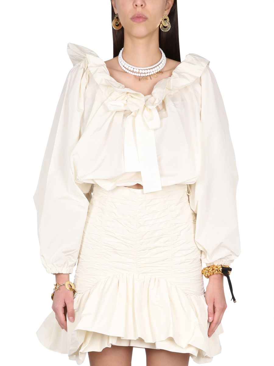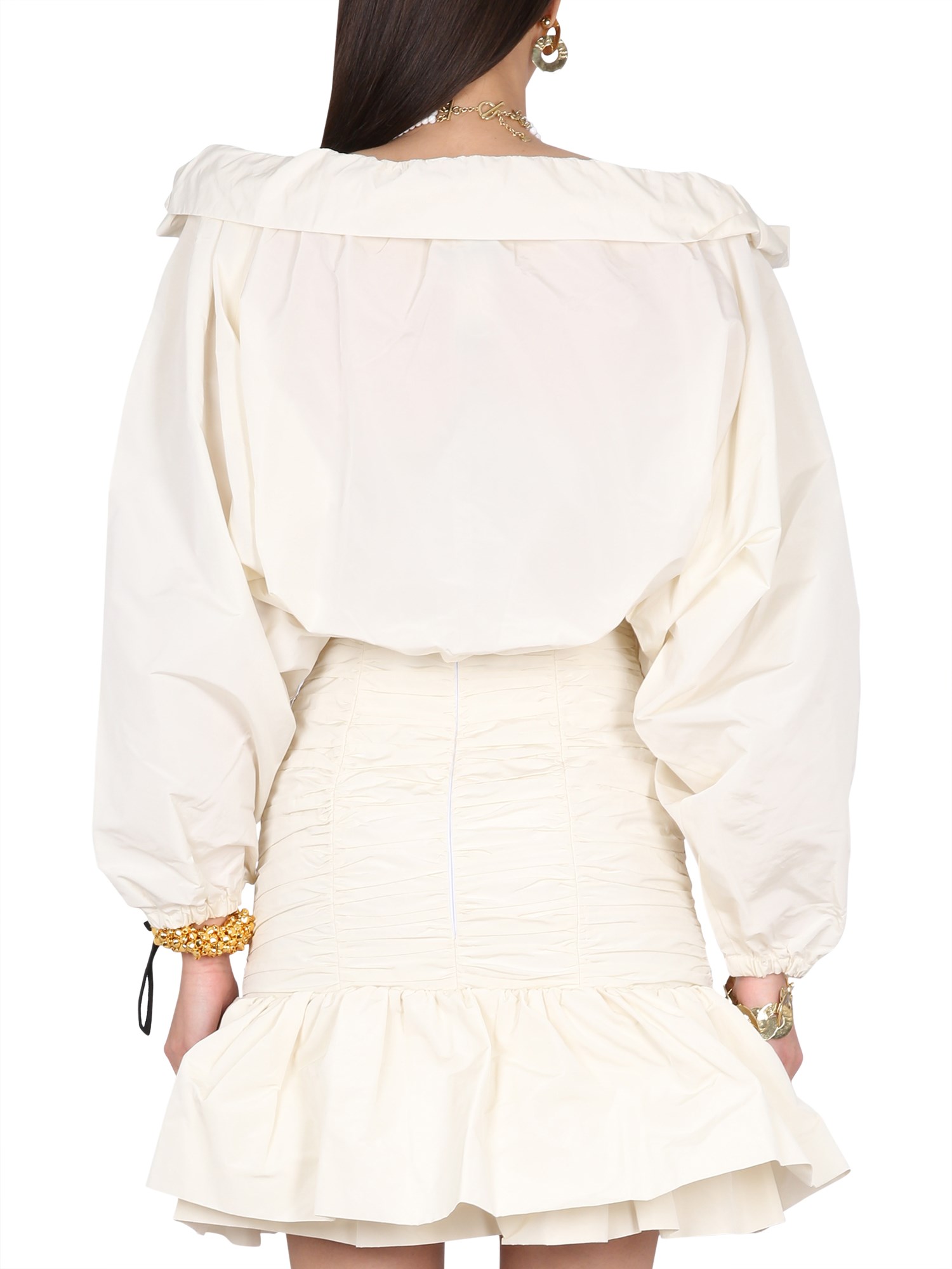 Ivory recycled faille top. High volume silhouette that can be worn knotted at the neck or off the shoulders. Drawstring collar with flounce at the front and long grosgrain ties. Batwing sleeves with elasticated cuffs. Elasticated waist.