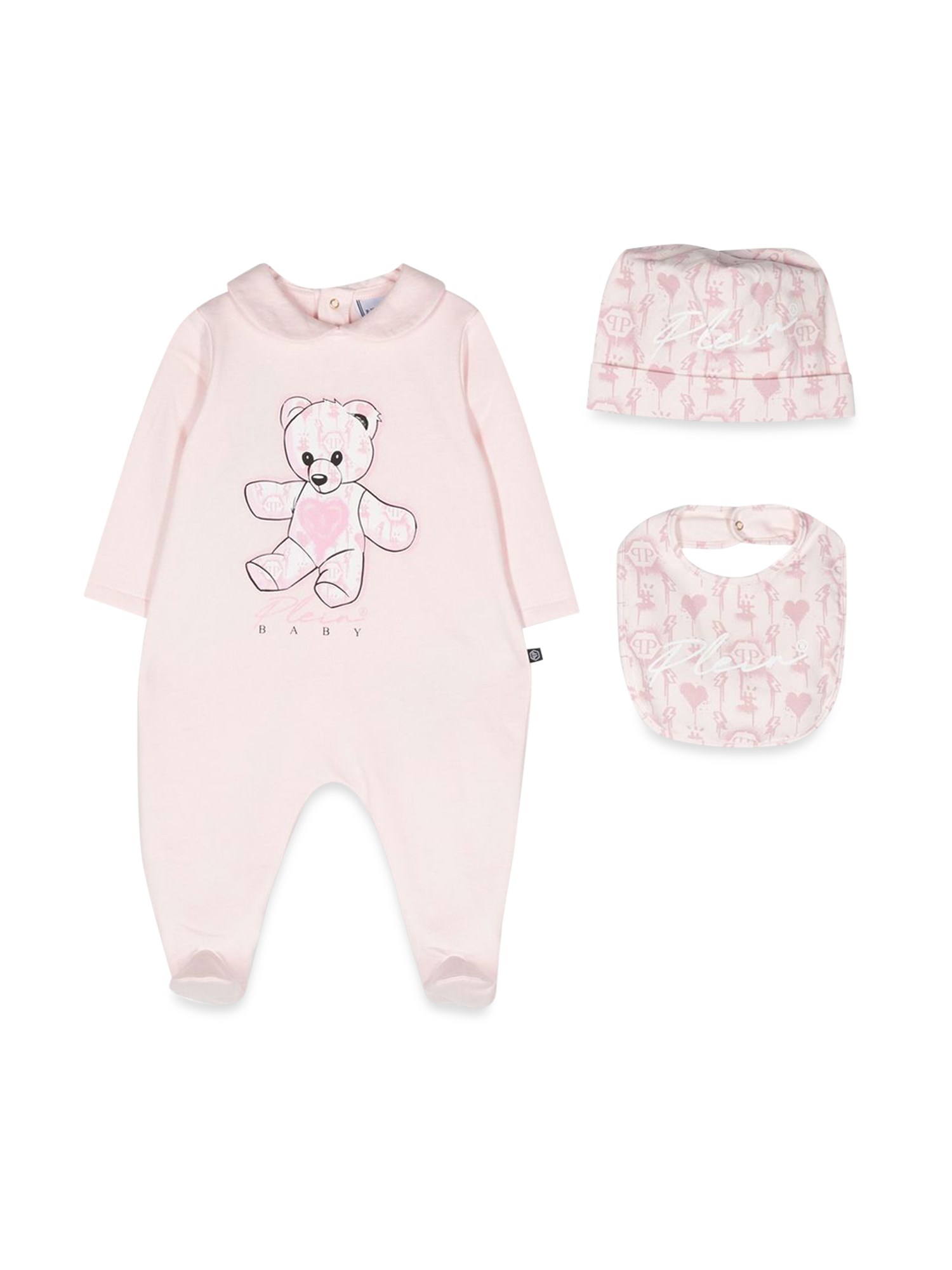 This adorable set from Philipp Plein includes a cotton romper, a bib, and a bonnet. The cotton romper has a pink trim with a button closure. The bib is a simple pink square with lace trim. This set is perfect for any baby or toddler! The cotton romper is a cute, comfy, and lightweight set that is perfect for the summer.