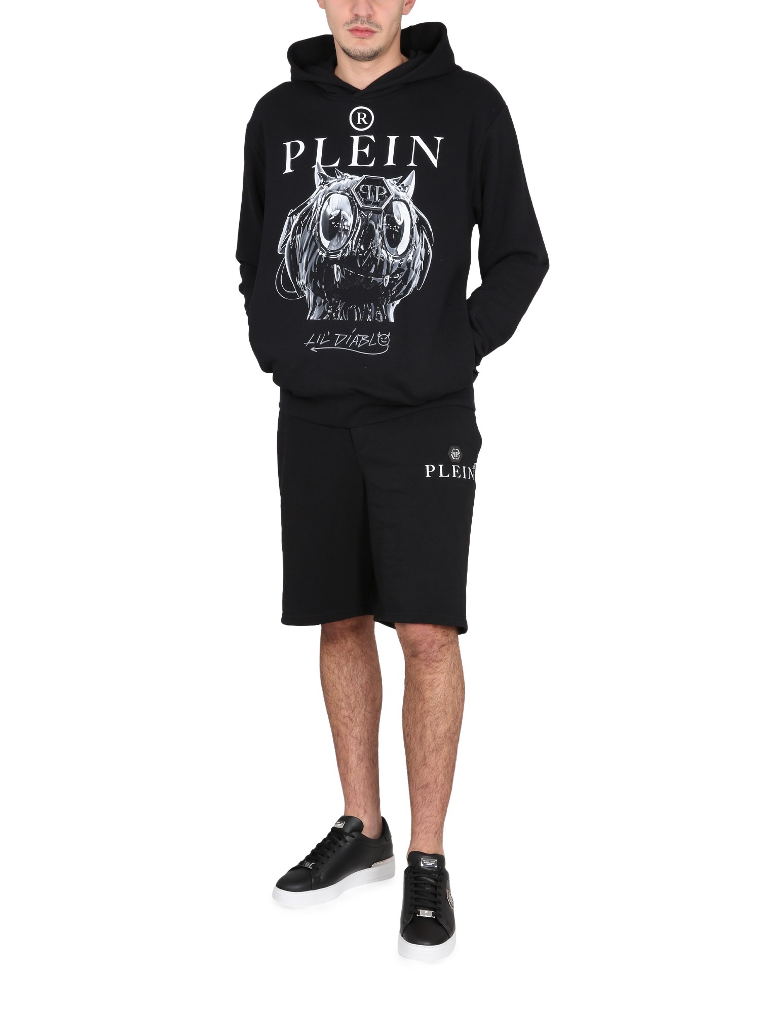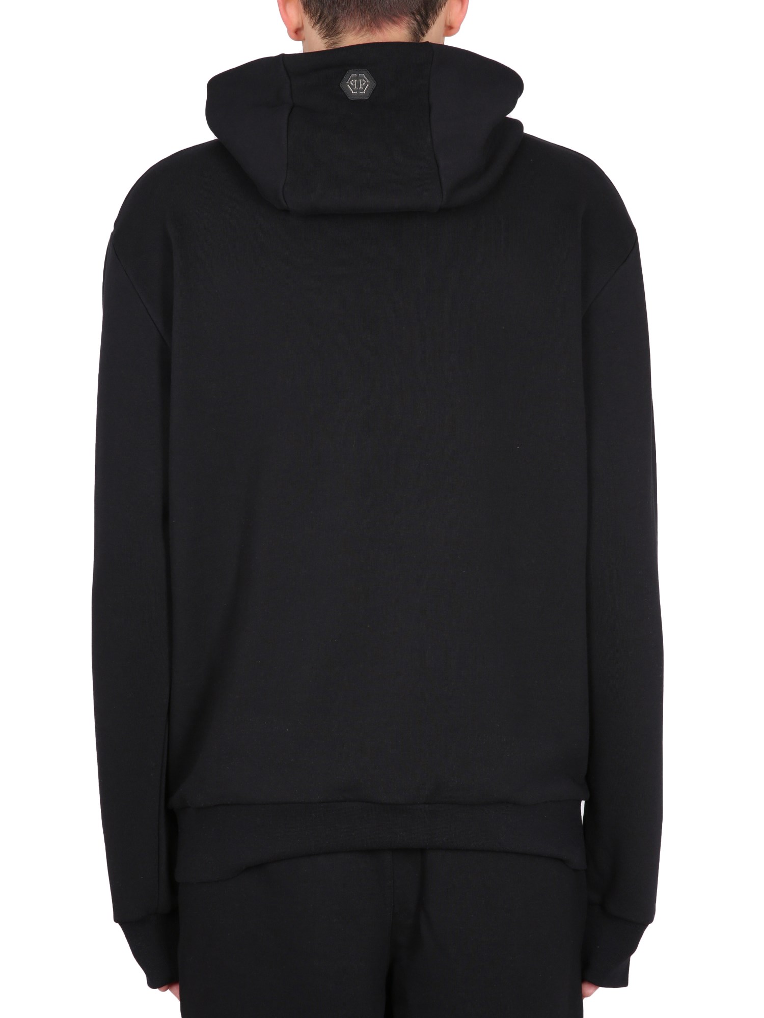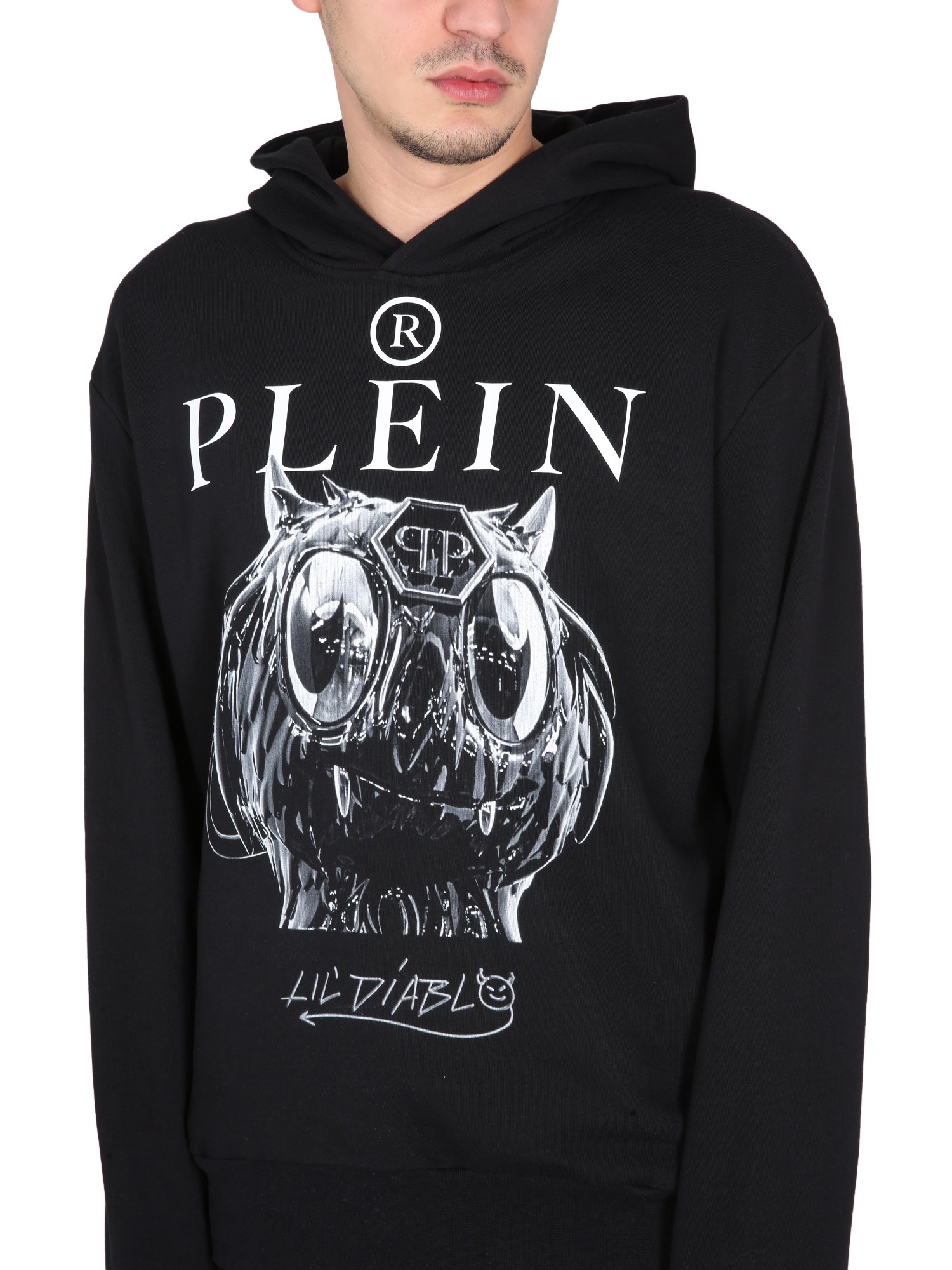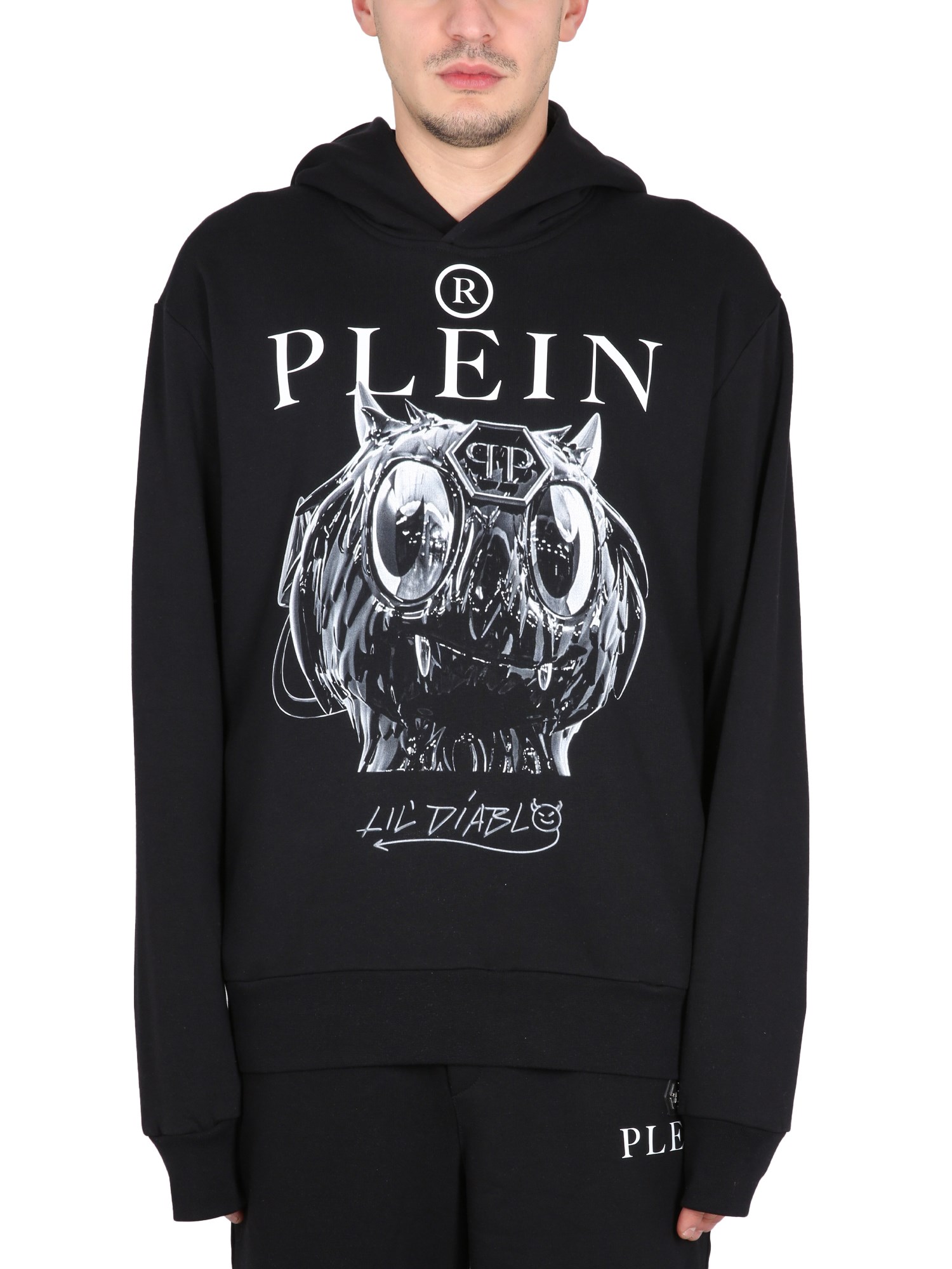 This hoodie from Philipp Plein is comfortable, lightweight, and is perfect for a casual day out. It has a hood with drawstrings and a pouch pocket on the front. The material is soft and stretchy, and it is black with a dark grey front print. A light weight, cosy, warm hoodie with a pretty black and white front print and a pocket to keep your hands warm.