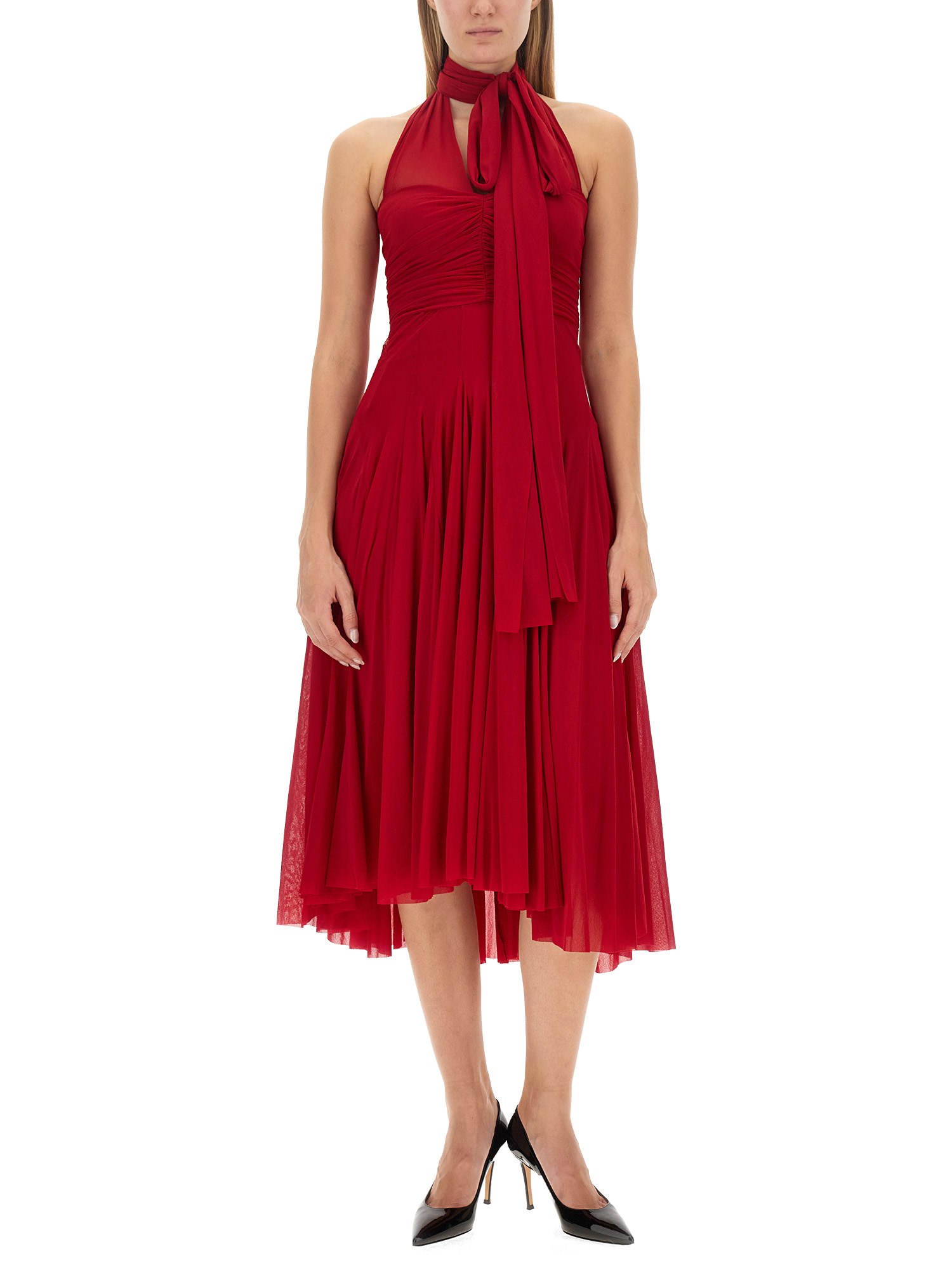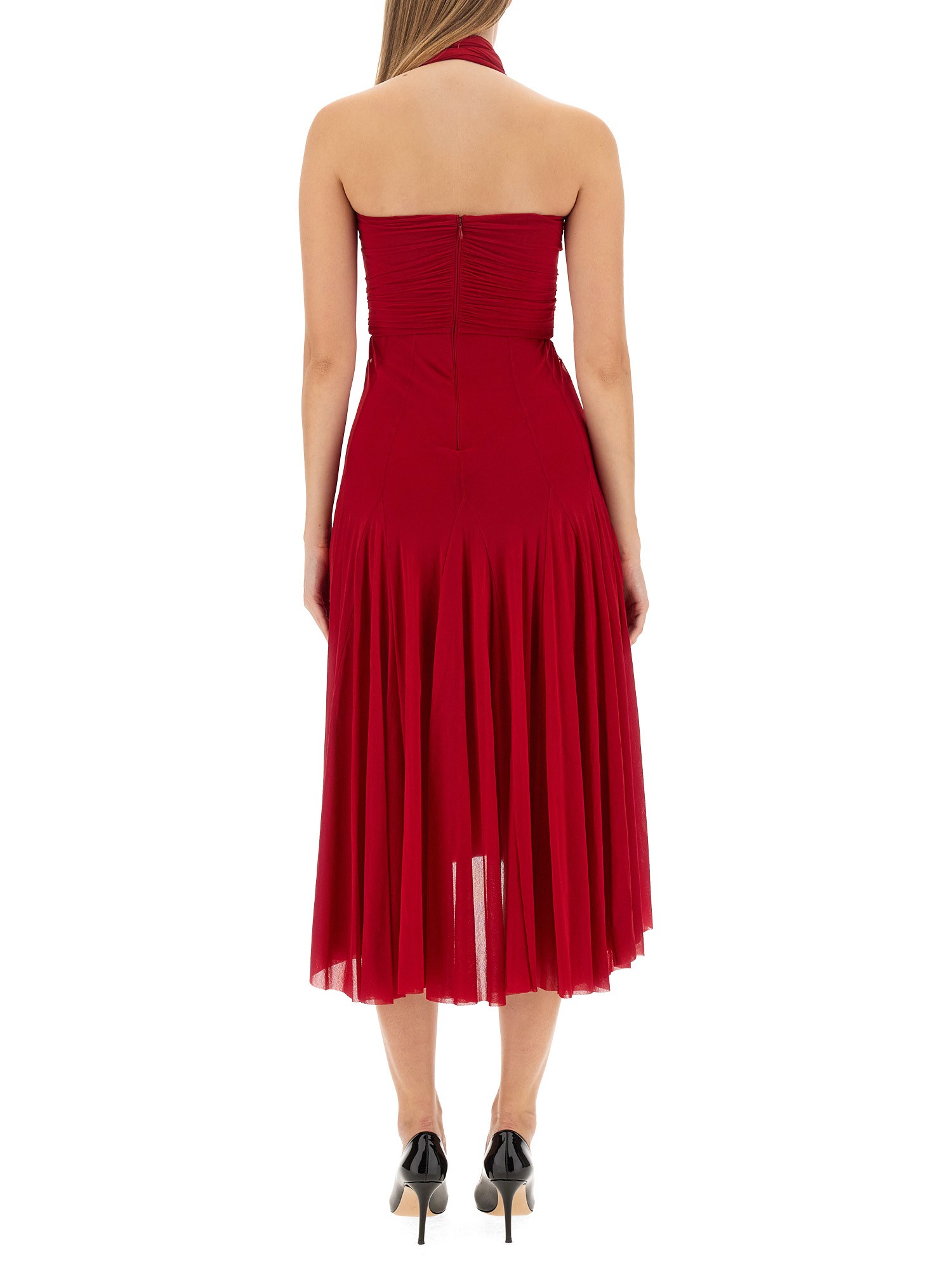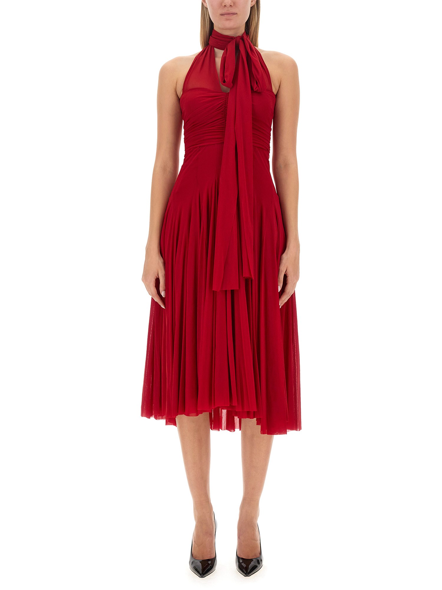 Longuette dress from Philosophy Di Lorenzo Serafini in stretch tulle with a hyper-feminine design. Thanks to the stretch fabric and a play of crosses, the neckline can be adjusted in different ways. The silhouette is fitted at the bodice, while it opens softly and flares out on the skirt.
