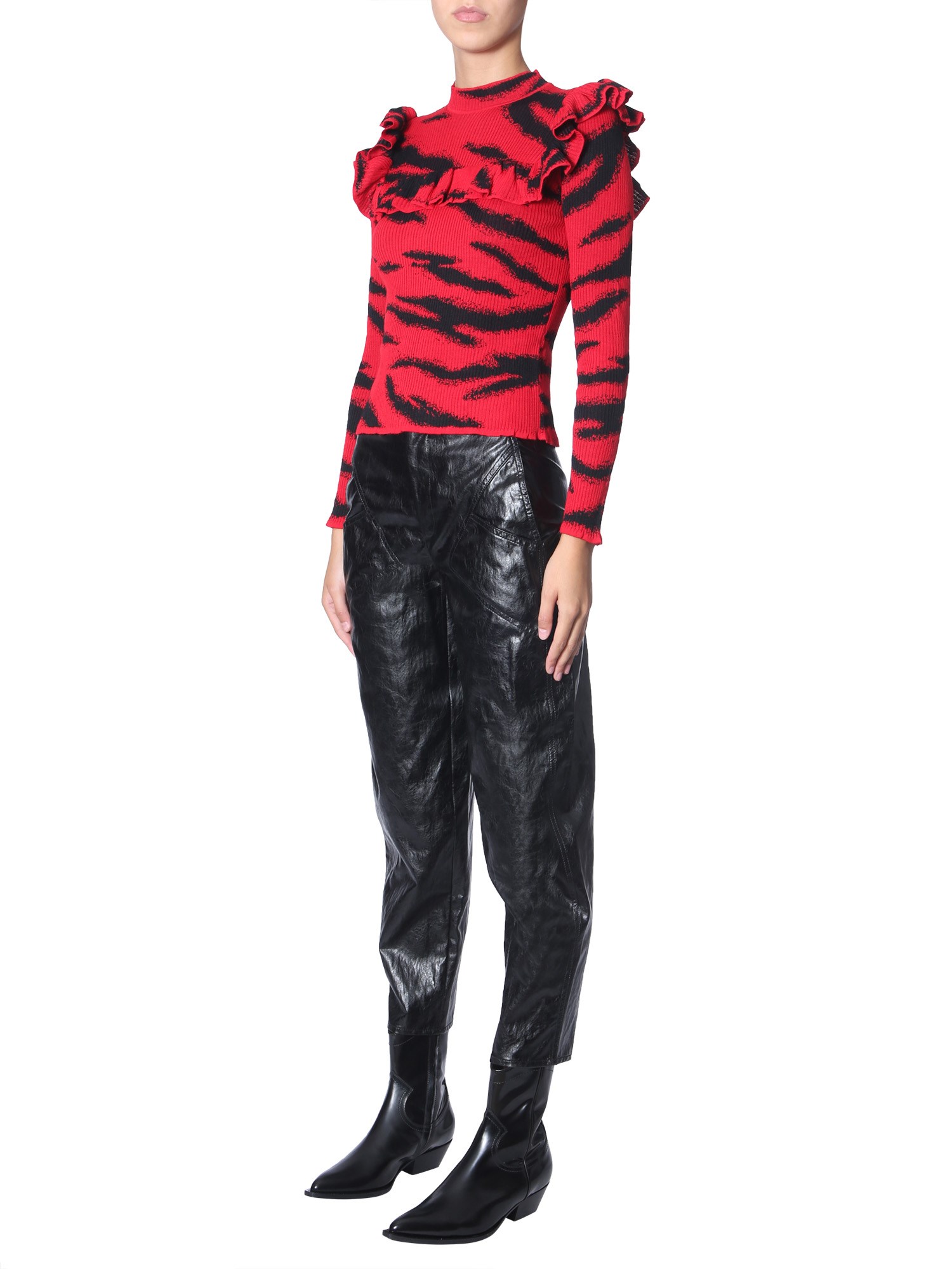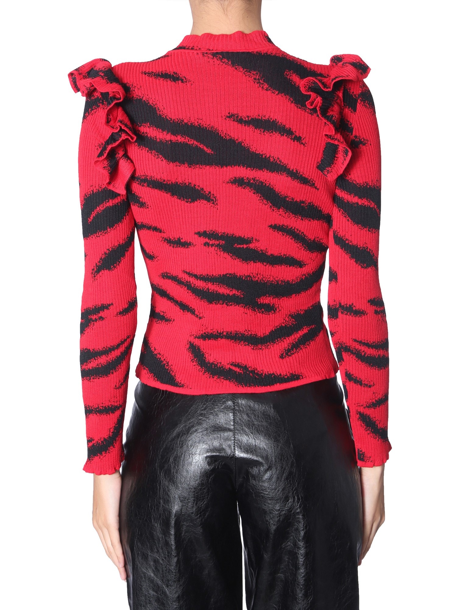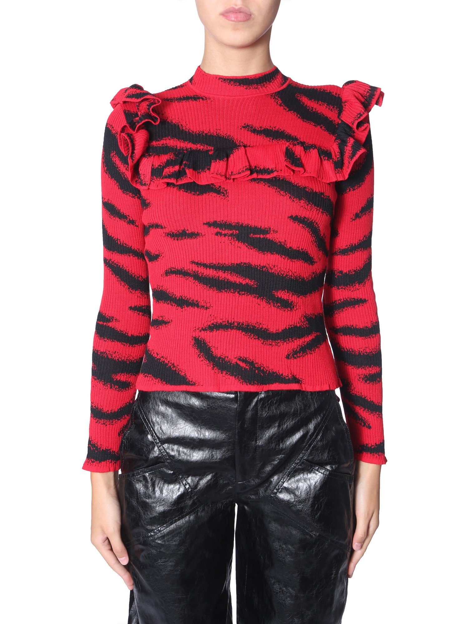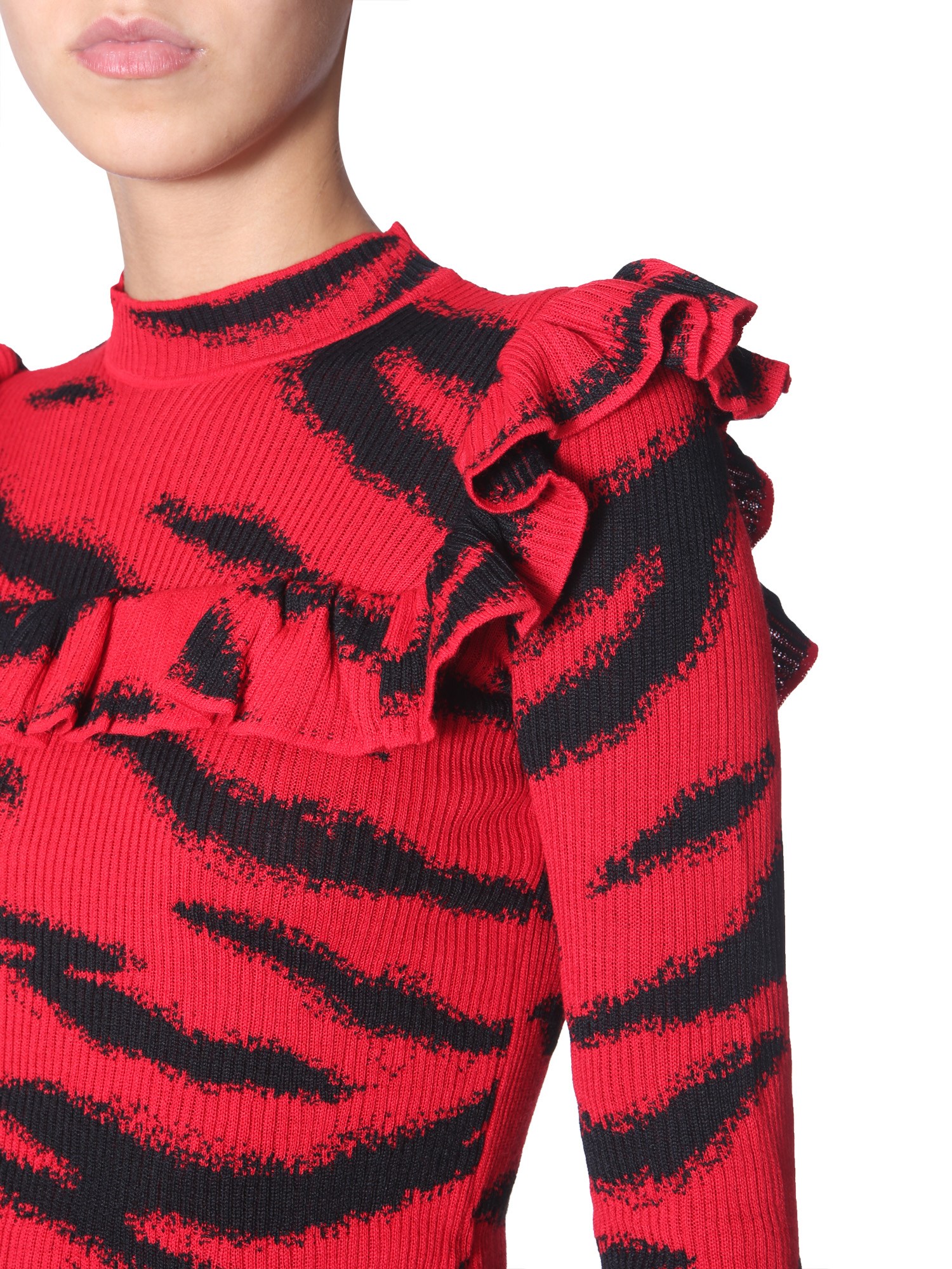 It is not easy to wear knitted sweaters and look stylish, but this one from Philosophy Di Lorenzo Serafini is stylish and snug. With a frilled neck and tiger print, this sweater complements your look efficiently. The short polo neck rests on relaxed shoulders and together they give a slim fit.