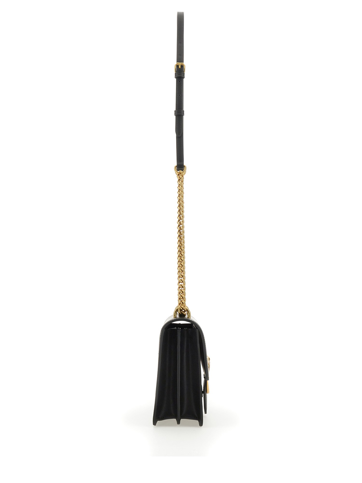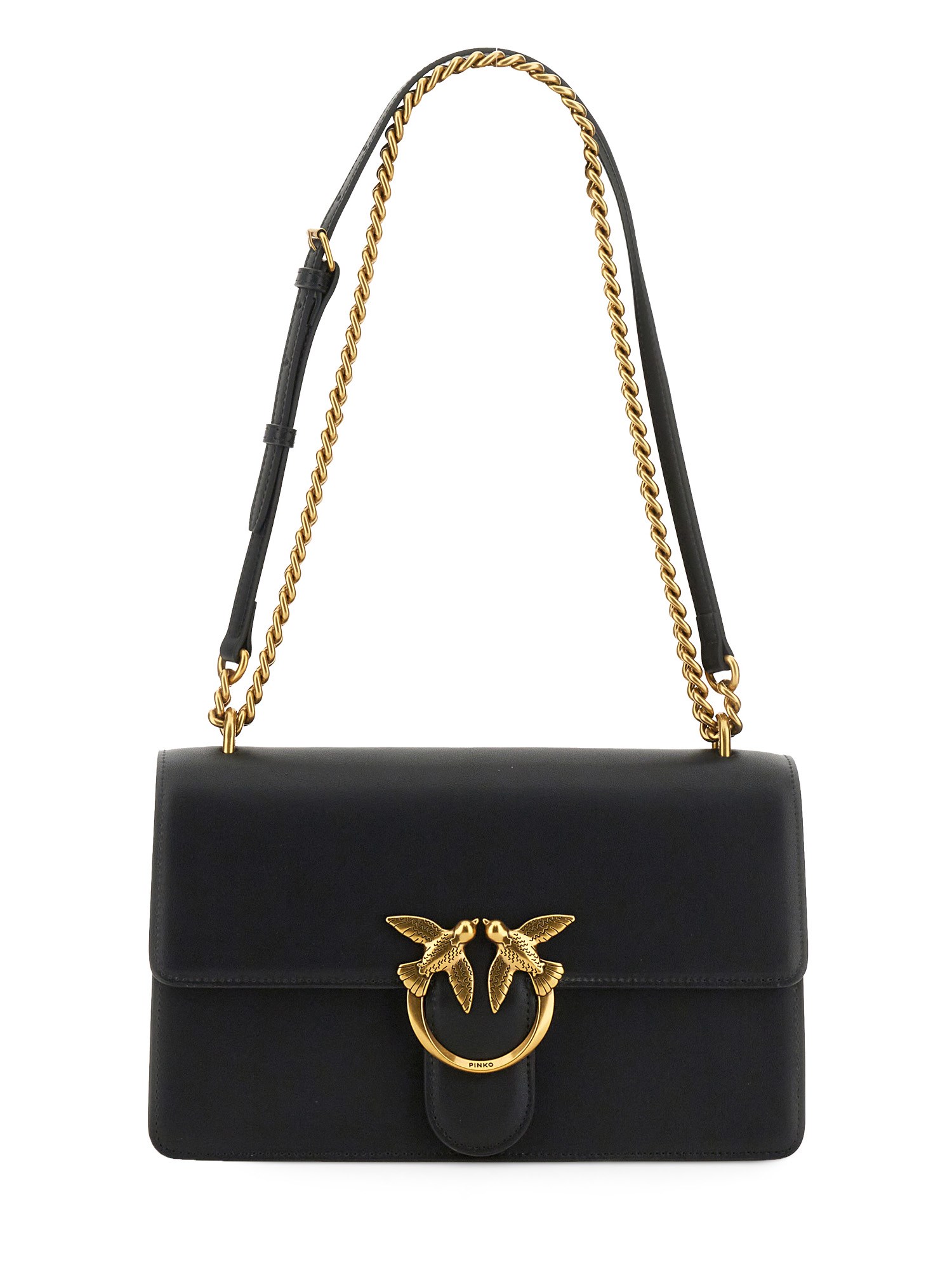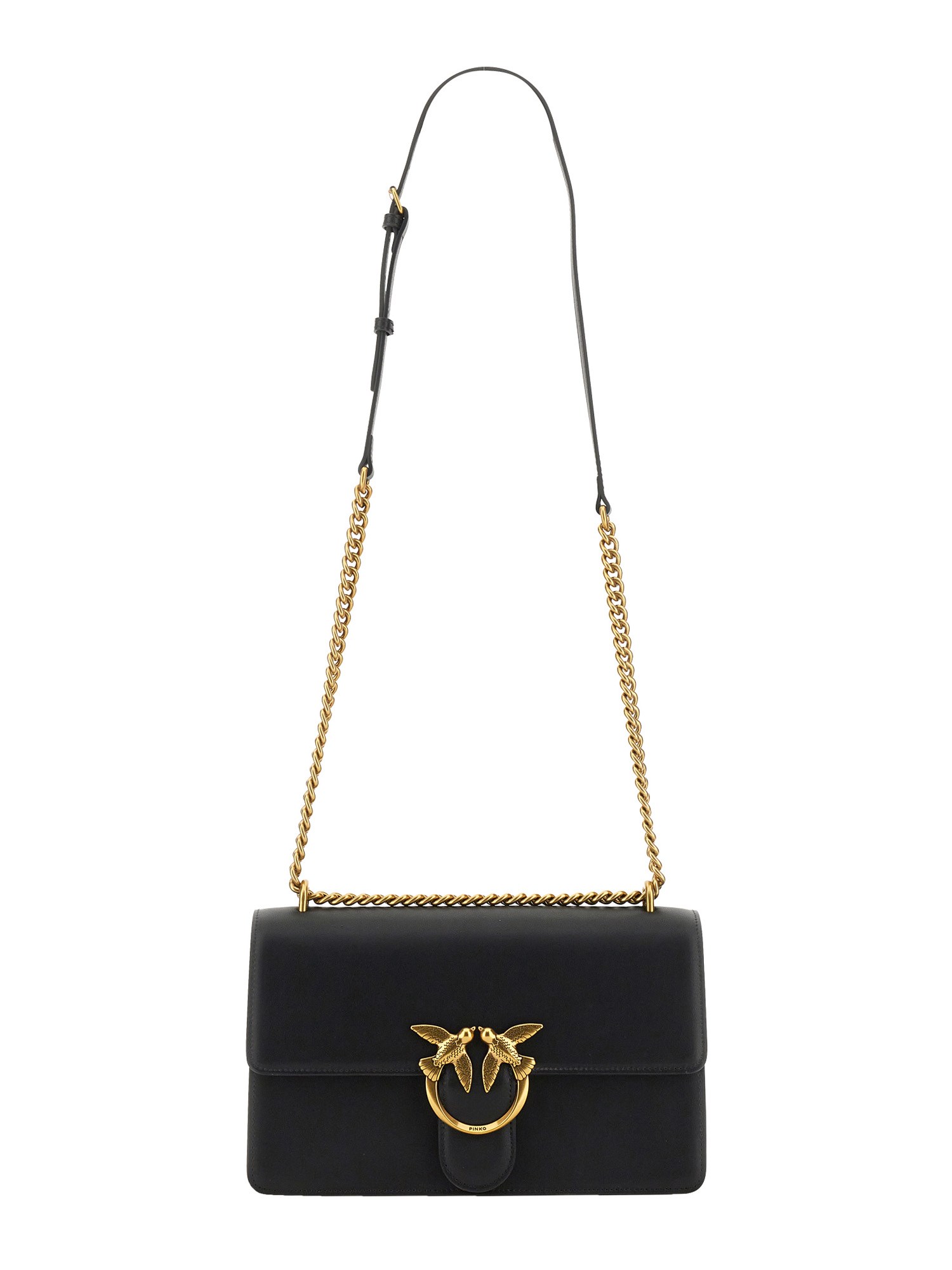 Classic Love Bag One in soft, silky leather. The fastening is embellished with the iconic metal Love Birds Diamond Cut buckle. The accessory boasts a suede microfibre-lined interior, complete with a zipped centre divider pocket and leather slip pocket. The shoulder strap combines the classic round-link chain with a practical, adjustable leather shoulder pad.