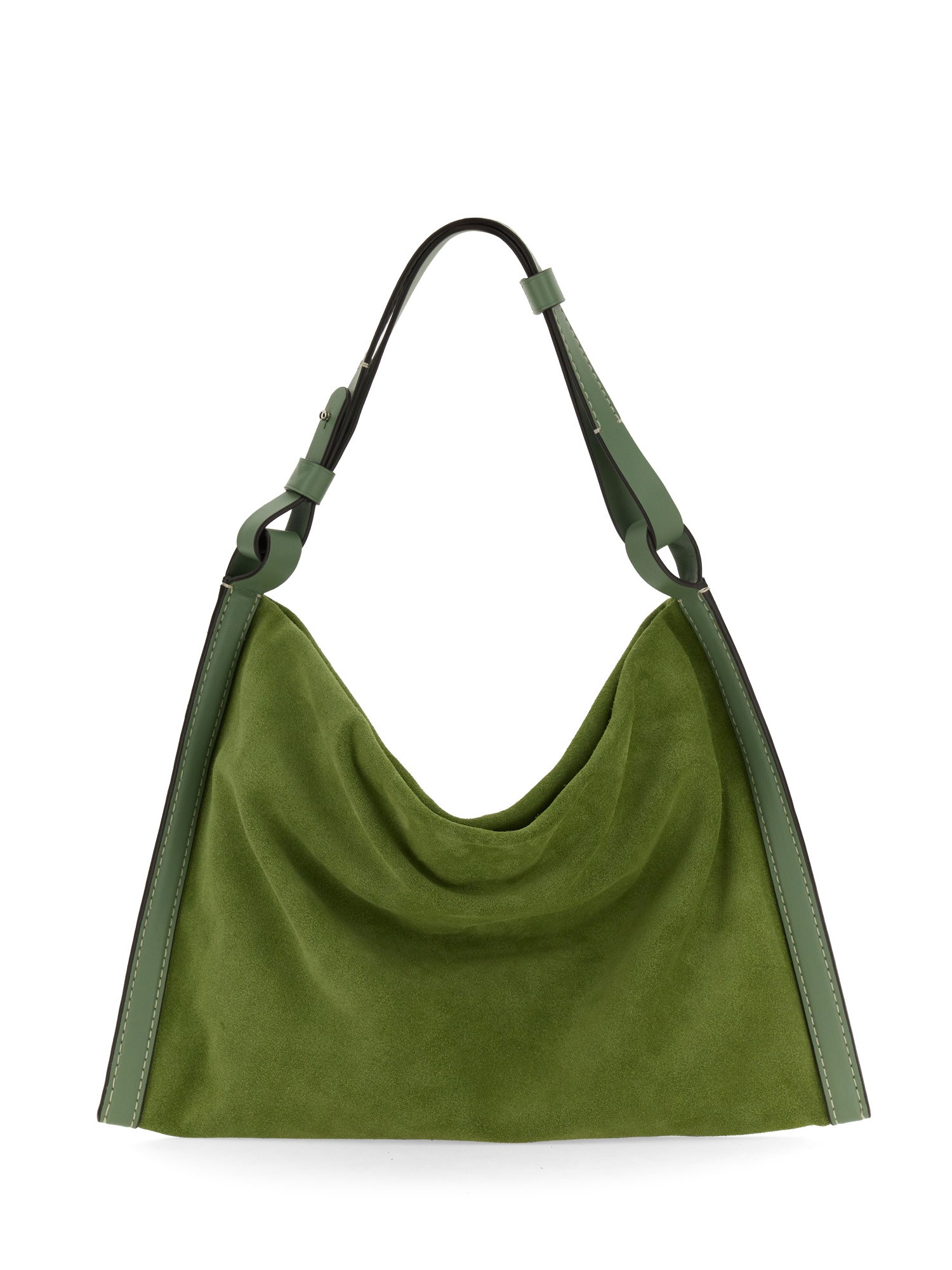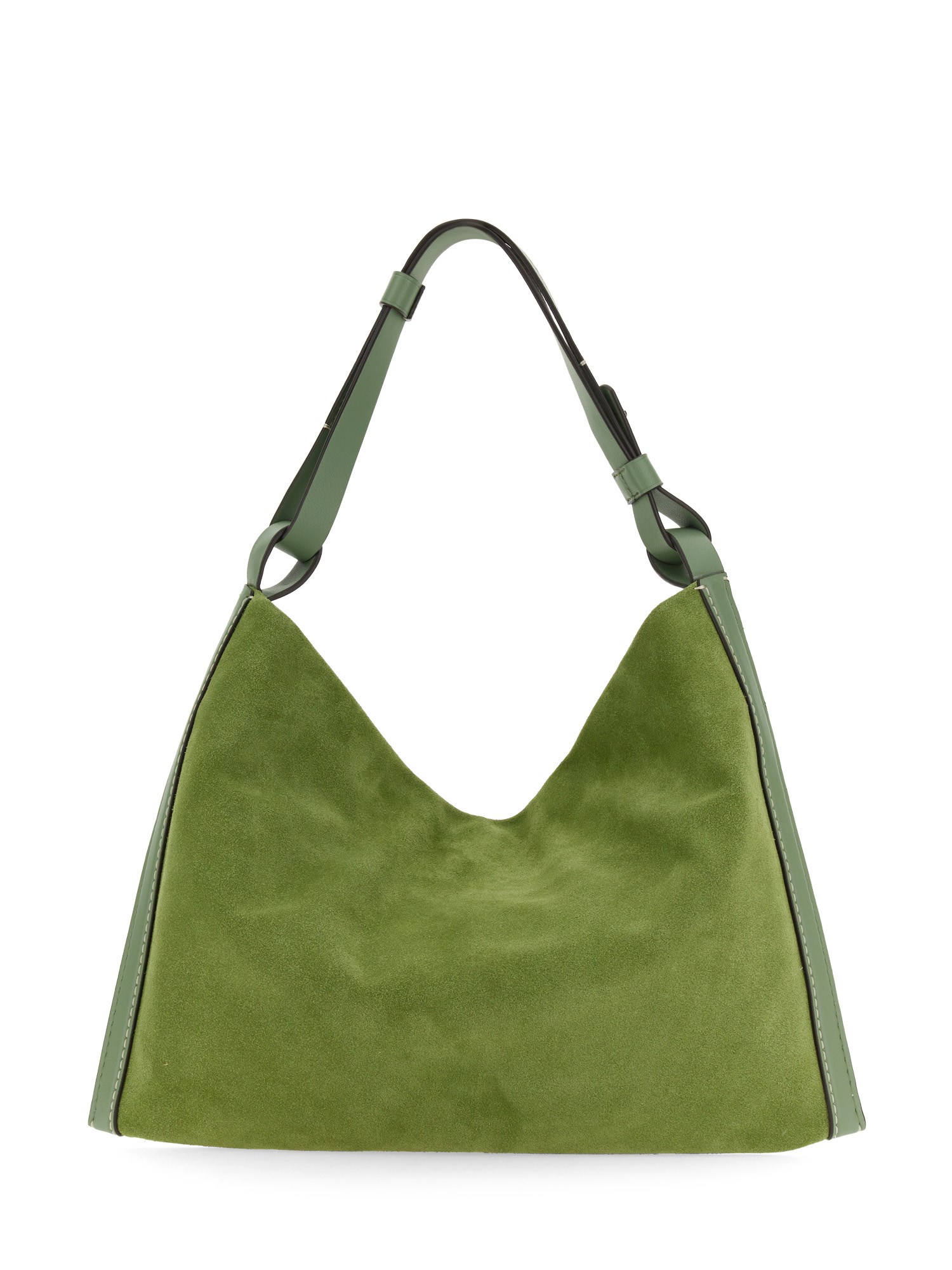 The Minetta Bag in green is crafted in a soft suede to a slouchy, rectangular silhouette. Features a tonal leather top handle and side trims with contrast white topstitching. Signature logo stamp. Open top. Contrast suede interior with a zip pocket. Silver-tone metal hardware.