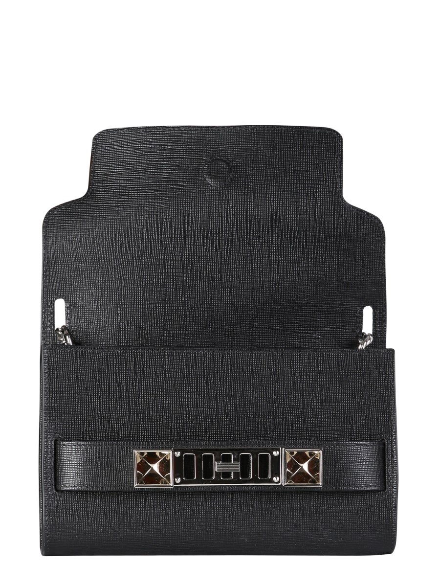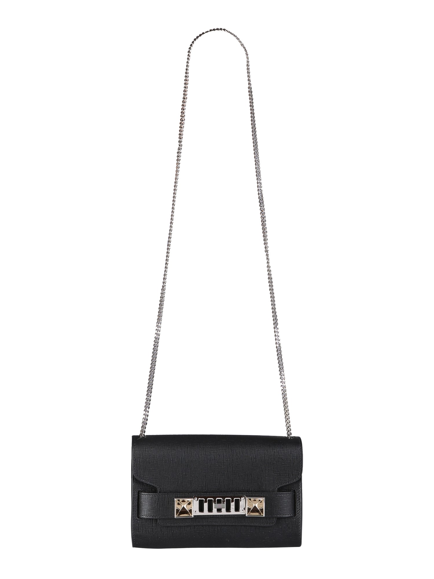 This bag from Proenza Schouler is a chic and sophisticated way to carry your essentials with a little extra flair. The silver-toned hardware, leather, and cross-body strap make it a perfect evening accessory. It features a chain shoulder strap, a swive closure and one back pocket.