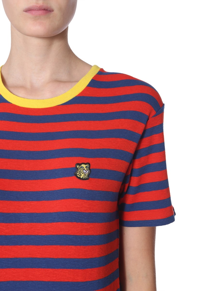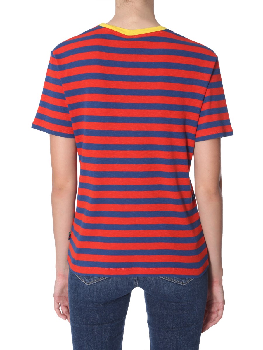 Breeze into summer with a unique style with this striped T-shirt from PS by Paul Smith. It is made from 100% cotton that which gives the tee a superior, soft hand feel and lustre. It has a contrasting pope detailing at the neckline with a trendy patch on the chest. You can style it with denim shorts and canvas shoes for a stylish summer ensemble.