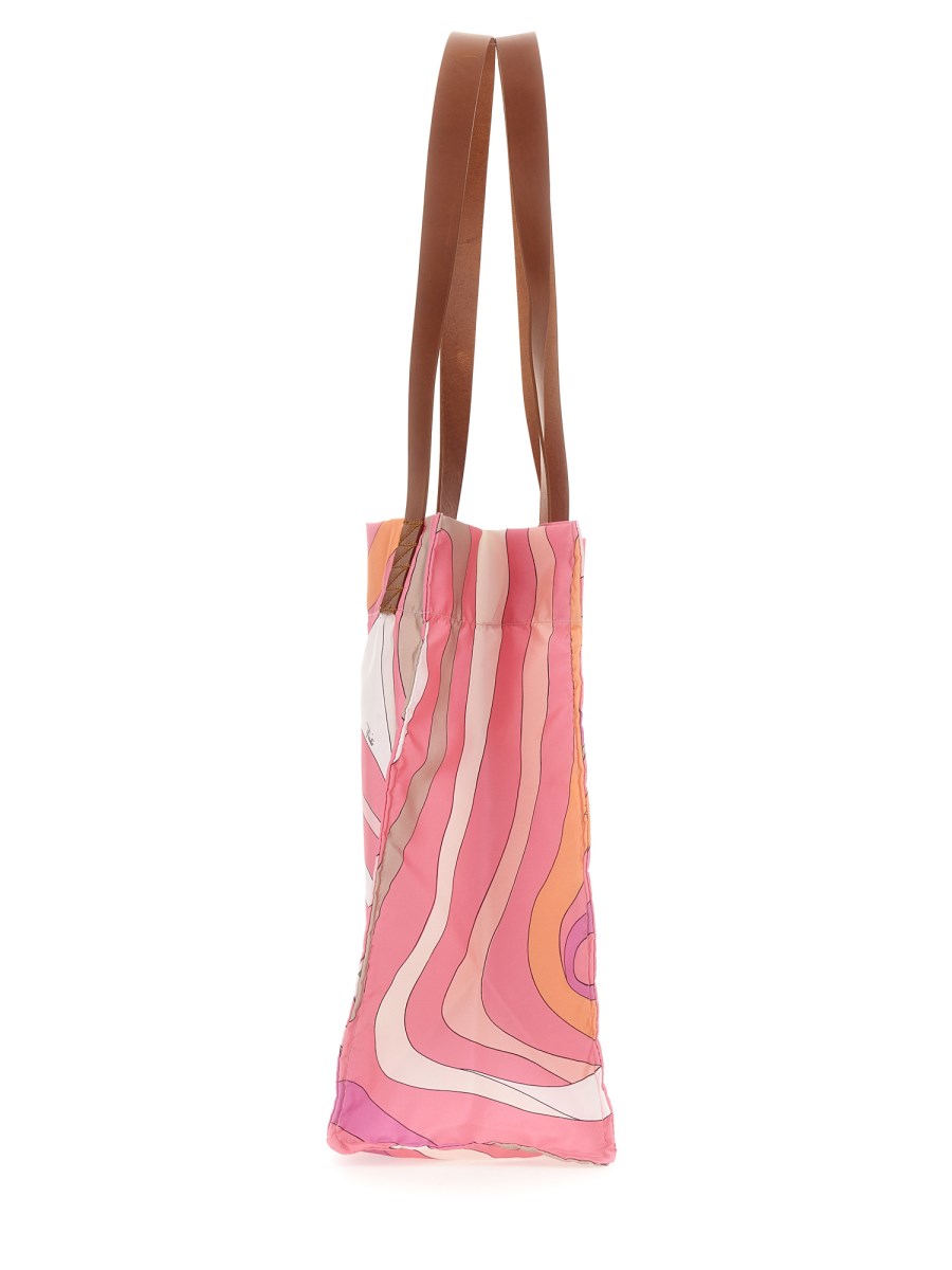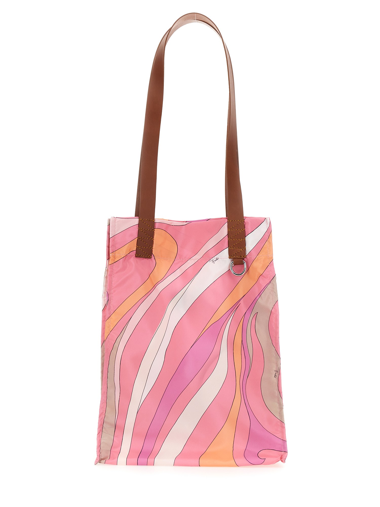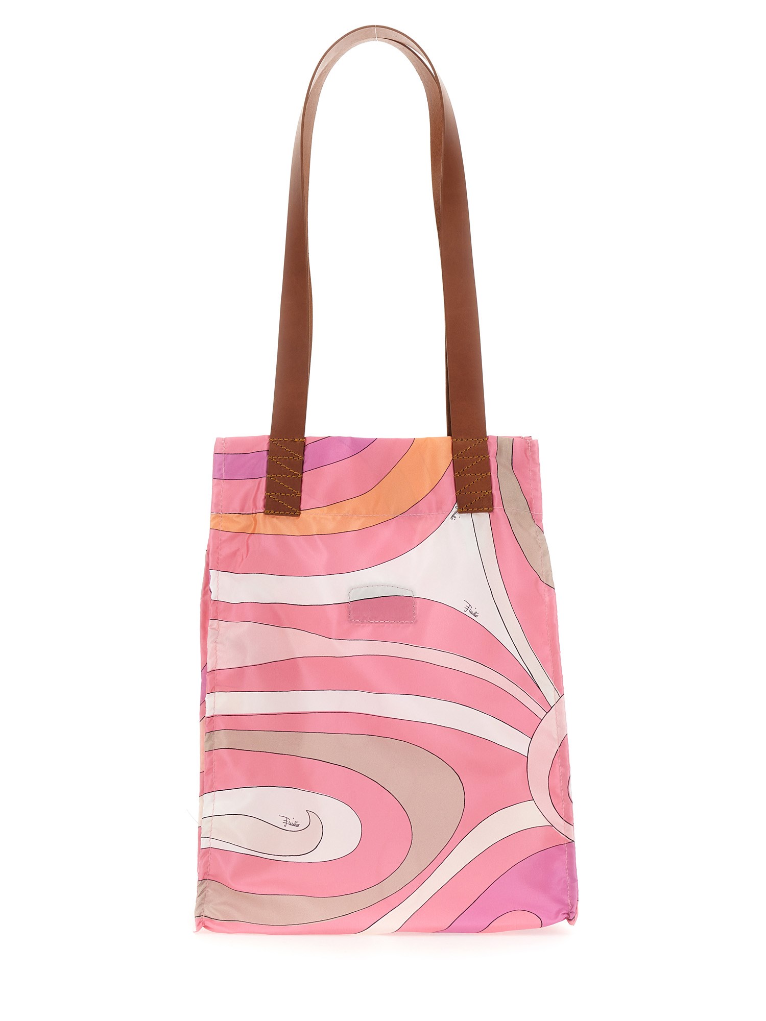 A versatile tote bag from Pucci that is a must-have in every woman's bag. The pattern is simple and classic, but the colours are fresh and fun. The polyester bag features a double leather top handle for ease of carrying and a leather strap with a snap hook. It is adorned with a patterned print for added style.