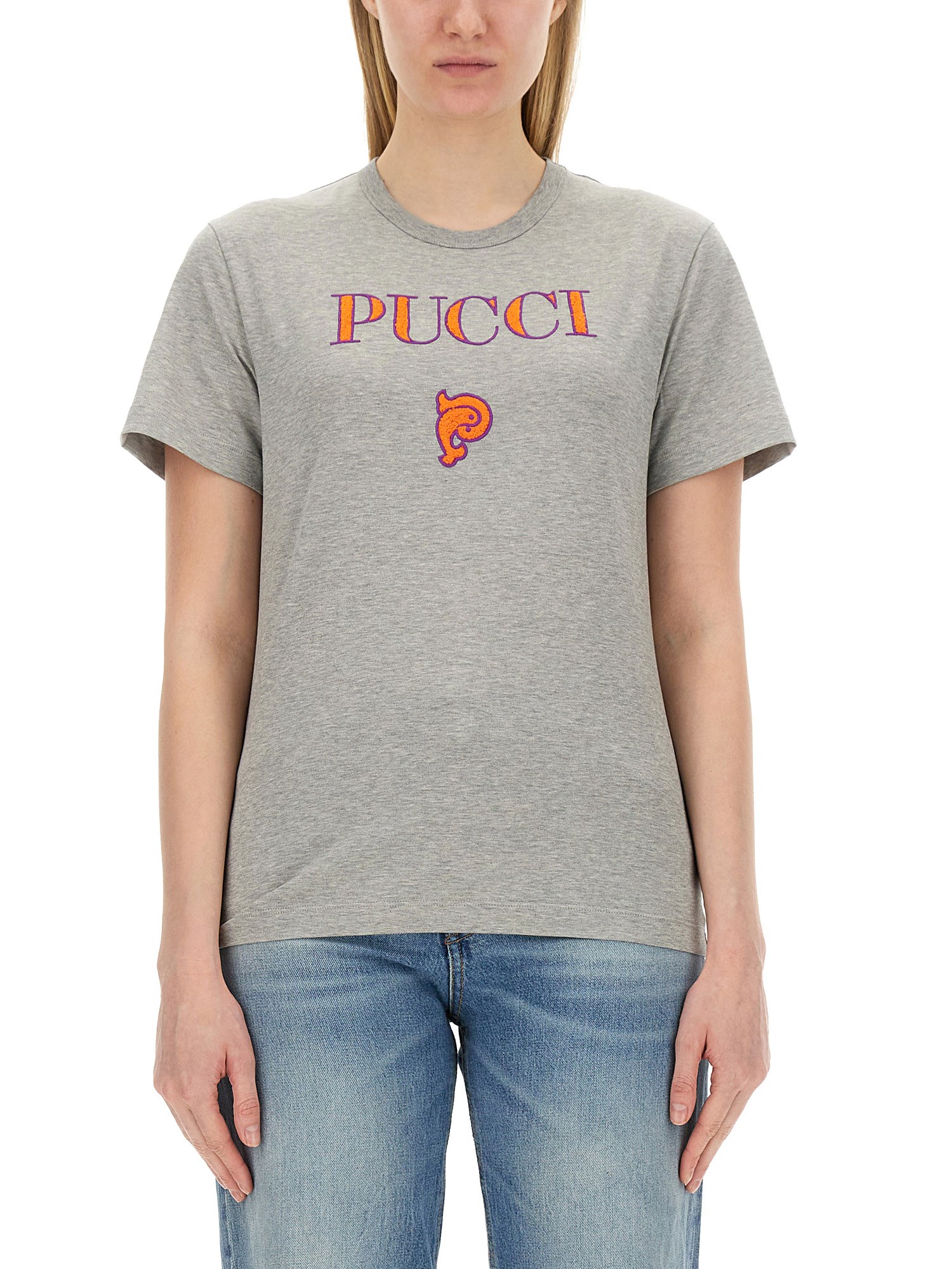 This T-shirt from Pucci will keep you cool and comfortable all day long, making it perfect for casual outings or lounging at home. Its classic crew neck design adds a timeless touch, while the grey colour offers a versatile option for pairing with any bottoms. The front logo adds a trendy twist, giving this T-shirt a unique and eye-catching appeal.