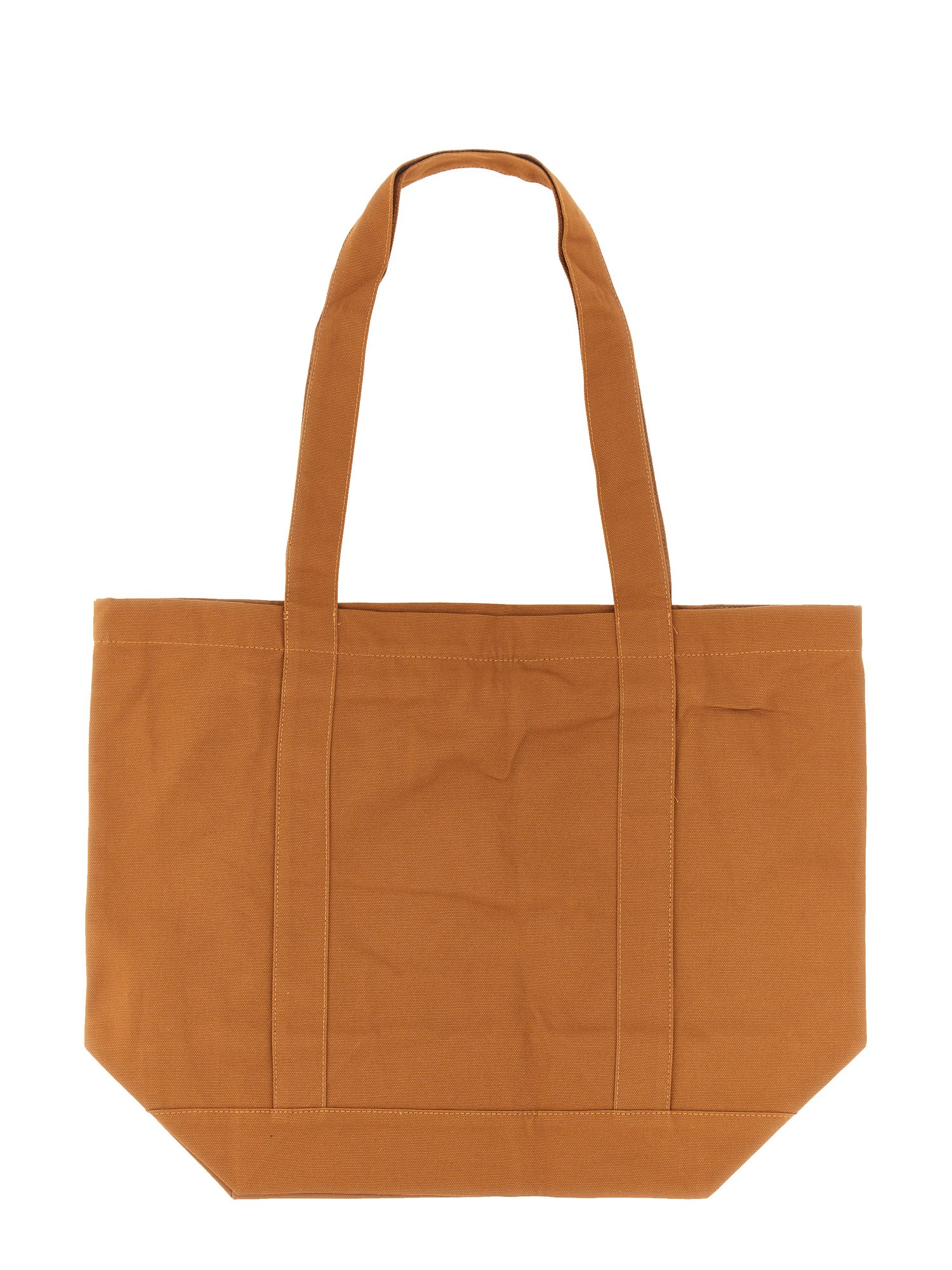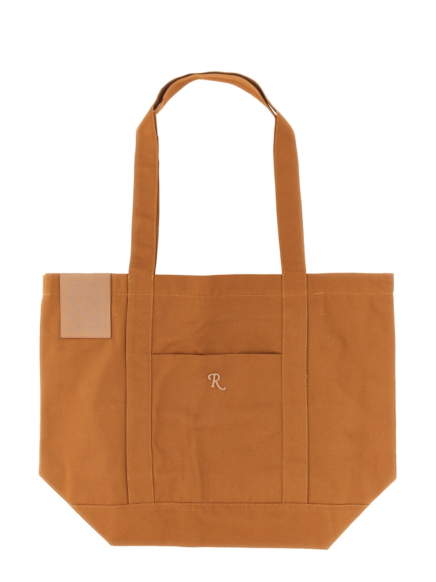 This is a cute, basic, canvas tote bag from Raf Simons. It has a cotton canvas exterior and a cotton interior. It has an unlined inner and is designed to hold a lot of things. The double handle bag has a logo patch on the front. It has a logo and a slip pocket on the exterior.