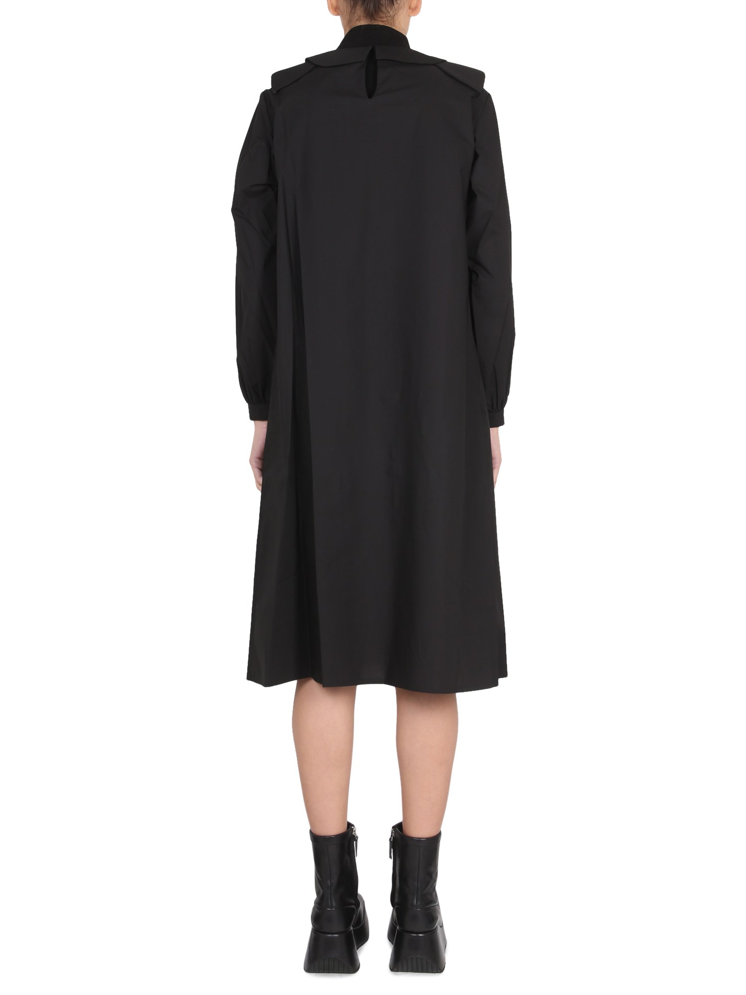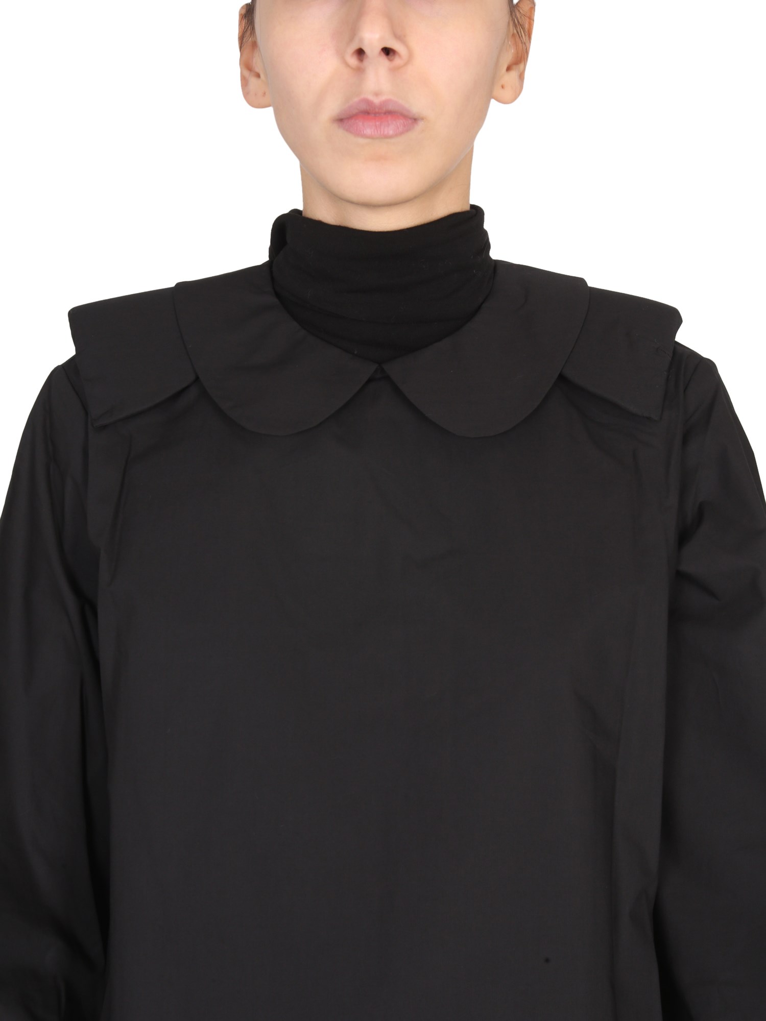 Claudine collar relaxed fit cotton shirt dress from Raf Simons is a unique and chic addition to your closet. The classic cotton shirt dress features a draped collar and long sleeves, making it perfect for any season. It is versatile, so it can be worn with leggings or jeans for a casual look.