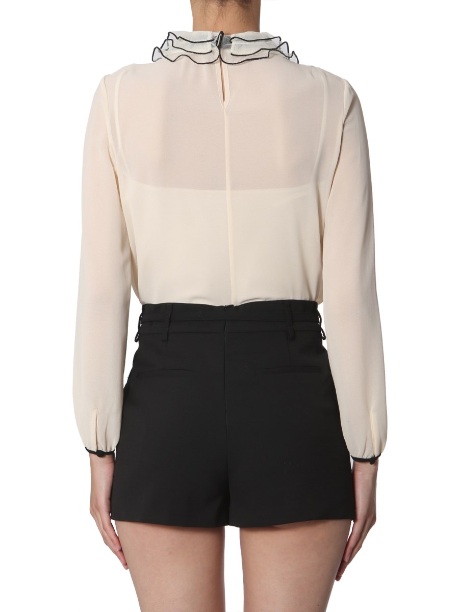 Add a dash of sophistication to your wardrobe by adding this shirt with ruches from Red Valentino. The top is tailored from 100% polyester that feels soft against your skin. It features ruched detailing at the neckline and tie-up bow that further accentuates its classy look. You can pair it with a black short skirt to complete your look.