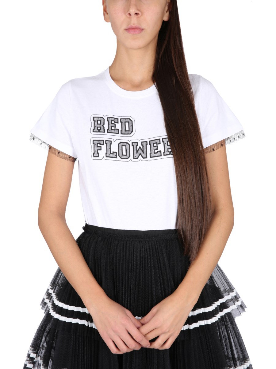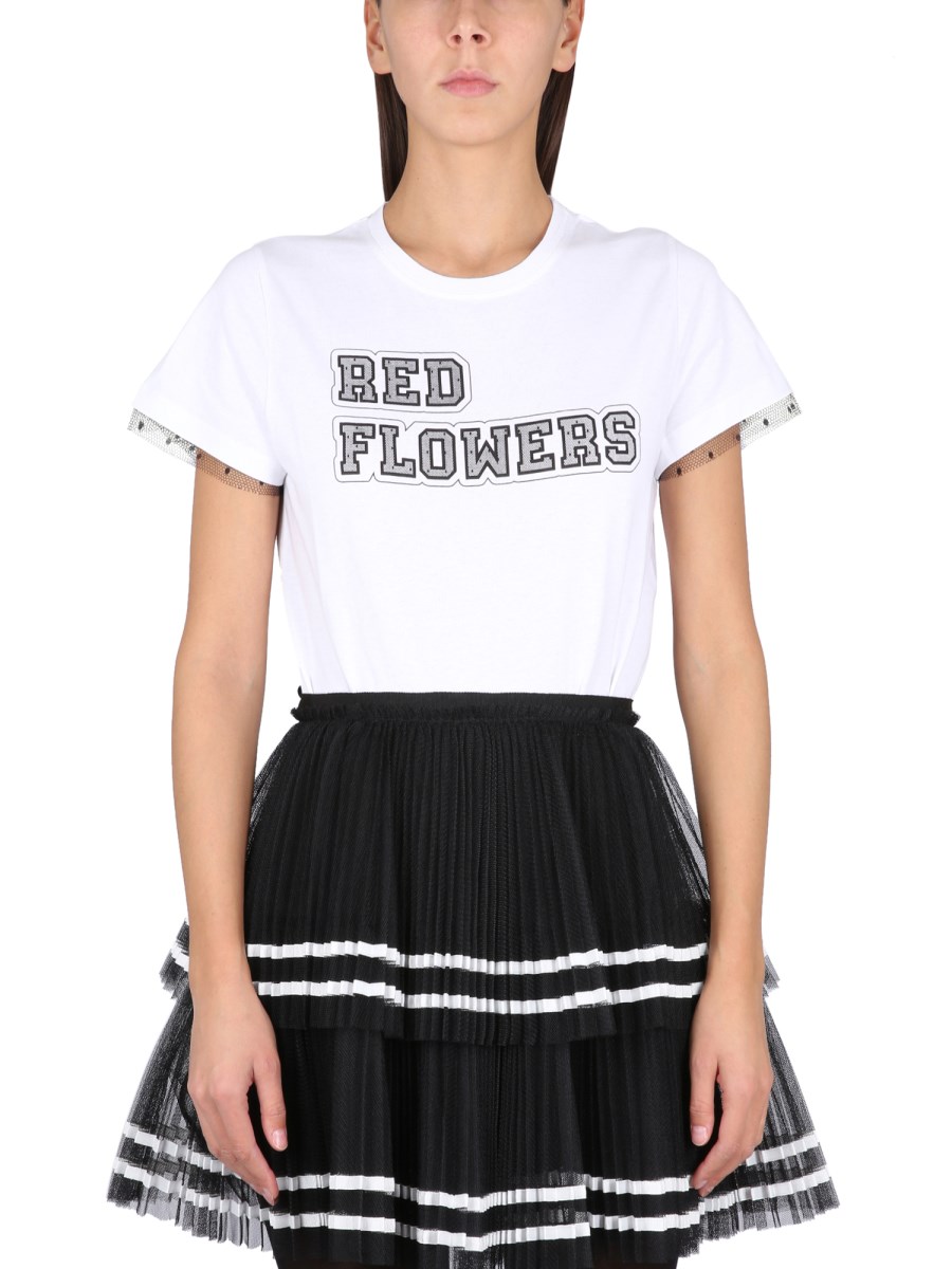 A stunning "Red Flowers" cotton jersey T-shirt from Red Valentino that is made from a soft fabric with a comfortable feel. It is cut in a flattering shape and features a contrasting graphic on the front. The pull-on style tee has a crew neckline, short sleeves, and a straight hemline.