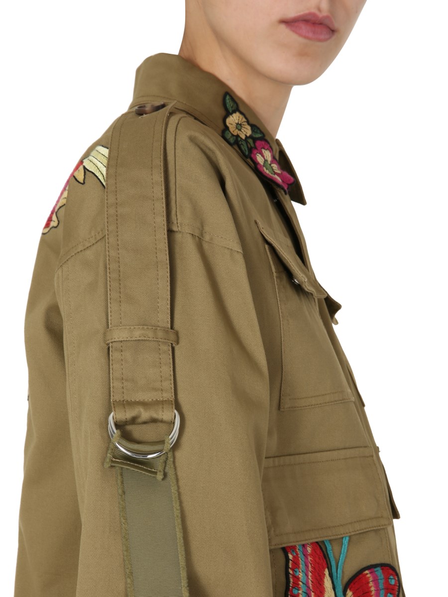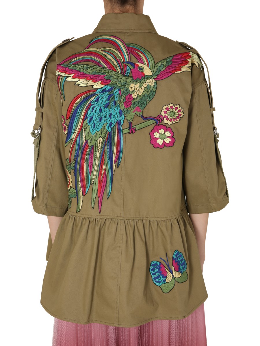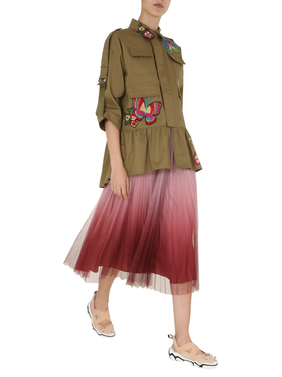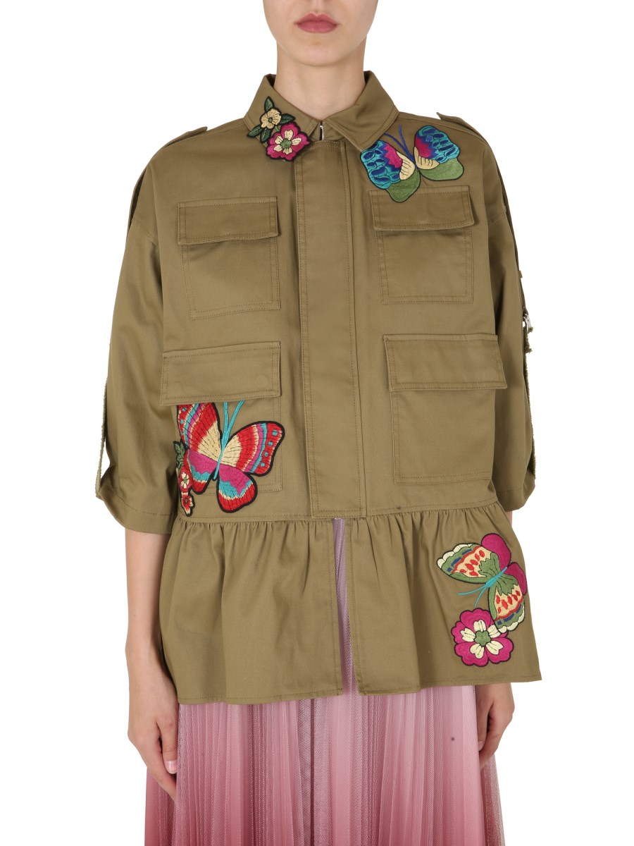 Adorned with multiple colourful patches, this embroidered caban from Red Valentino will never fail to give a smart and distinct look. It is made of premium cotton fabric to give utmost warmth and a luxurious appeal. It has four pockets for functionality. The bottom frills and butterfly patches add fanciness to the look.