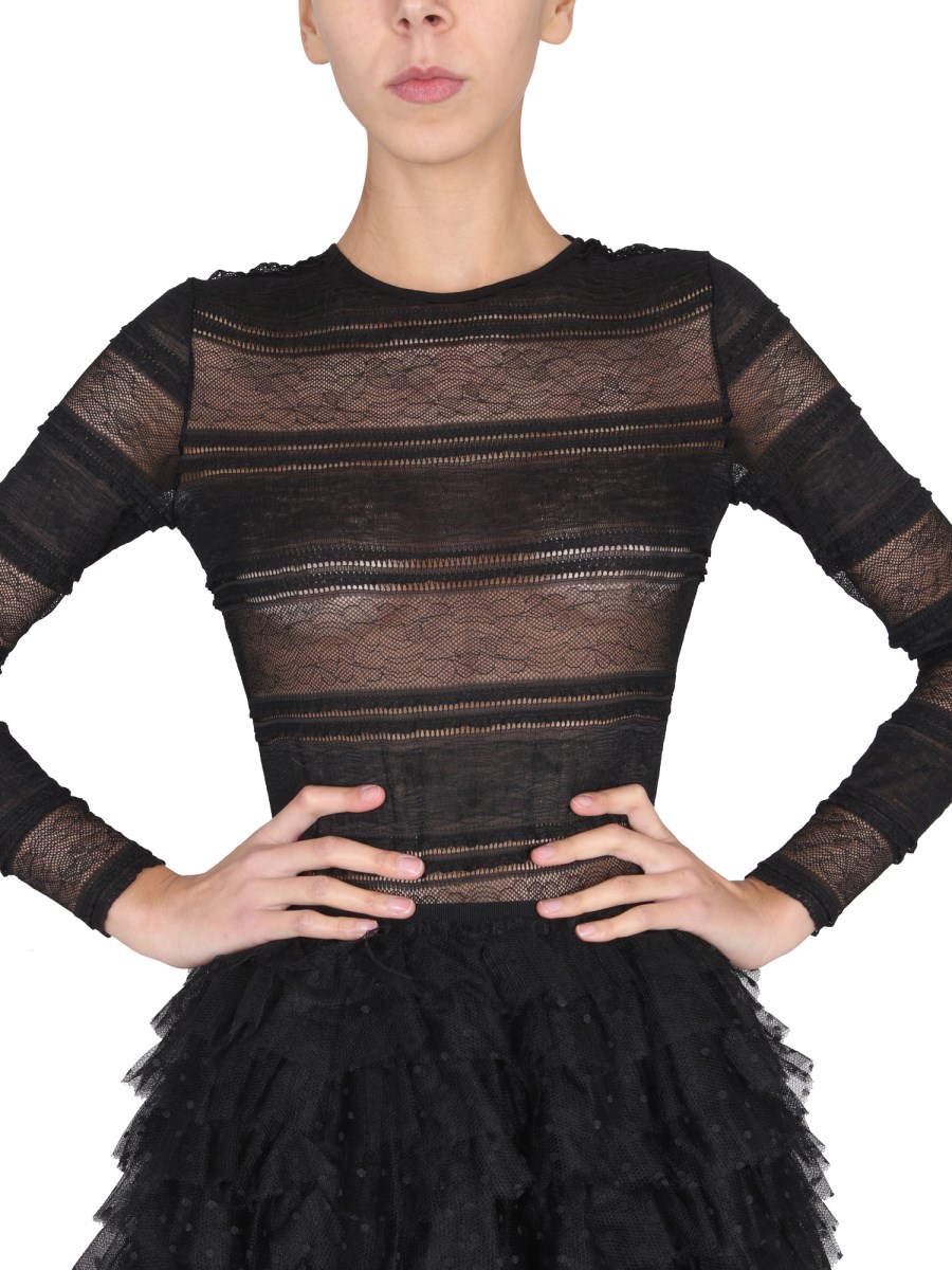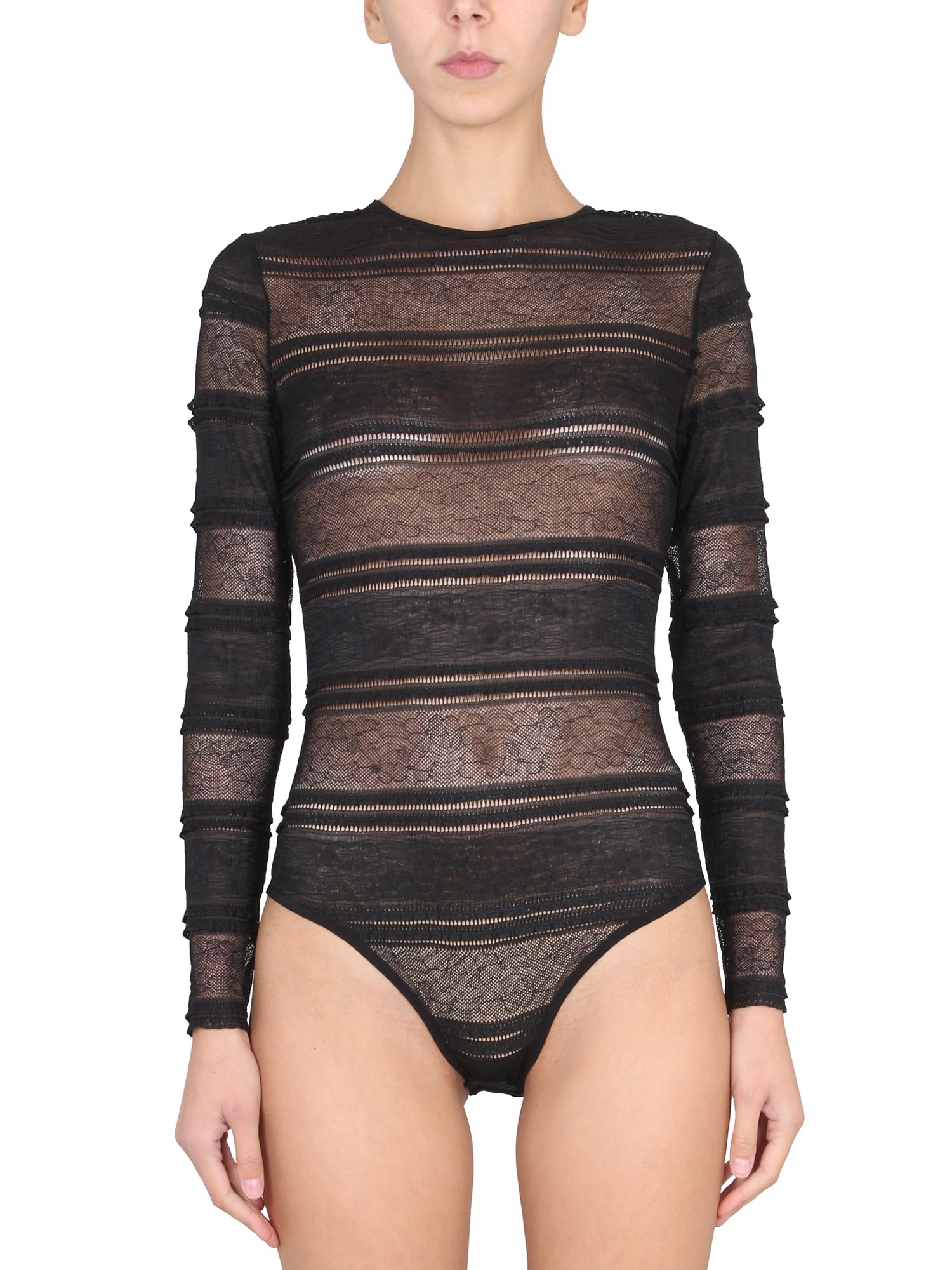 Wrap yourself in luxury in this sheer, lace bodysuit from the house of Red Valentino. A body-hugging sheer lace bodysuit with a deep round neckline and long sleeves. This lace body suit is perfect for a day out at the beach. Made from a polyester and elastane\ blend, this piece has a stretchy fit and a high-cut leg.