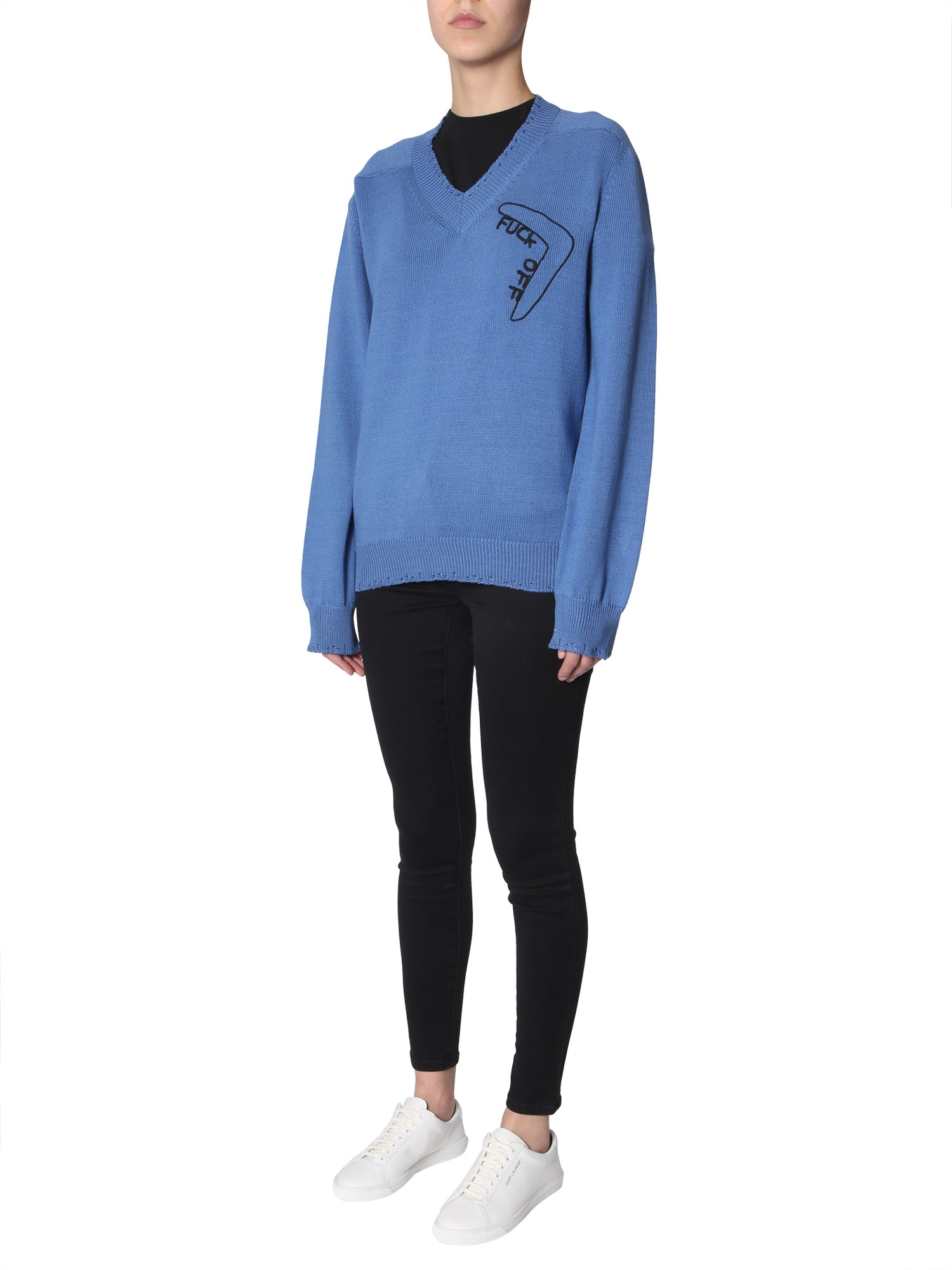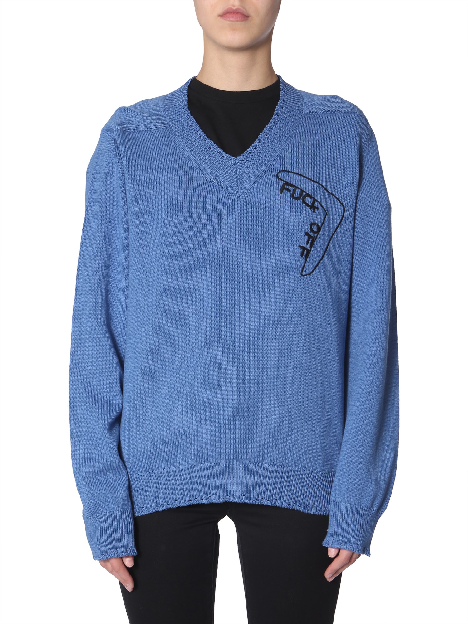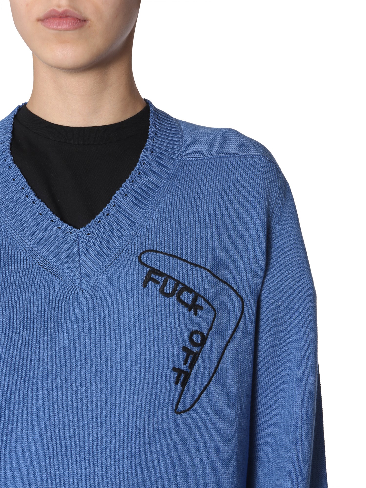 Wear your style when you make this embroidered sweater from Riccardo Comi your winter wardrobe essential. The sweater is made using 100% cotton material that assures to keep you warm and cosy throughout the winter. The V neck and “Fuck Off “embroidery on the front lends it a young vibe so that you can wear it to college or while hanging out with friends.