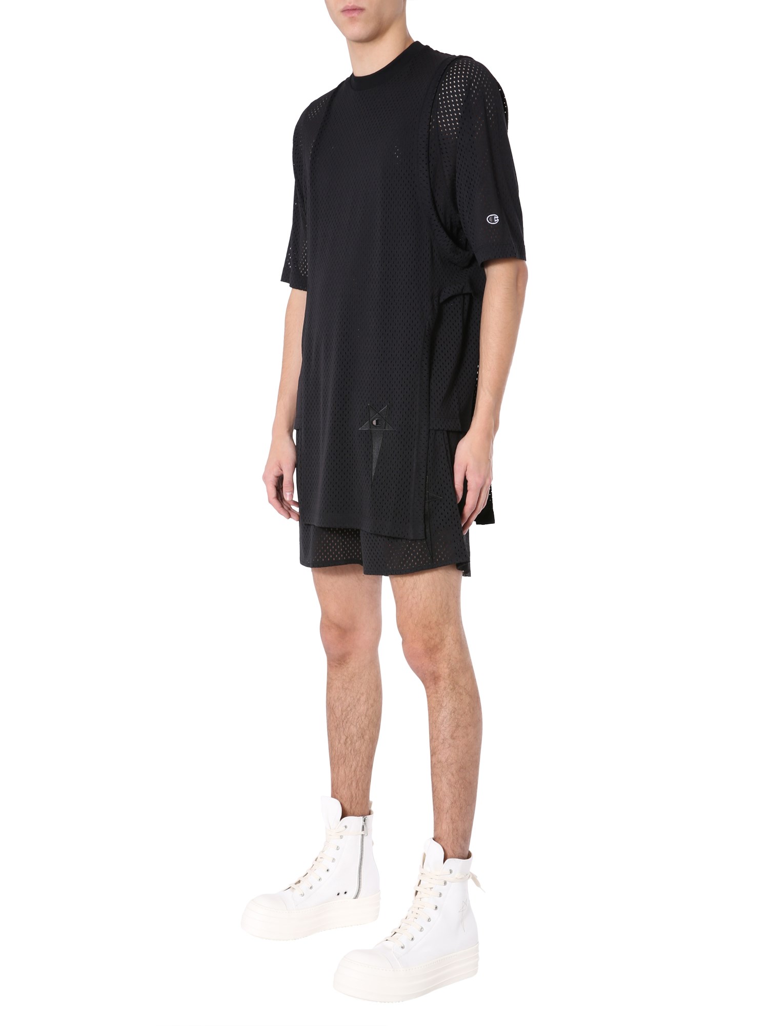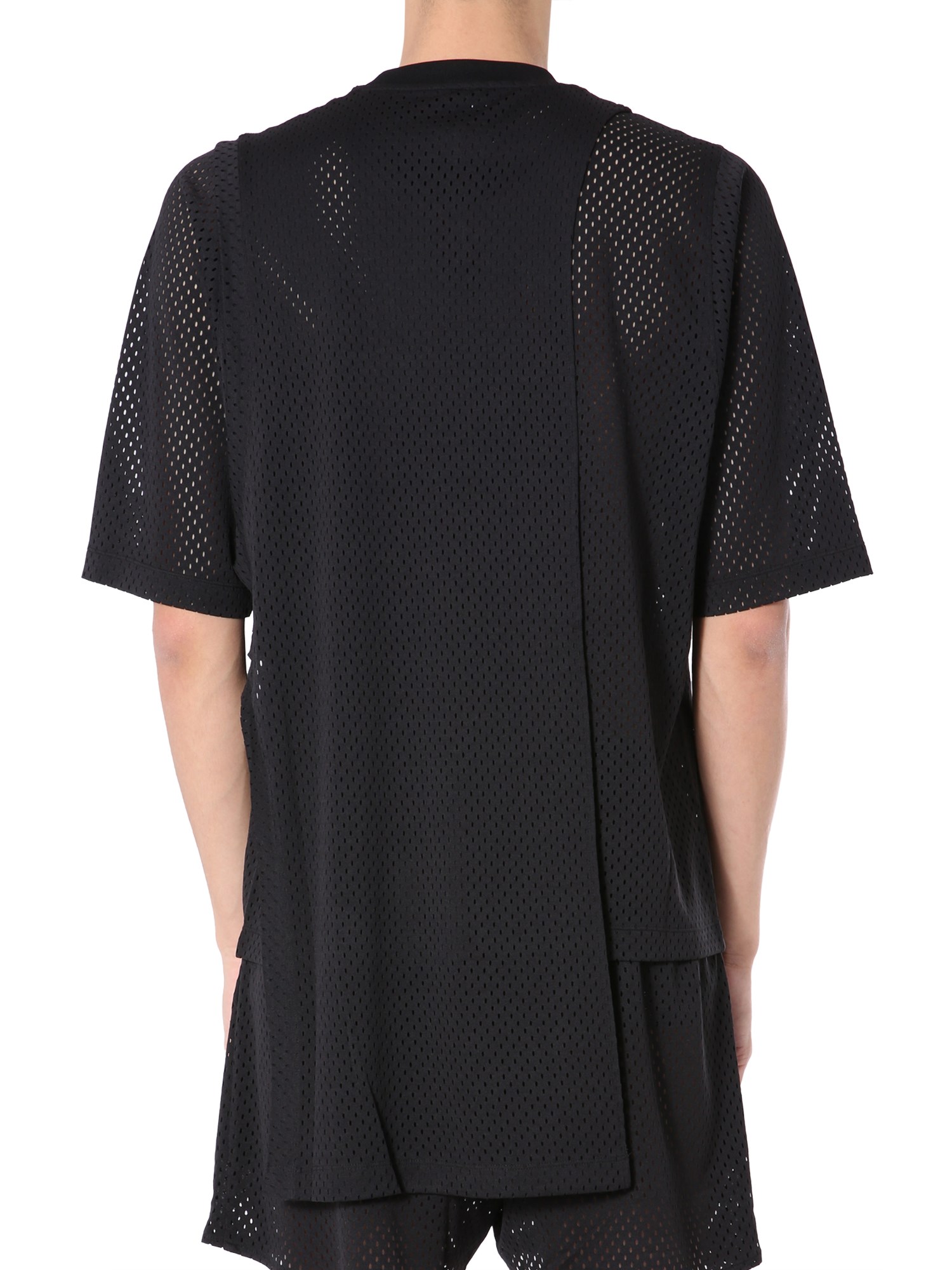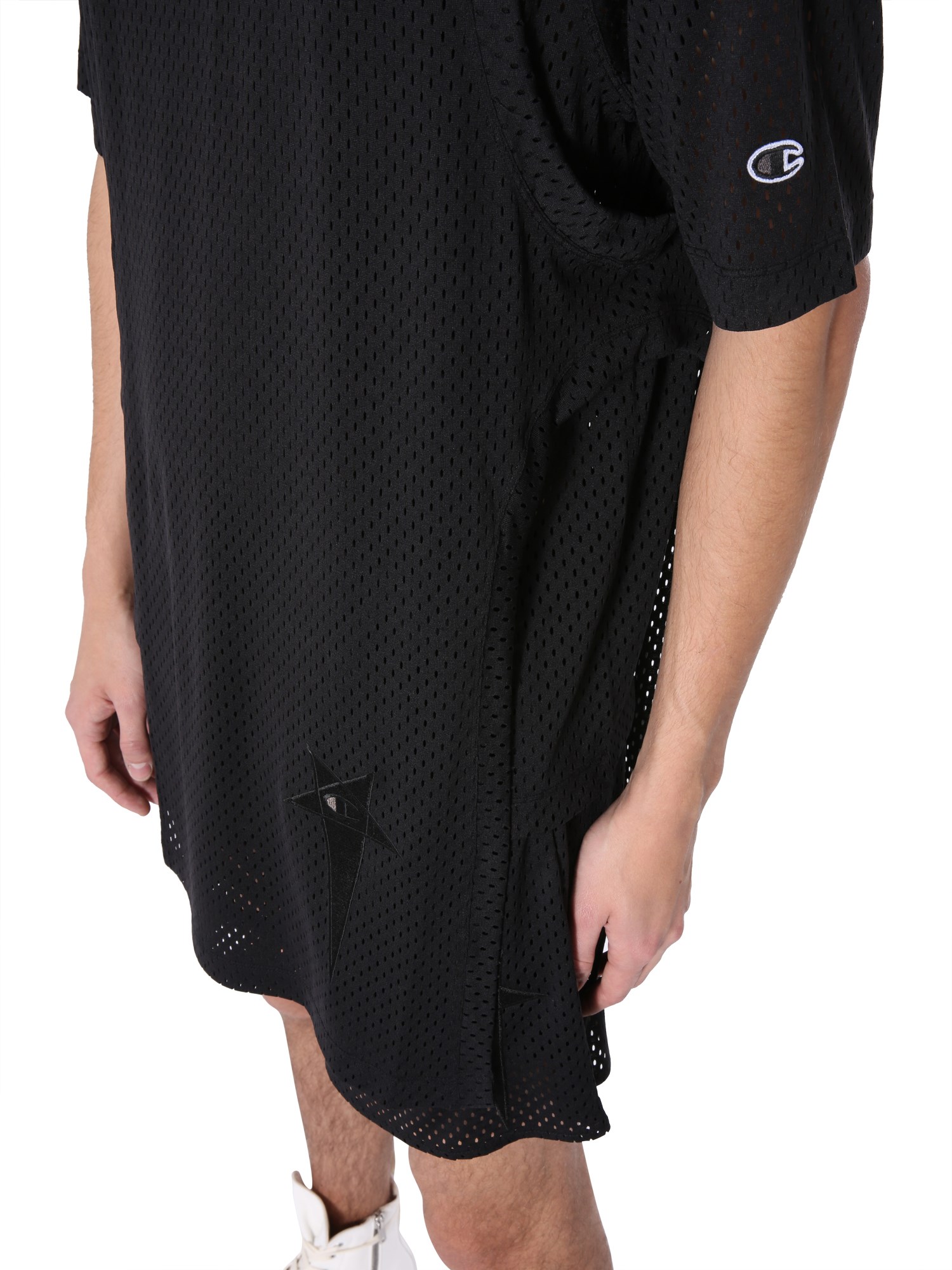 Netflix and chill on weekends in the destructured T-shirt by Rick Owens. This polyester mesh T-shirt is a perfect pick for summer and spring seasons. It has a round neck and short sleeves to keep you comfortable all day long. Pair up the T-shirt with jeans or denim shorts if you feel like heading out for a walk.