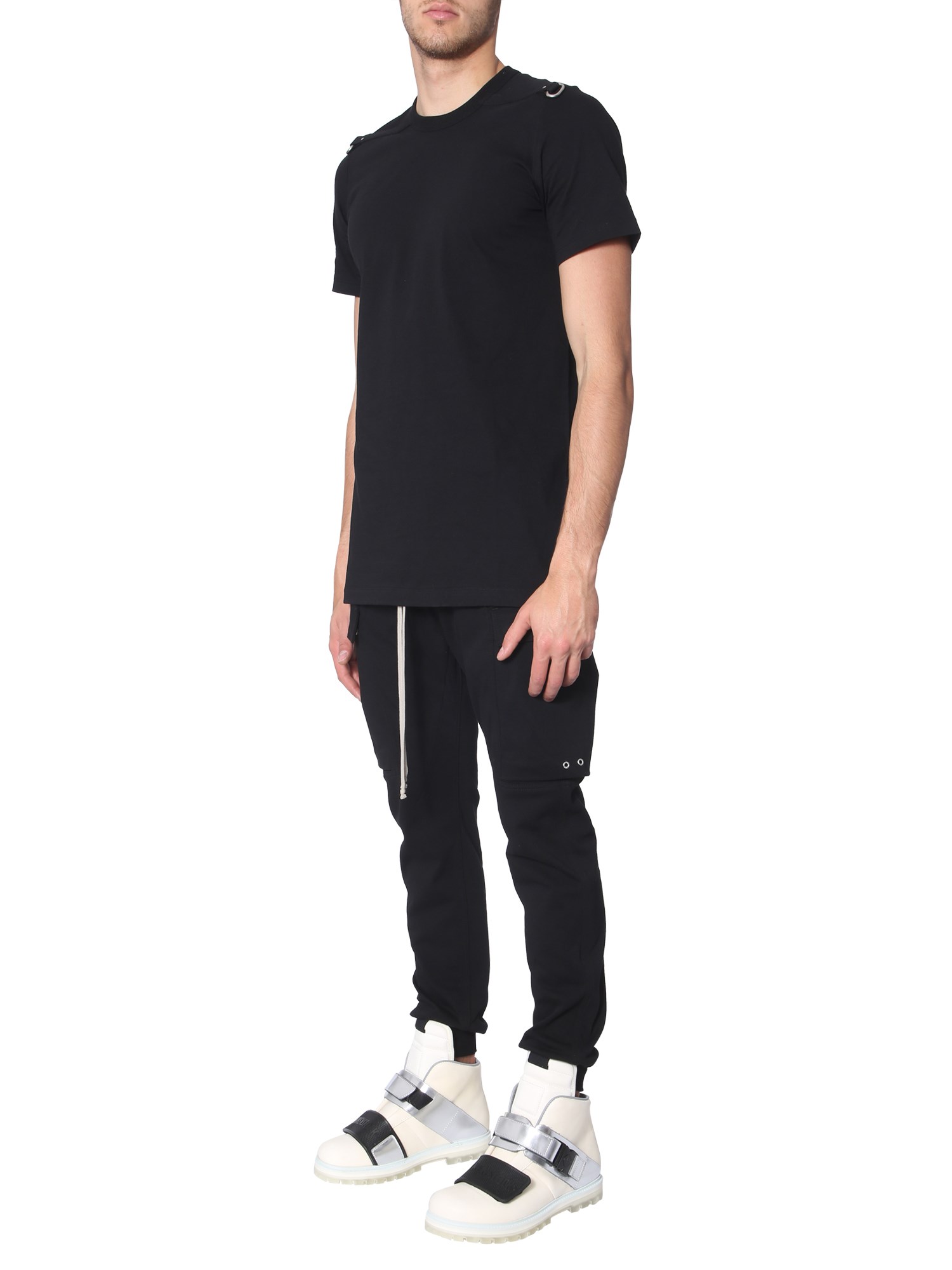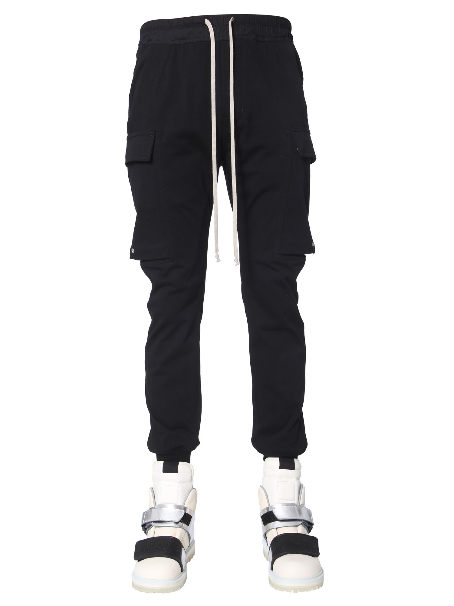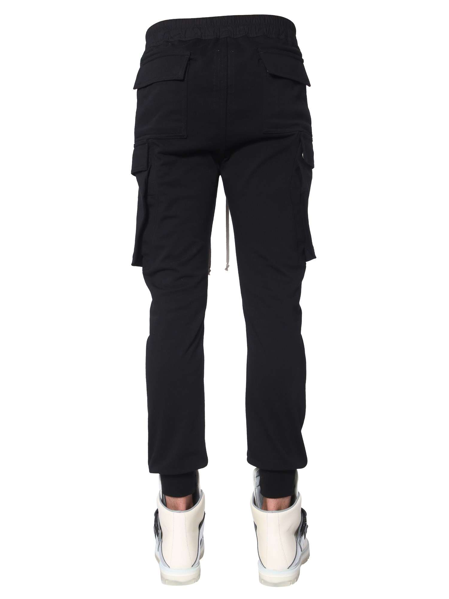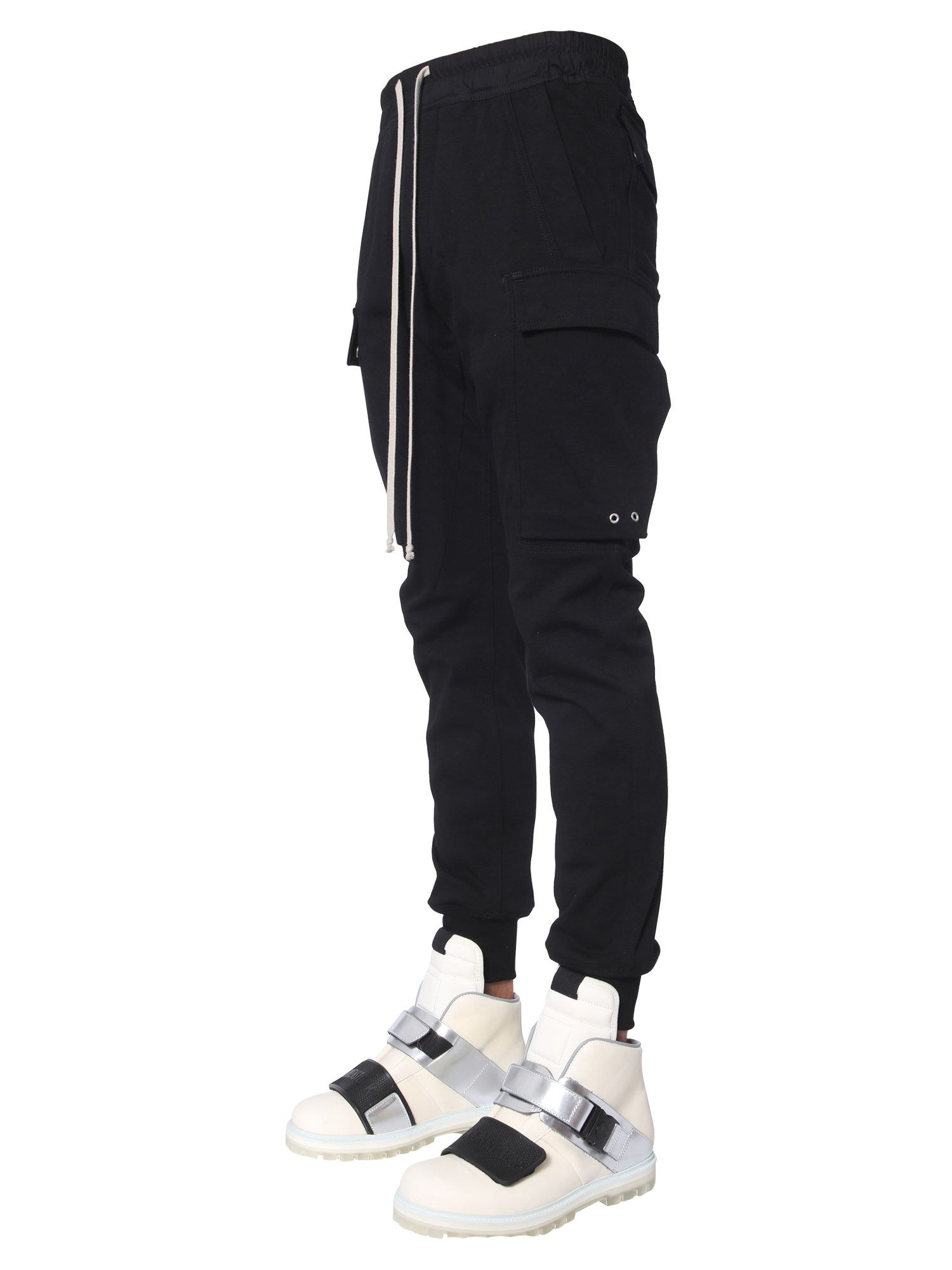 Excite your wardrobe with these jogger cargo pants from Rick Owens. These oversized-fit pants are tailored from good quality cotton that ensures breathability. The elastic waistband with coulisse closure provides the desired fit. They feature two side pockets with two cargo pockets for functionality. You can pair them with a plain black T-shirt for a complete look.