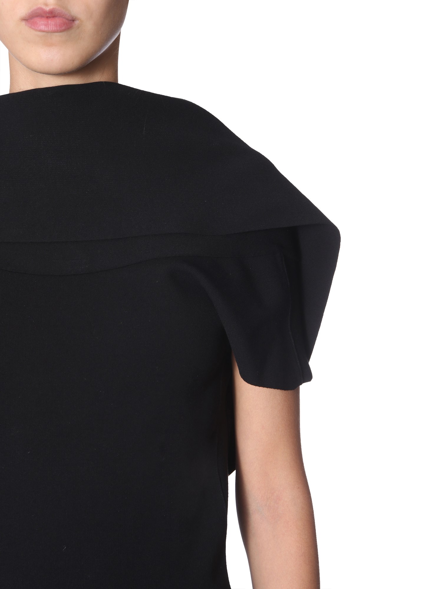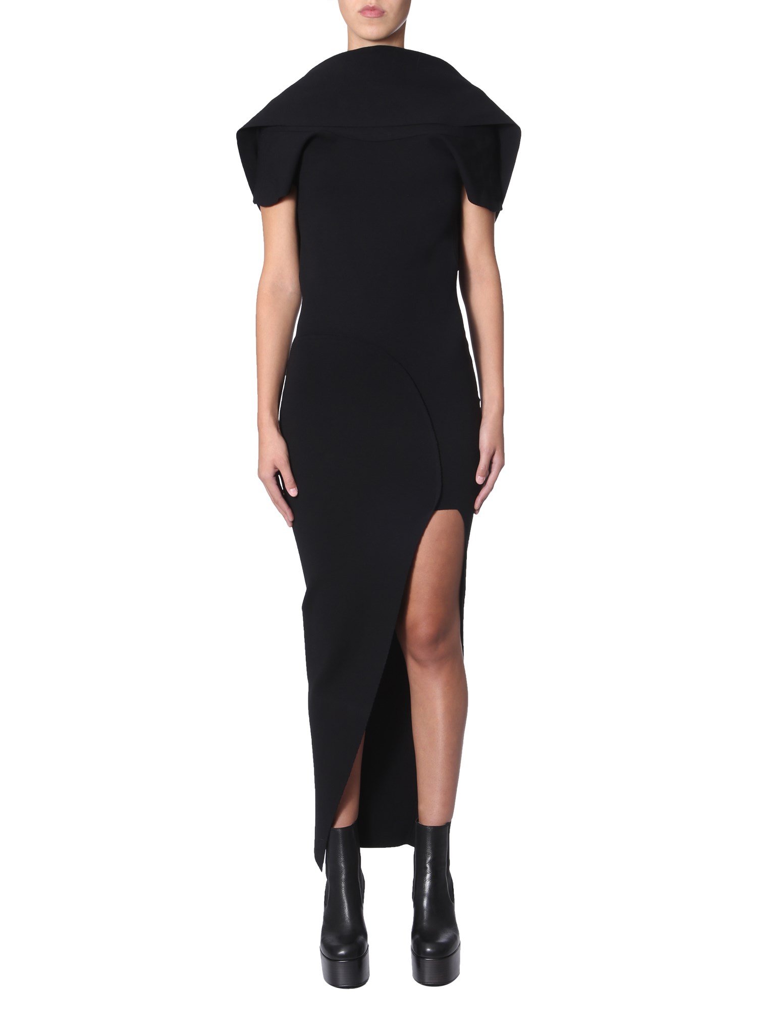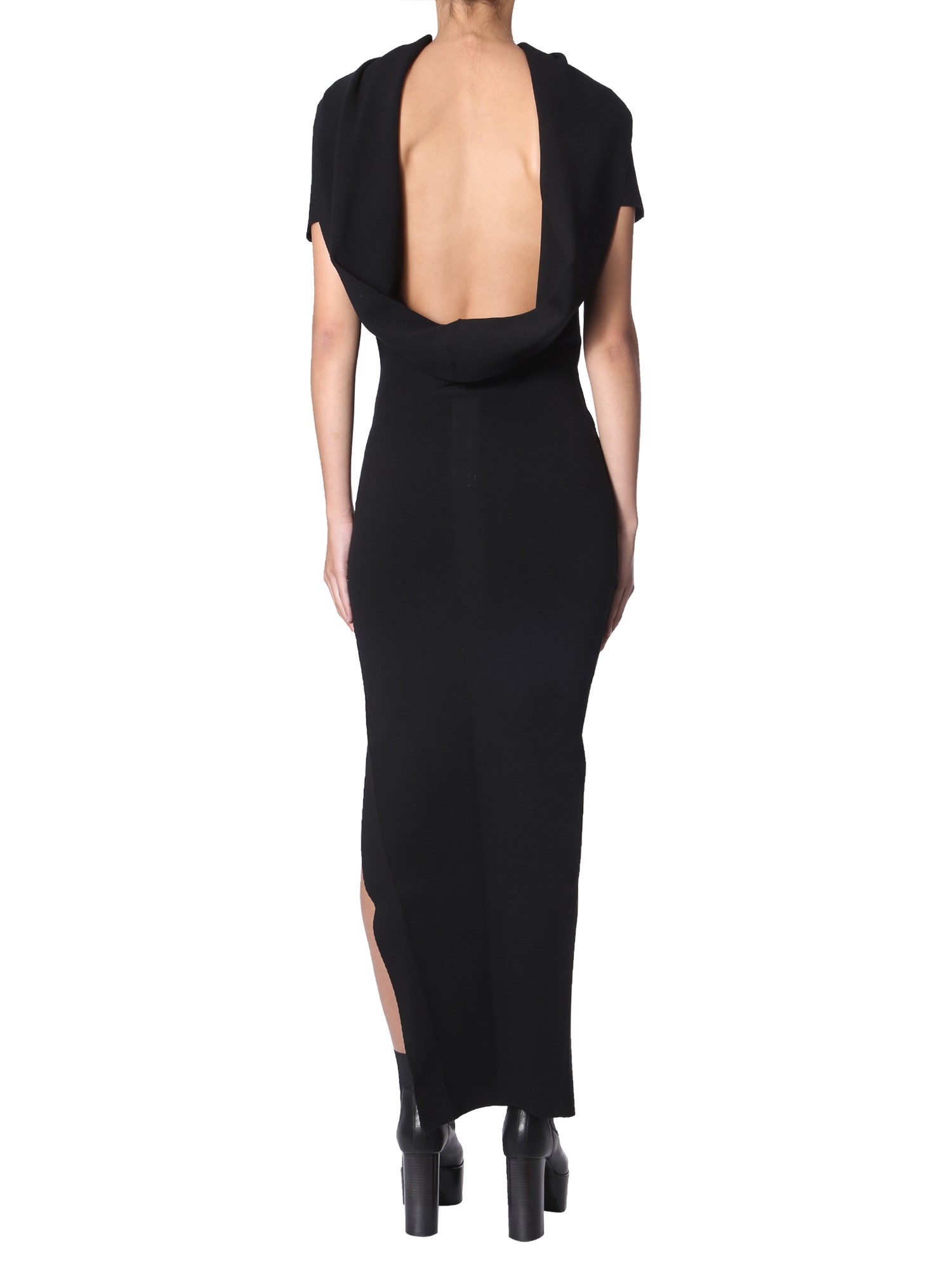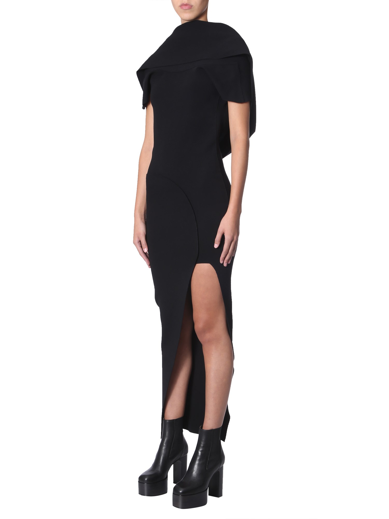 Look awesome wearing the Theresa Milan knitted-stitch dress from Rick Owens. This dashing dress is fabricated from a sturdy combination of viscose and polyester materials. The high, degreased neck at the front is complemented by deep-cut profiles in the skirt. Also, the falling neck at the back surfaces your shoulder blades beautifully.