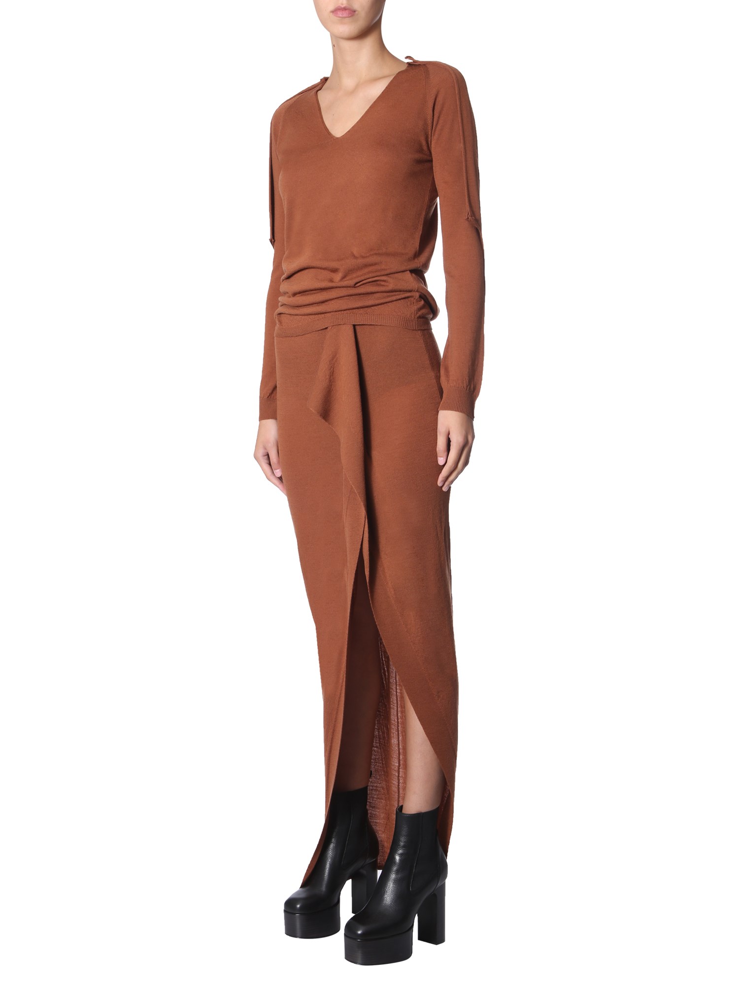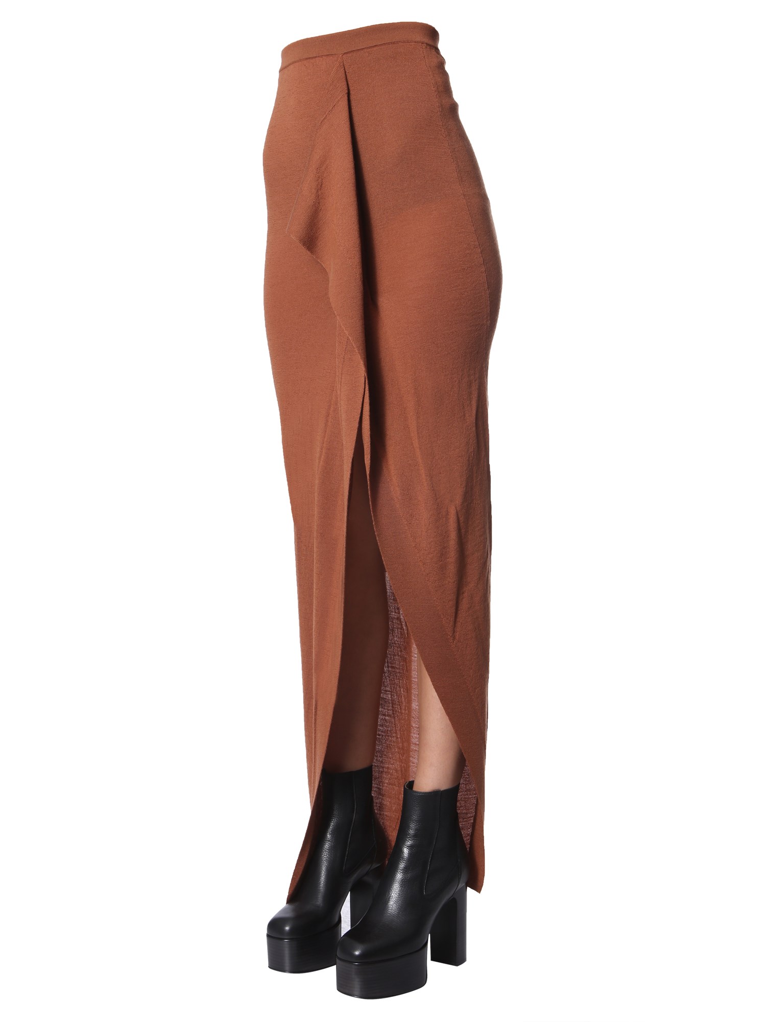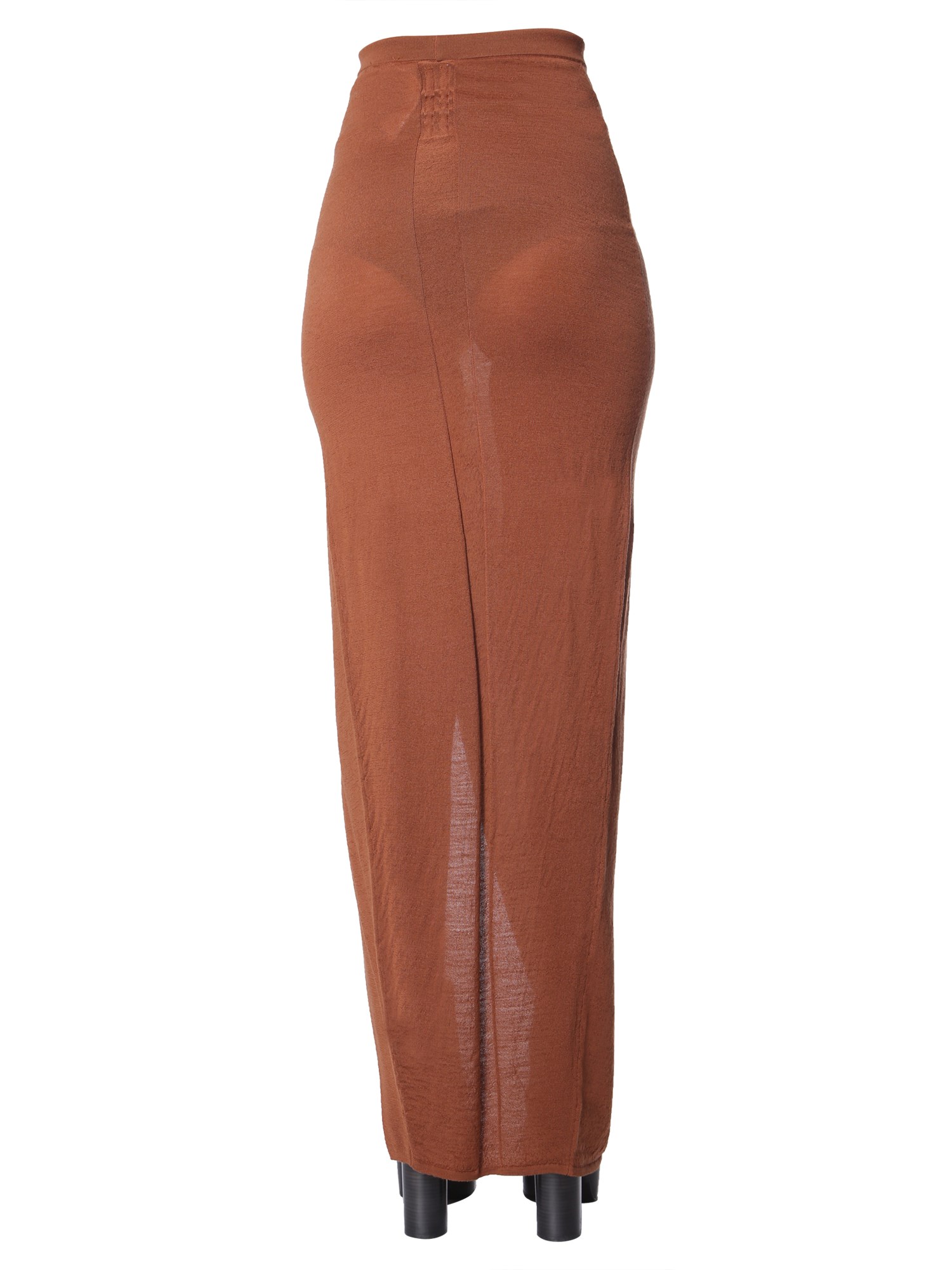 If you like styling an elegant appearance with knitted clothing, then go for this Rick Owens Grace long skirt. Slightly sheer and elasticated on the waist, this skirt is suitable to wear for all casual and informal occasions. The suspended end at the front exhibits a deep cut to present a disclosing look.