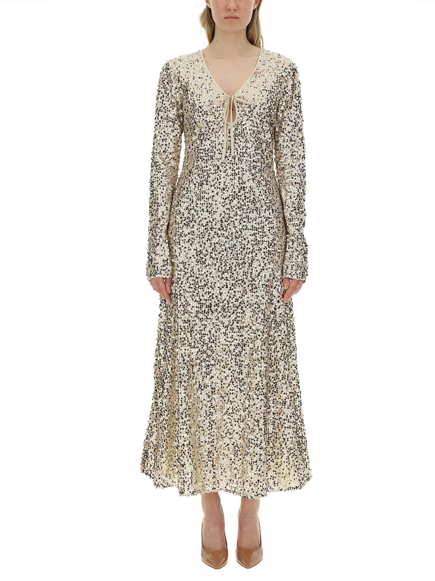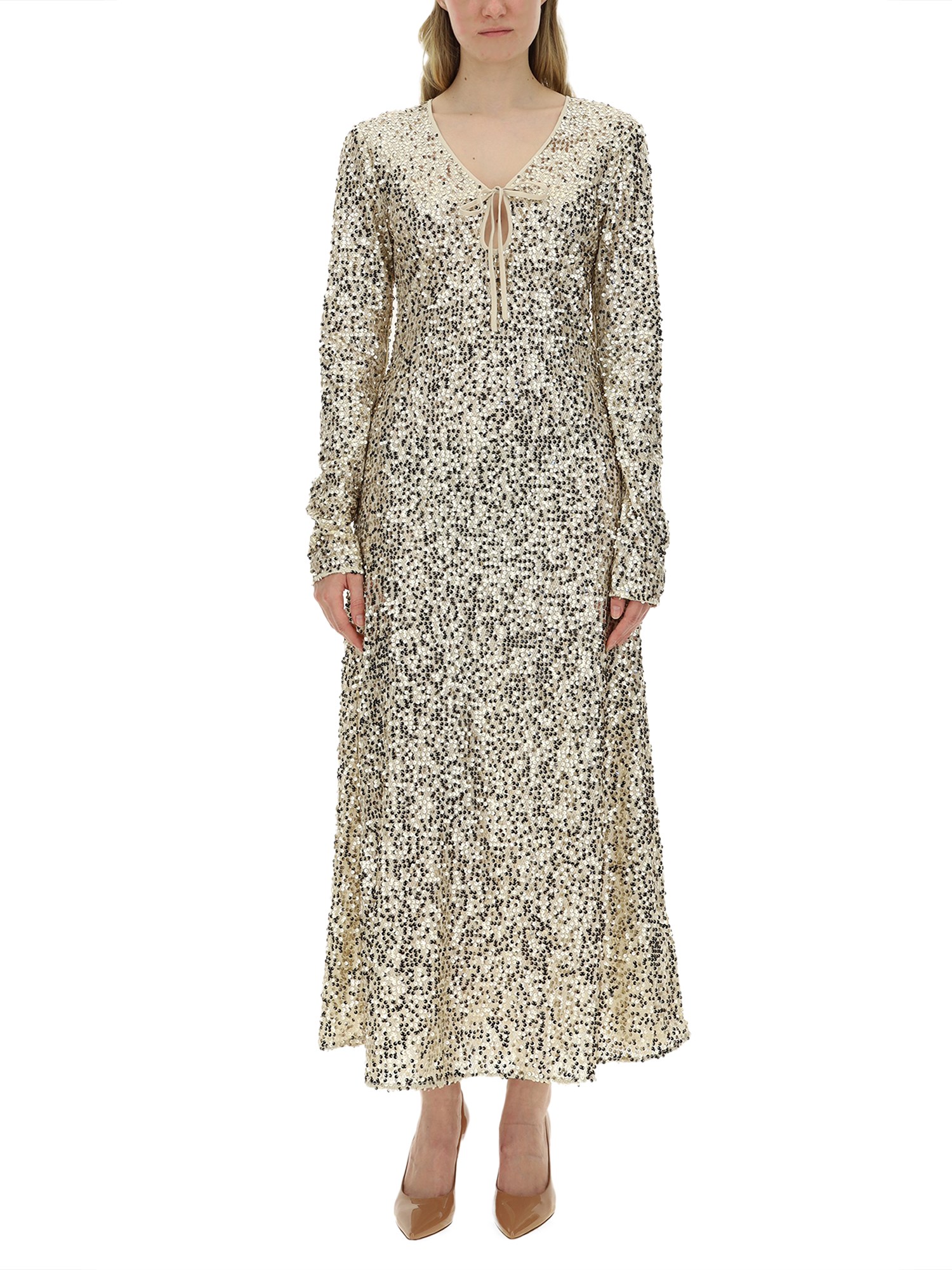 The sequined dress from Rotate Birger Christensen exudes elegance and glamour, making it a perfect choice for special occasions. Crafted with meticulous attention to detail, this dress features a stunning array of sequins that catch the light beautifully, enhancing its luxurious appeal. The flattering silhouette is designed to accentuate the figure, while the high-quality fabric ensures comfort and durability. Ideal for evening events or festive celebrations, this dress is a statement piece that will elevate any wardrobe.