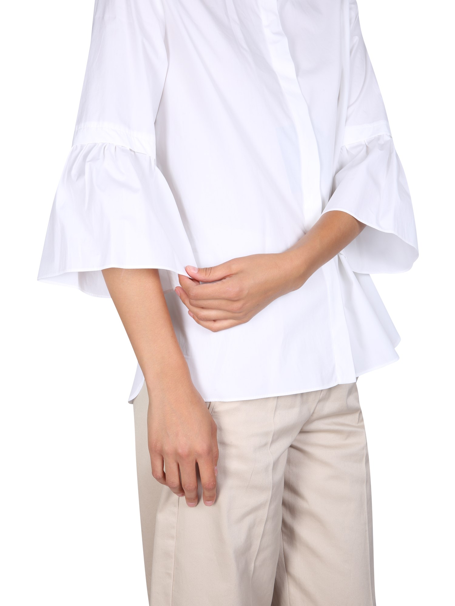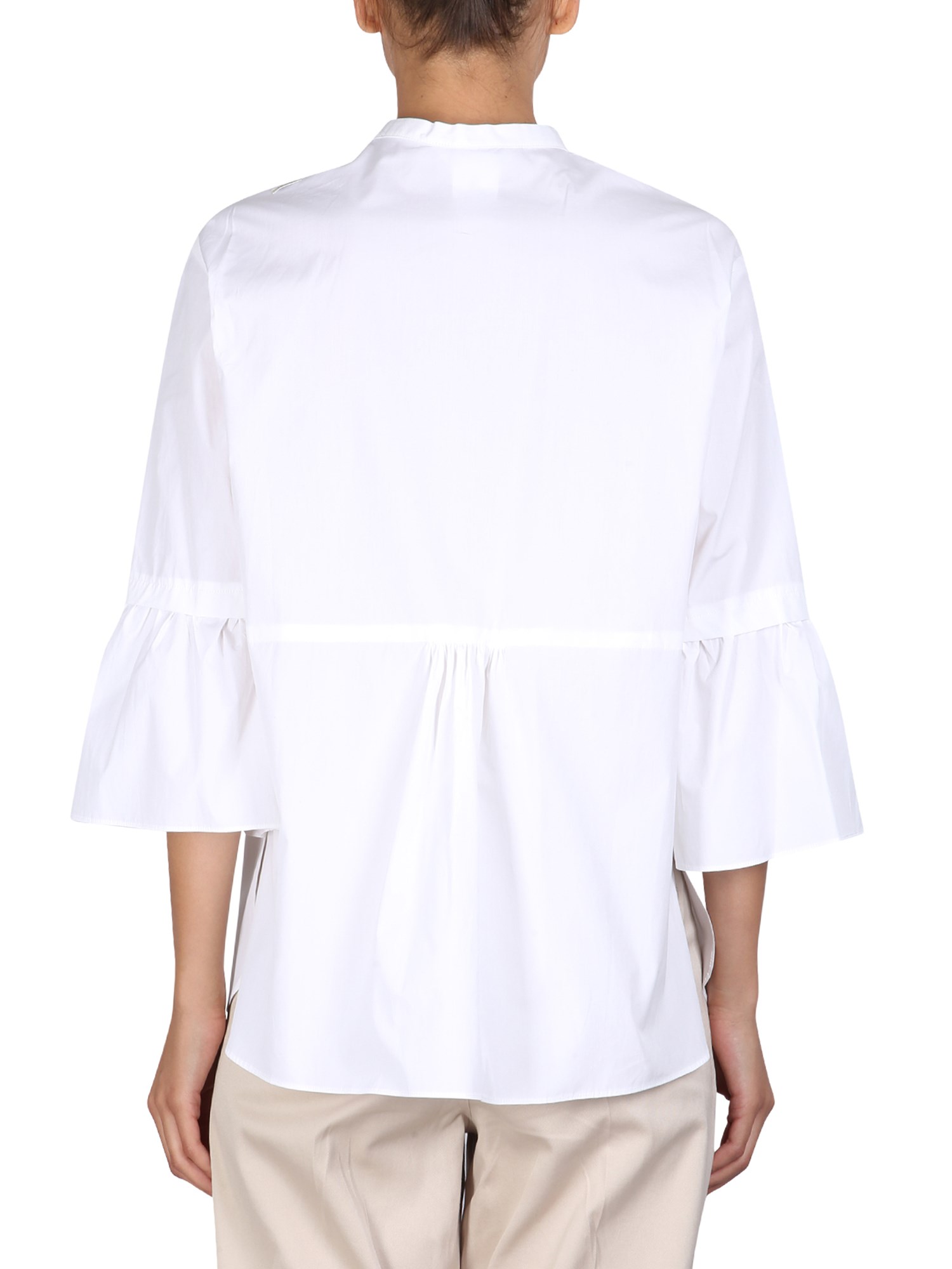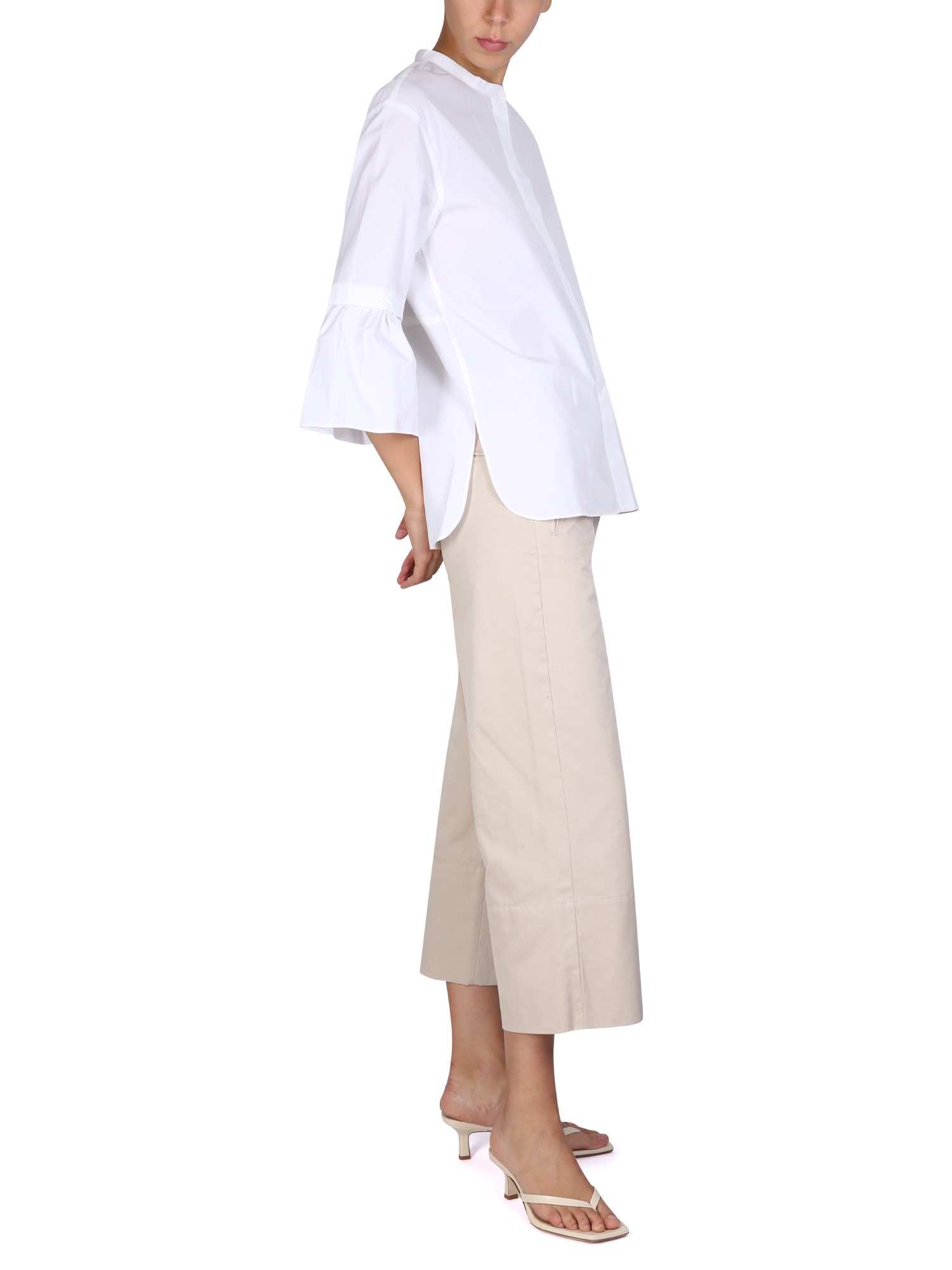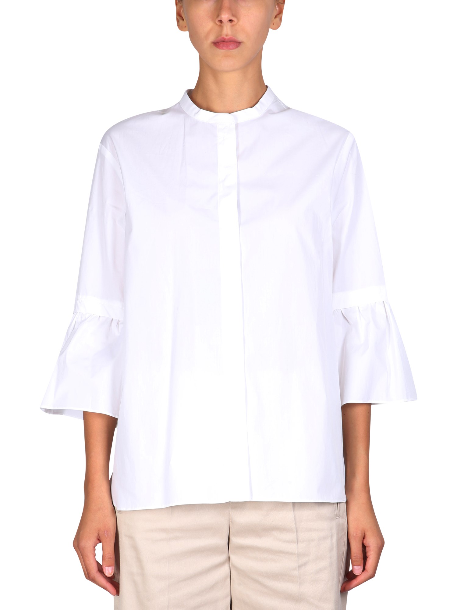 The cotton "Curvone" shirt from the house of S Max Mara is a staple of every wardrobe. It's made of 100% cotton and has a comfortable fit. The shirt has a Korean collar, long sleeves with elbow cuts, flared bottom, and front closure with hidden buttons. This is a shirt for people who like to be on the edge.