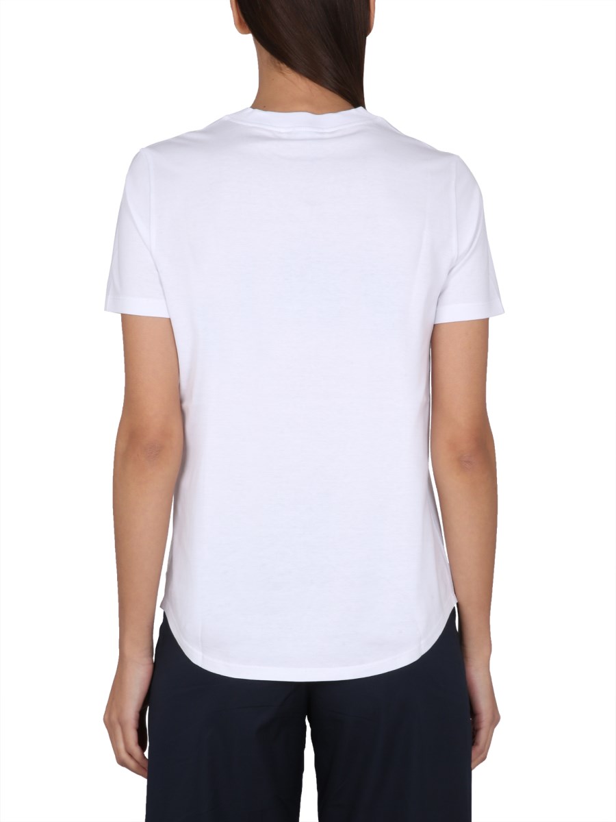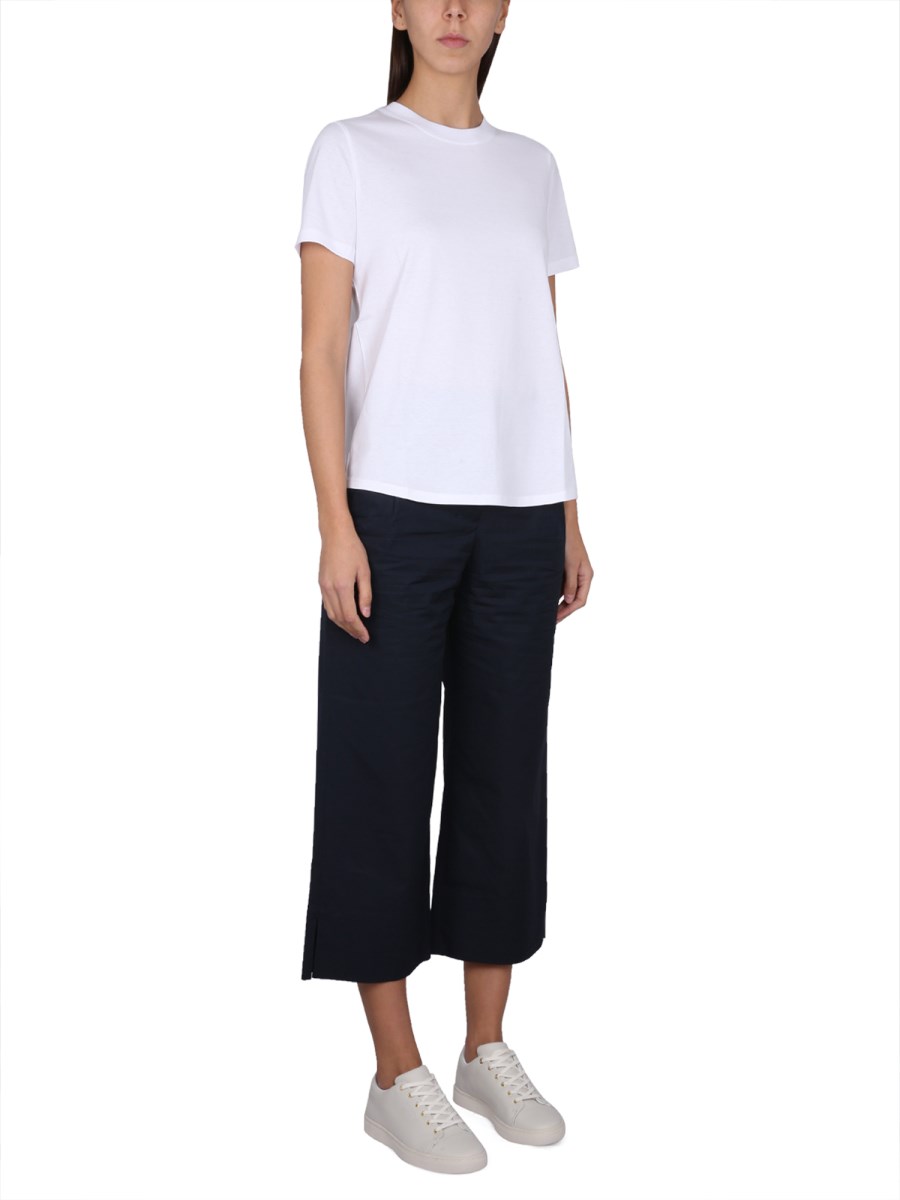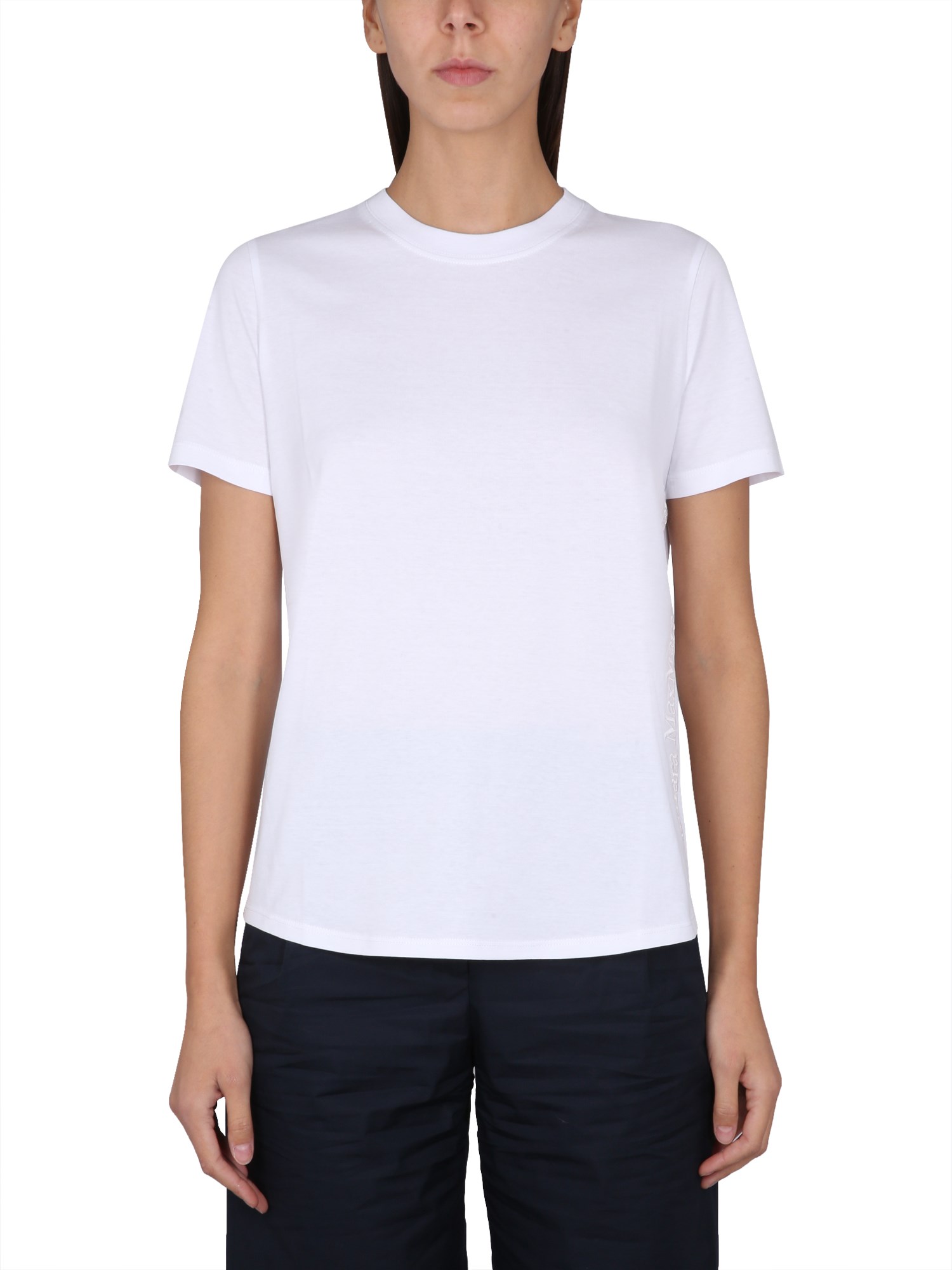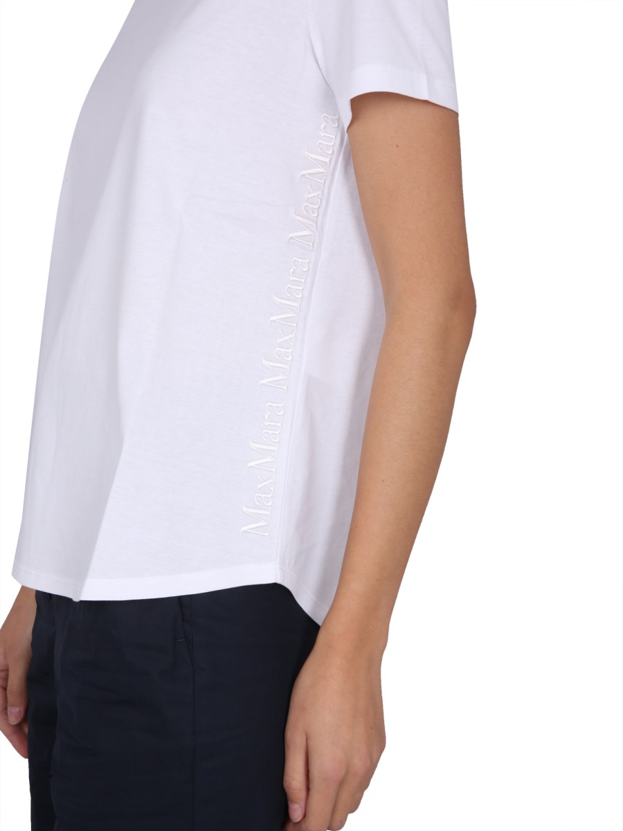The crew neck side logo embroidery cotton white T-shirt from S Max Mara is a perfect go-to shirt for any occasion. It is made of 100% cotton and is designed with a relaxed fit. It has a crew neck, a rounded hemline, and a front chest logo. This shirt is comfortable and perfect for a day in the sun or a night on the town.