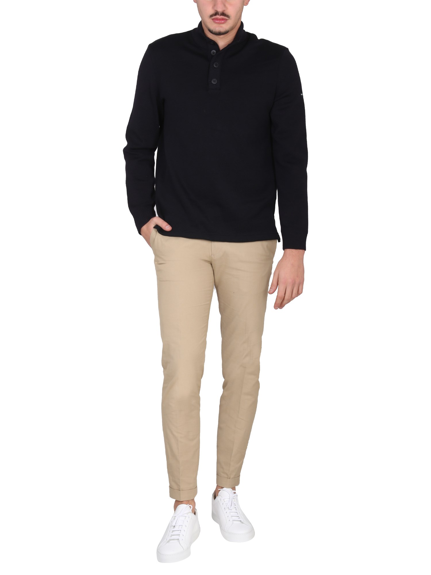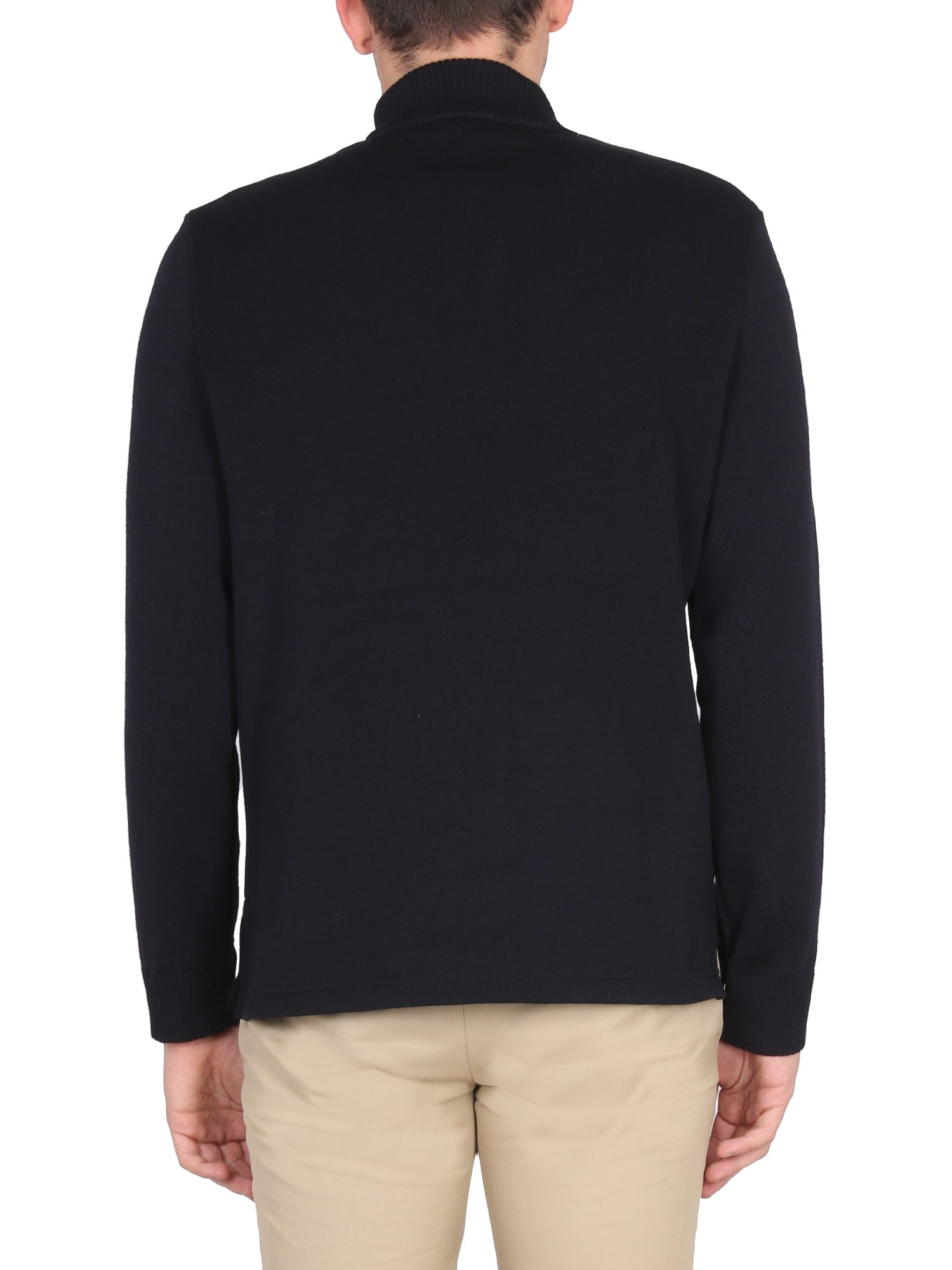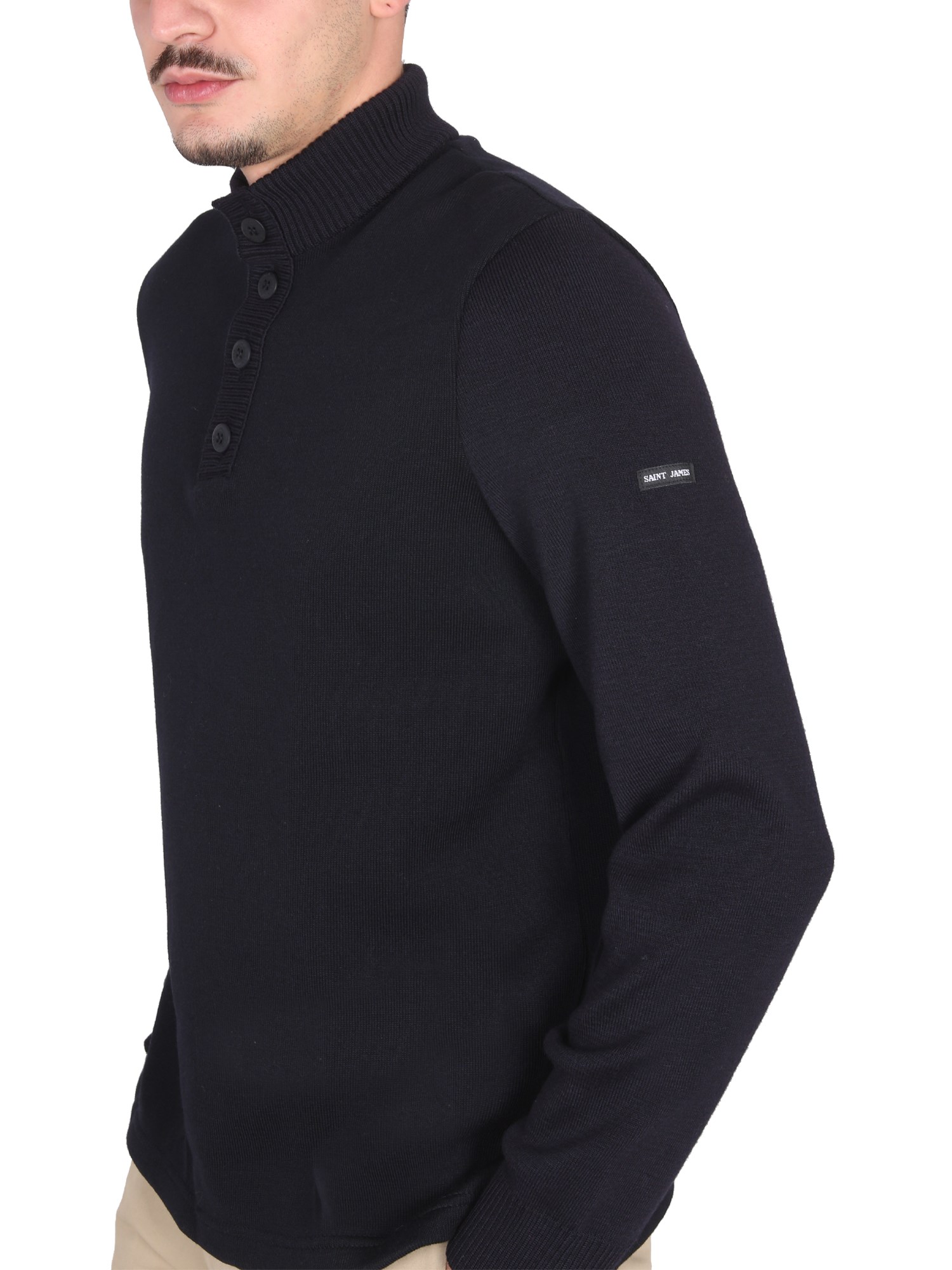 This stylish button-down sweater from Saint James is a perfect example of a timeless piece. It features a high collar, a wool turtleneck, and is covered in front with a ton of buttons. The buttons are placed in various places and can be undone to give you an open look.