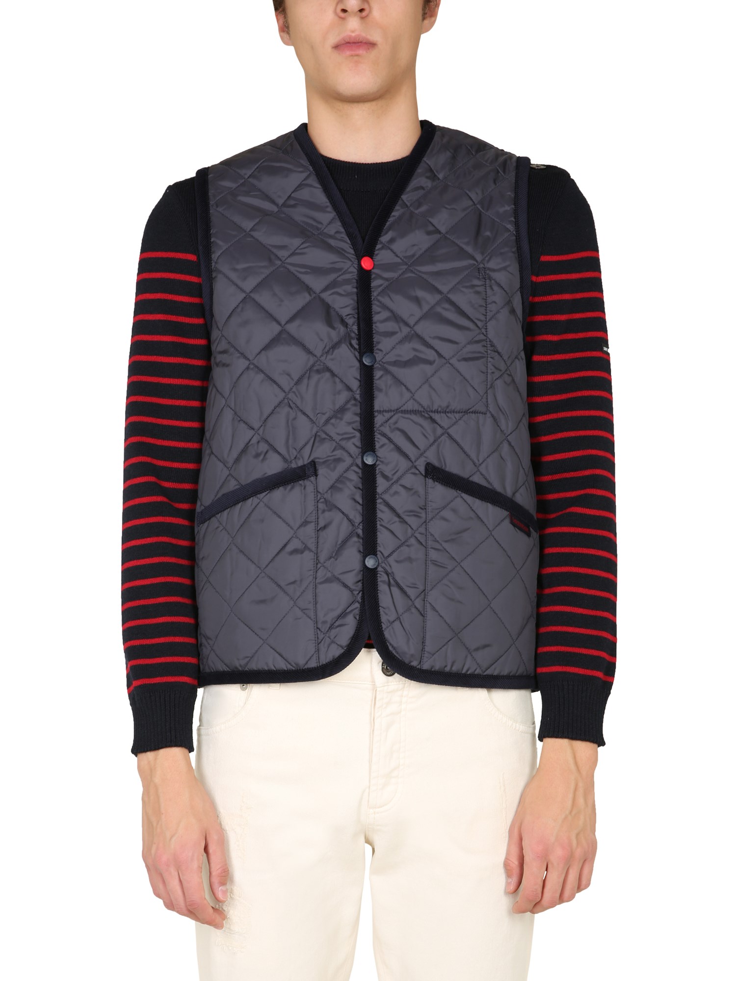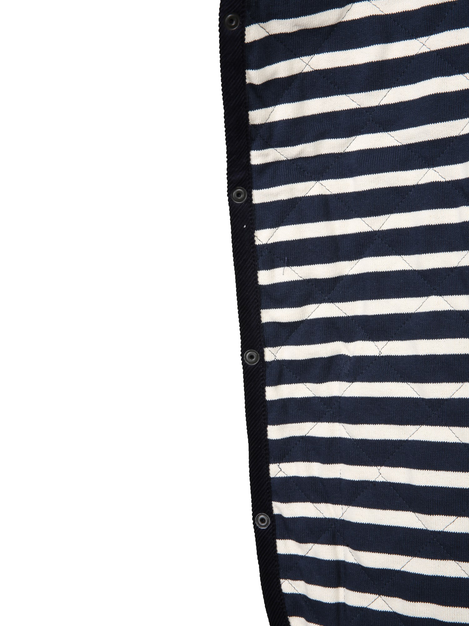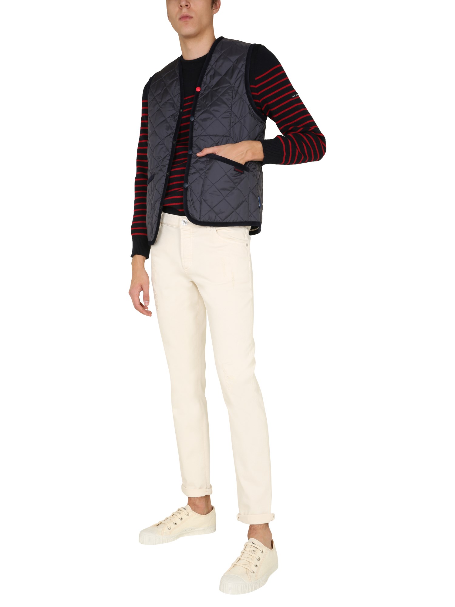 Make a stunning impression wherever you go and on whoever you meet when you wear this chic and voguish Dublin STJ Vest brought to you by the luxurious French brand of Saint James. This slim fit V-neck vest comes with a pressure button closure on the front. It has two side pockets and ribbed details with velvet. This poly-blend jacket has an inner lining and a striped motif, adding to its overall look.
