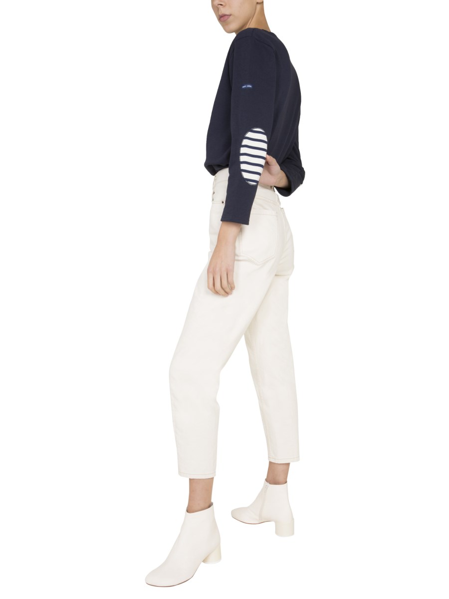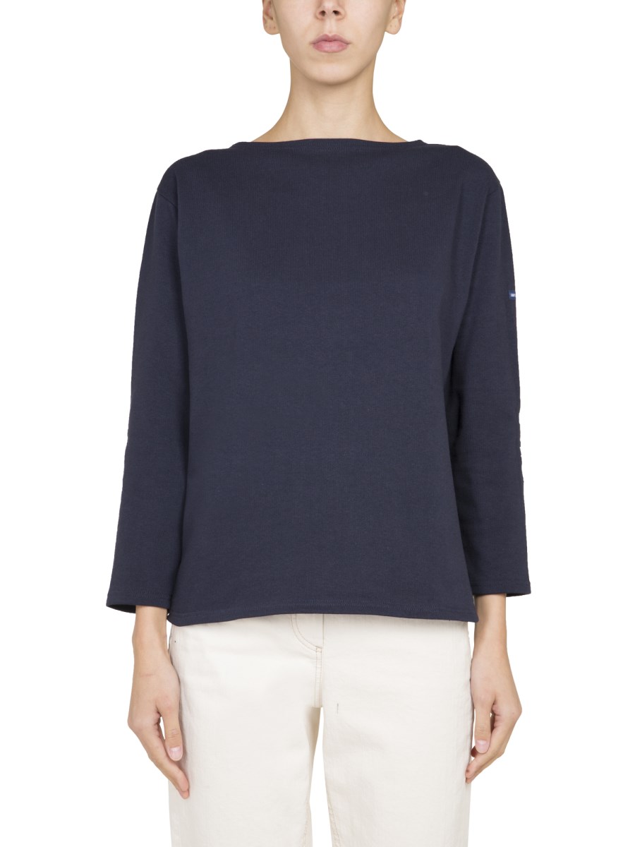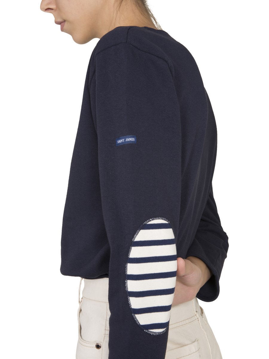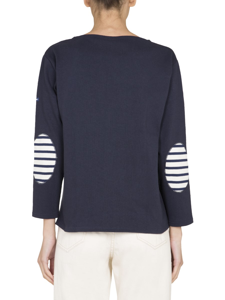 Add your charm to any party or gathering you go to wearing this stylish and trendy "Guildo U A" T-Shirt brought to you by the luxurious French brand of Saint James. This T-Shirt has a classic boat neck cut with long sleeves. It has the brand logo on the sleeve along with patches featuring a striped pattern. This slim fit T-shirt is made with 100% cotton fabric and is great for all occasions.
