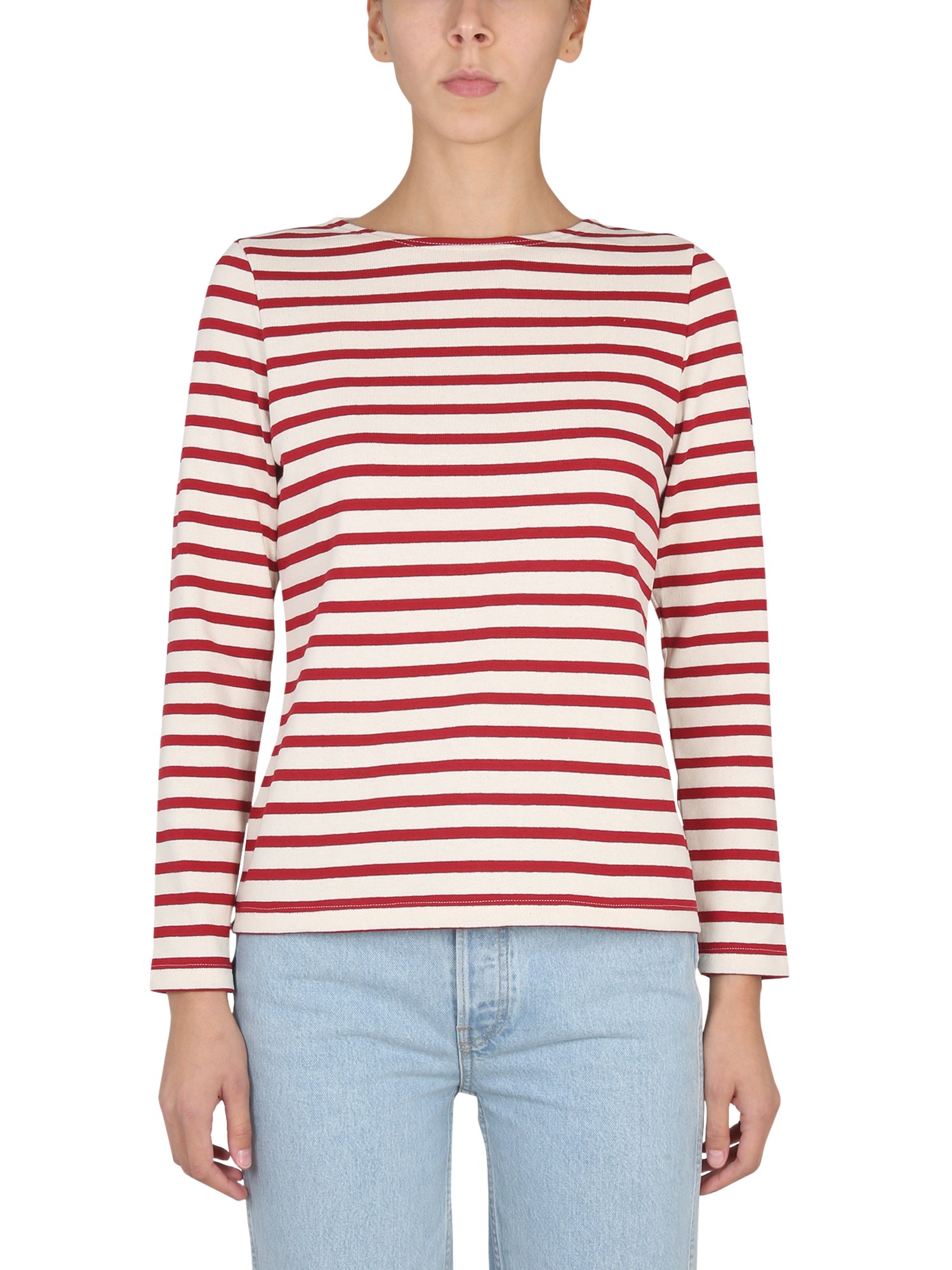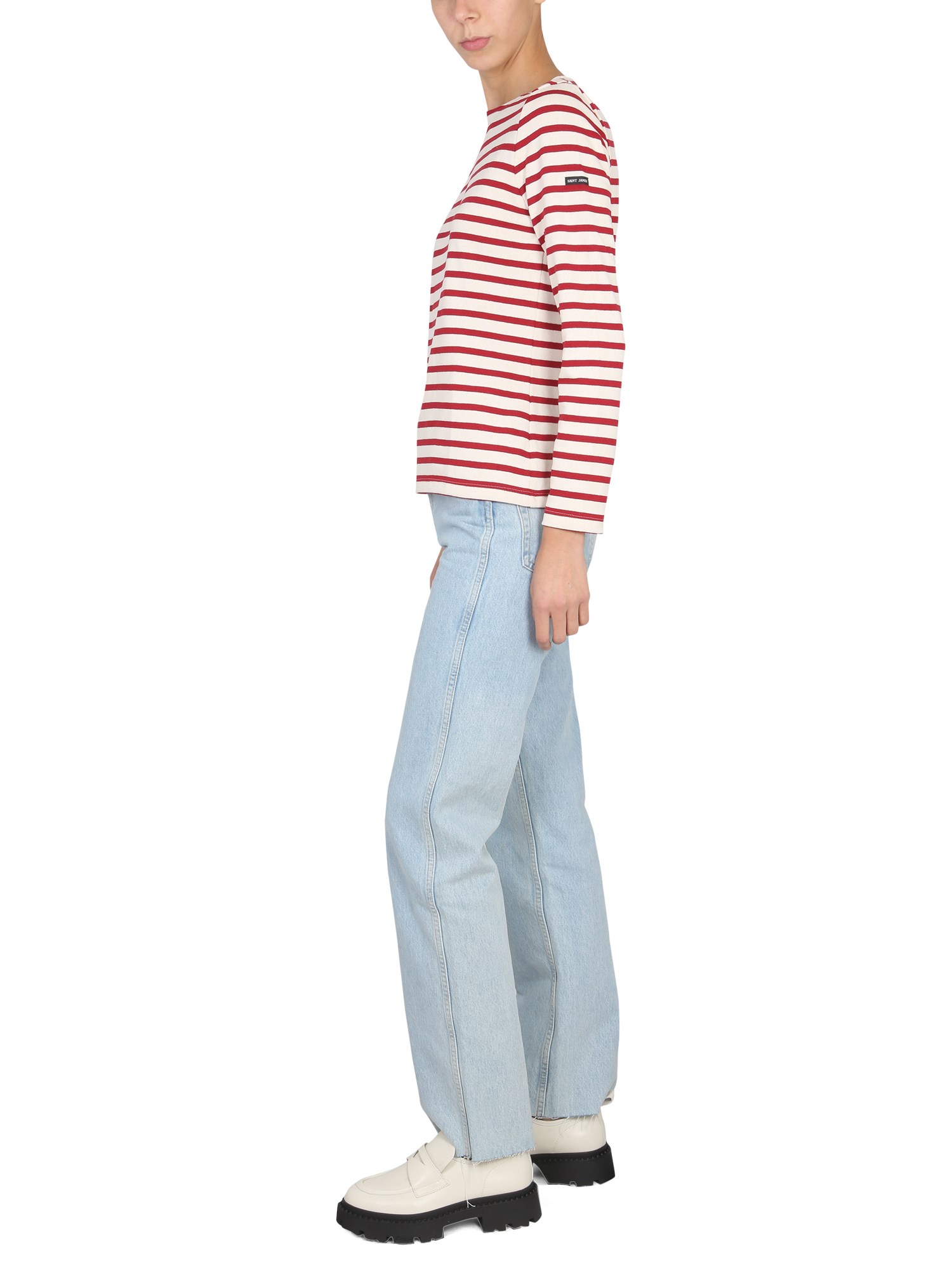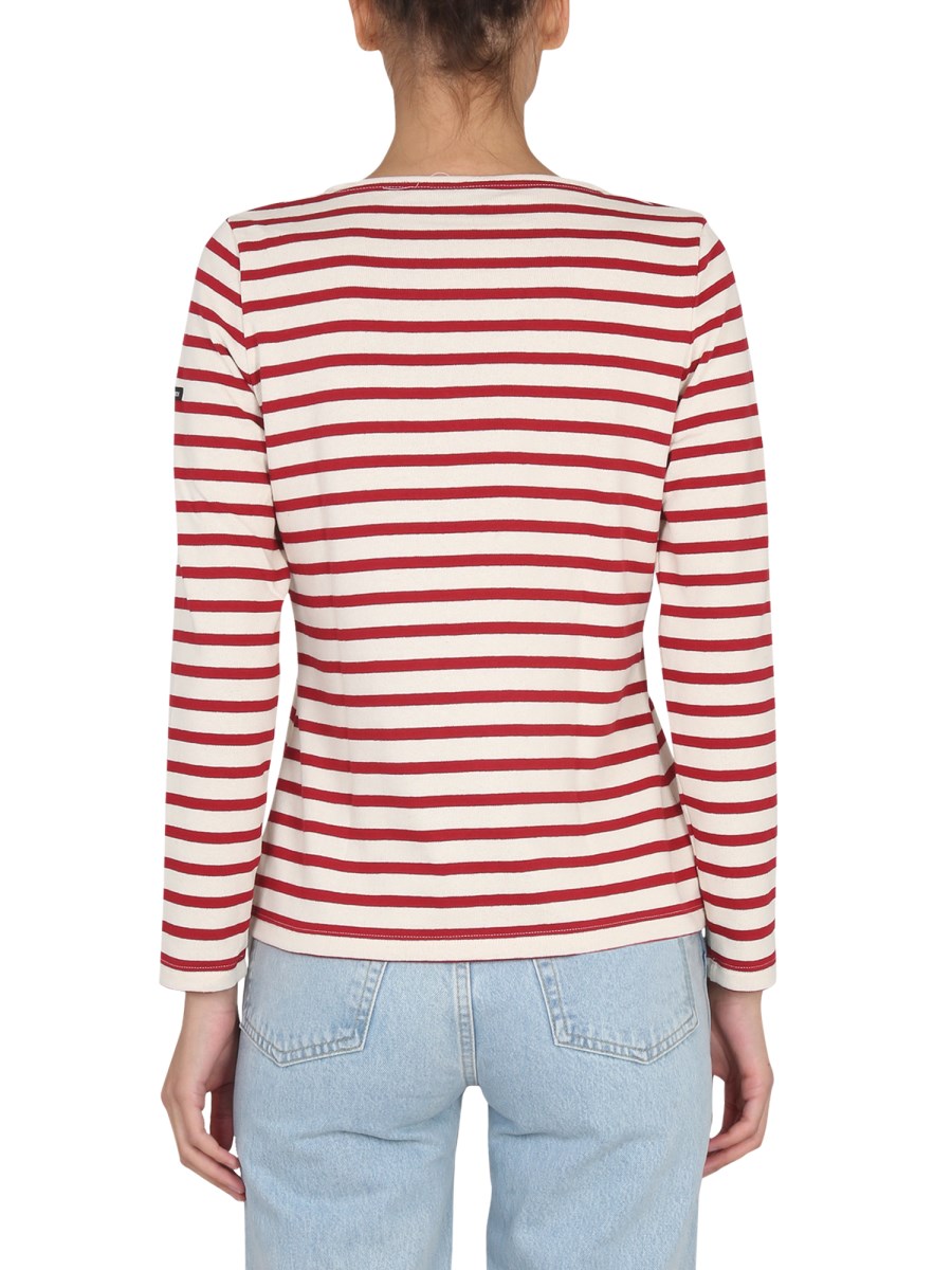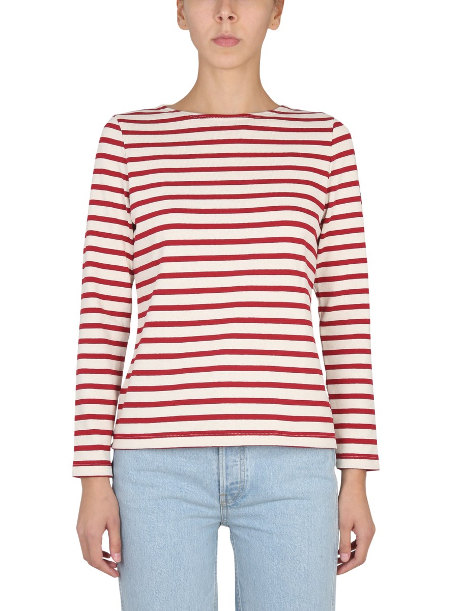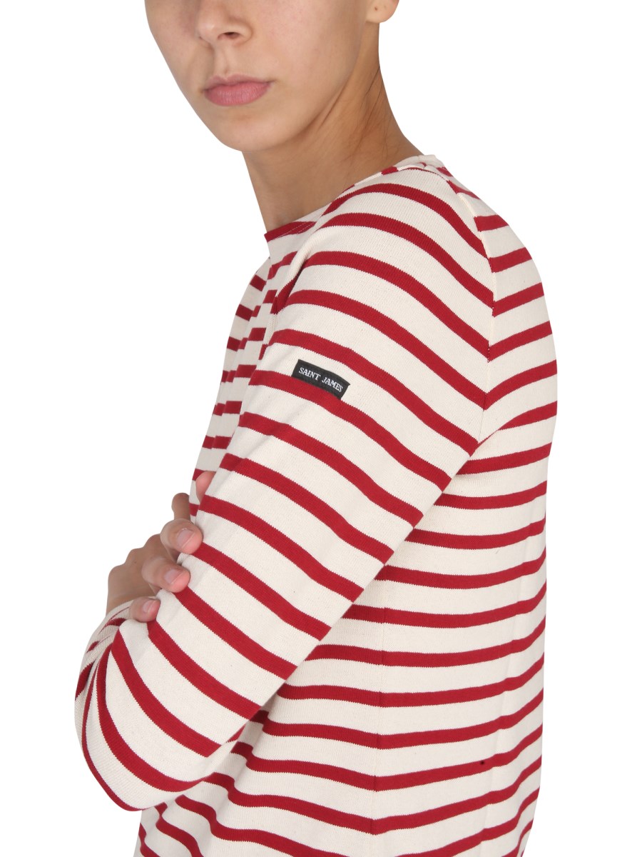 A white T-shirt from Saint James with an all-over striped pattern, this basic is a versatile wardrobe staple that can be worn with anything from jeans to a skirt. It's made from a cotton material, and is decorated with a red striped pattern. The material is soft and comfortable and is meant to be worn as a casual shirt.