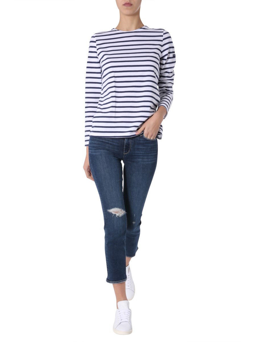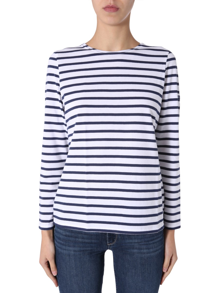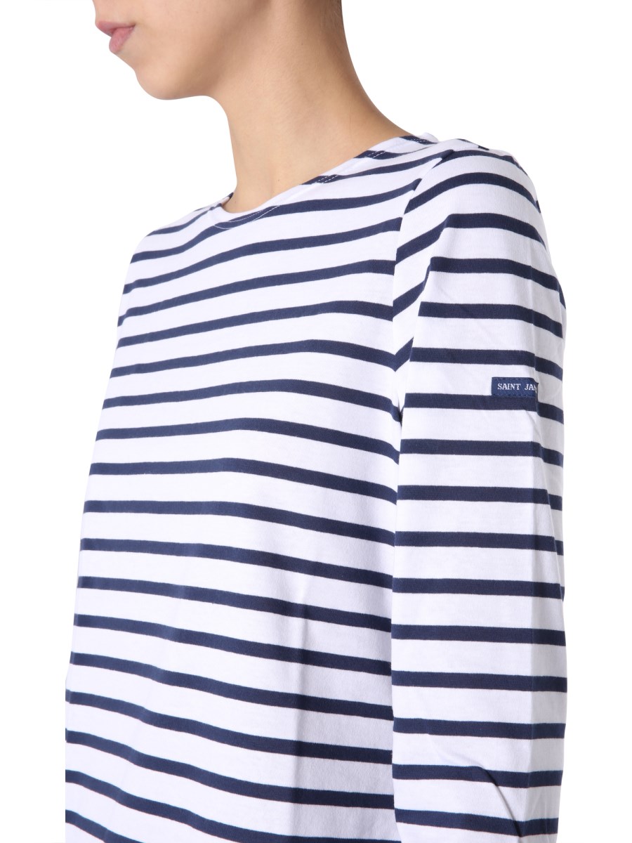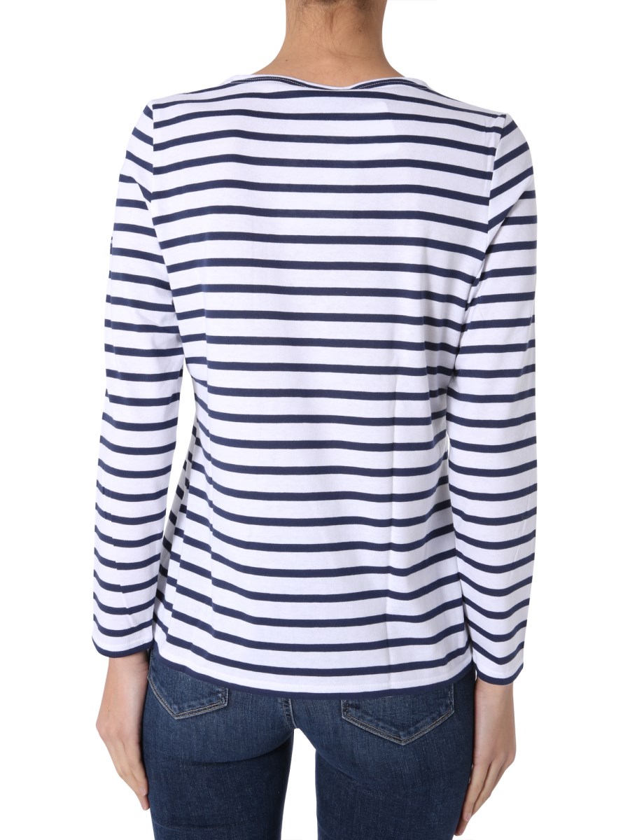 This T-shirt from Saint James is the perfect piece to wear for an upcoming summer day. This striped shirt is a long sleeve and features a boat neckline with regular fit. It is made from 100% cotton and features a black and white striped pattern. It is made of 100% cotton, making it a durable and breathable fabric.