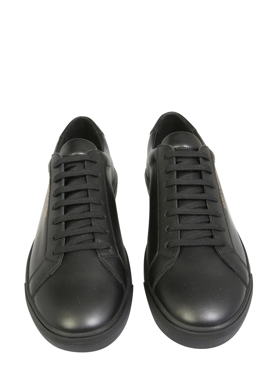 Keep your style on point in the throwback silhouette of the Andy leather sneakers from the house of Saint Laurent. The casual lace-up shoes with soft leather uppers for an excellent fit and feel. It has a rubber outsole that delivers traction and a great look. The padded leather insole offers comfort and durability. The back tongue of the sneakers is adorned with logo detailing.