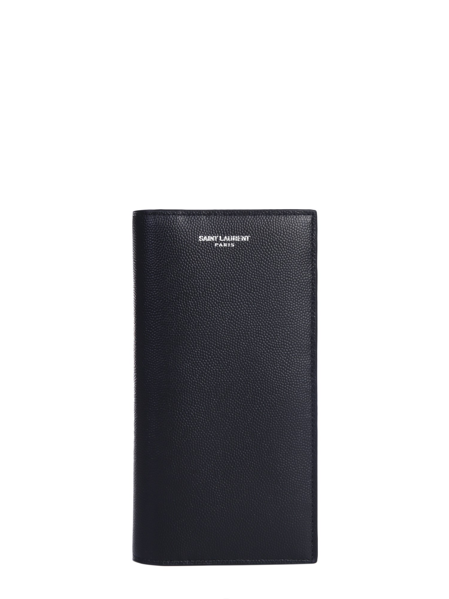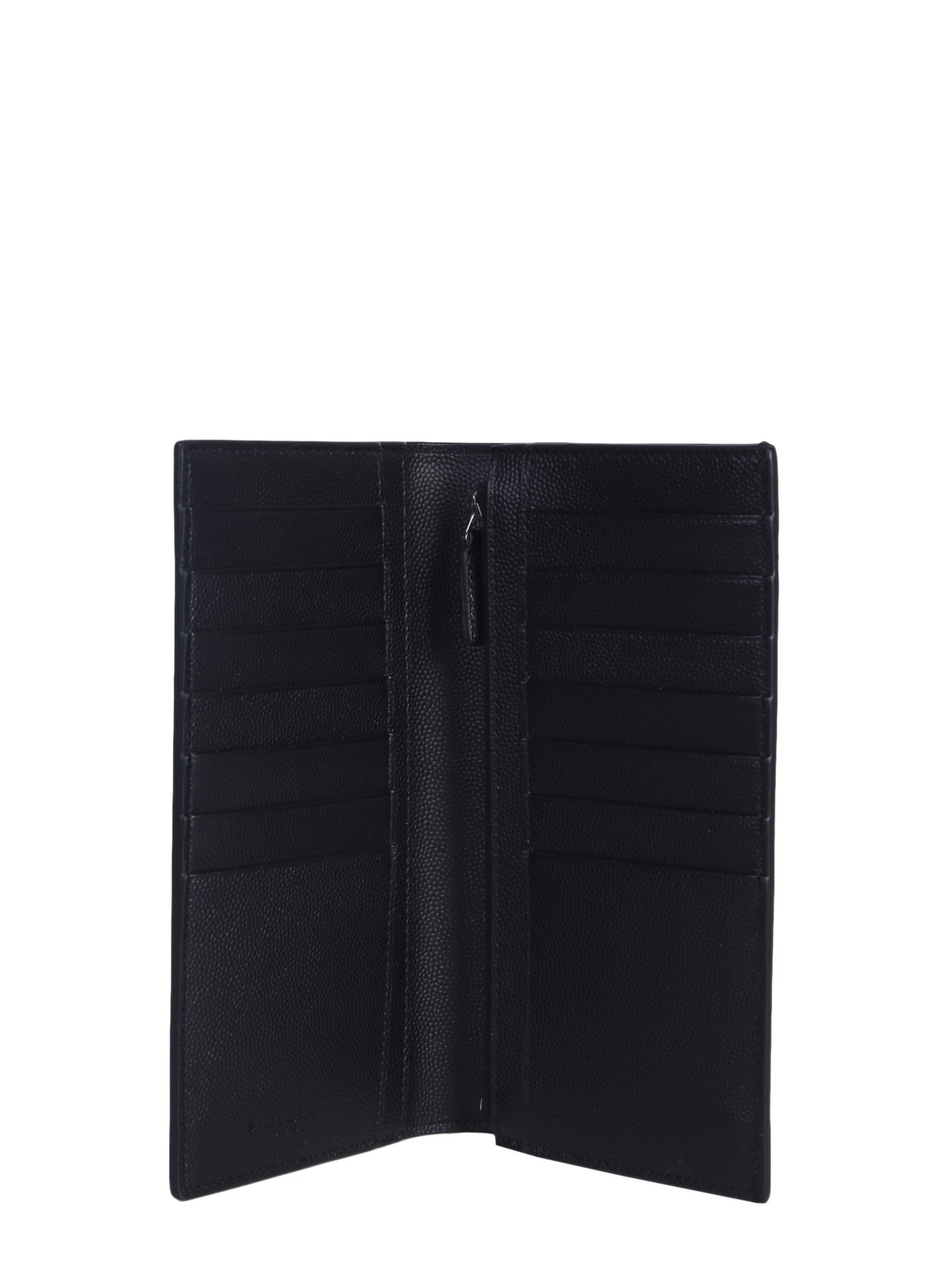 Carry your monetary essentials safely in this Saint Laurent classic Paris continental wallet. The wallet has a grainy surface with a passport-like closure. The calf leather manufacture not just makes it durable but also gives it a nice and smart appeal. It has fourteen credit card compartments, four compartments for banknotes and documents and one inner zip pocket.