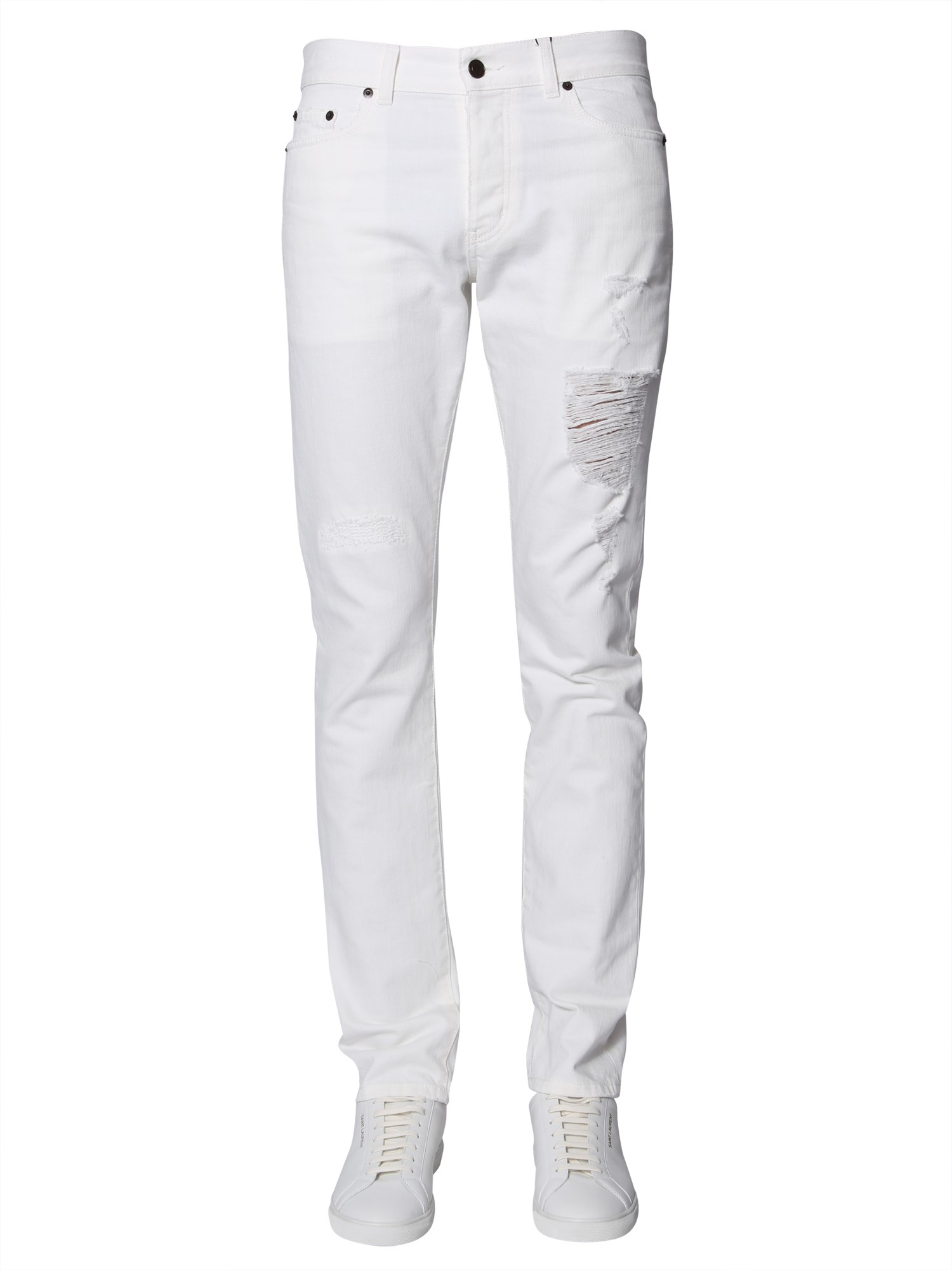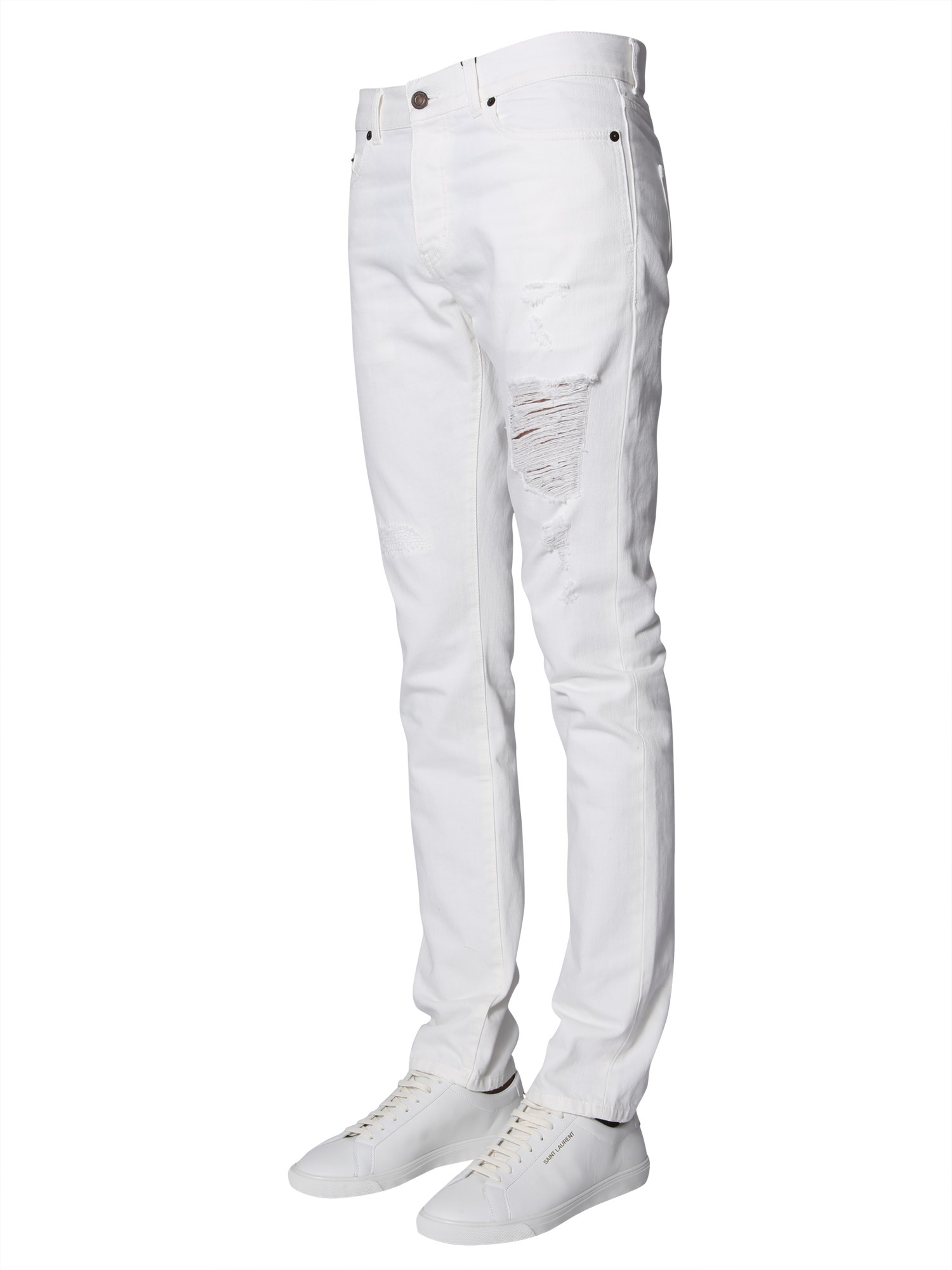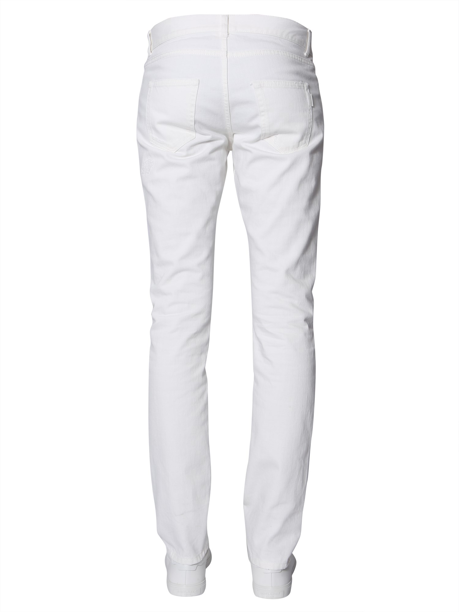 These slim-fit trousers from Saint Laurent has a monochromatic finish that is highlighted with random frayed and ripped details. Made with cotton, the trousers are as comfortable as they are trendy. Their low waist style is in line with the latest fashion trend, while multiple front and back pockets offer functionality.